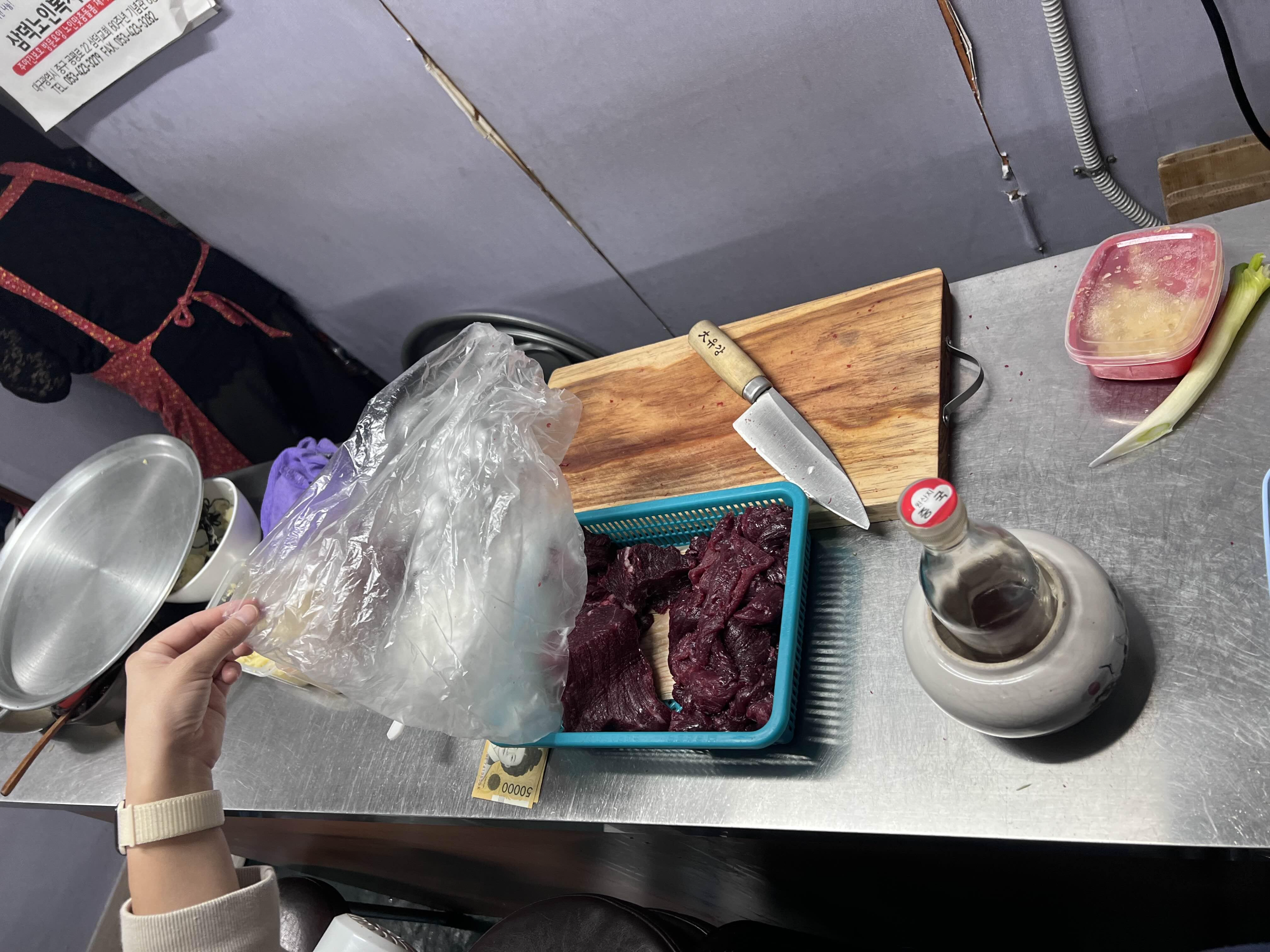 뭉티기 한접시에 45,000원입니다. 한접시에 뭉티기가 착 붙어서 한접시가 나오는데 양은 그렇게 많지 않아보입니다. 음식을 기다리면서 사장님과 이런저런 이야기를 많이 나누었는데 연세가 많으시기도 하고 허리가 안좋으셔서 복대를 하고 일을 하셨습니다. 혼자서 일하시기에 너무 힘이 드시다고 하셨어요. ㅠ 뭐라도 도와드리려고 술이나 간단한 것은 제가 냉장고에서 꺼내먹었어요. 저 말고도 다른 팀들도 왠만하면 냉장고에서 직접 꺼내드셨습니다. 뭉티기를 먹을 수 있음에 감사할 뿐이었습니다.