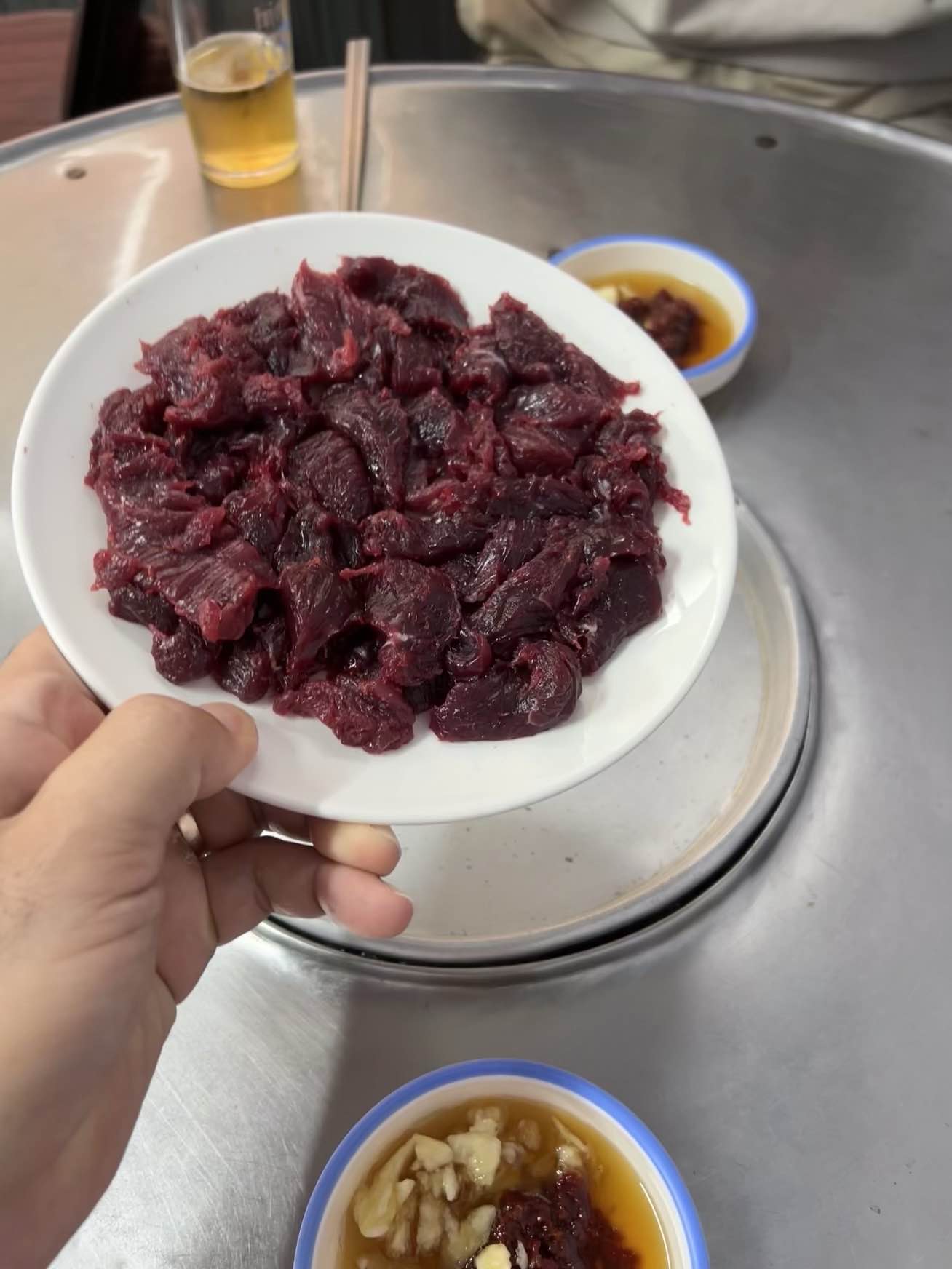 뭉티기 사진입니다. 뭉티기는 엄청 쫀득해서 접시를 뒤집어도 떨어지지 않아요. 저도 궁금해서 한번 해봤는데 정말 접시에서 착 붙어서 떨어지지 않더라고요. 그만큼 쫀득쫀득하다는 소리겠죠. 사진 찍고 바로 먹어보기 시작했습니다. 다른 기본 반찬은 많지 않습니다. 고추장+참기름+마늘을 넣은 장이 나오는데 뭉티기를 찍어먹으면 아주 맛있어요.