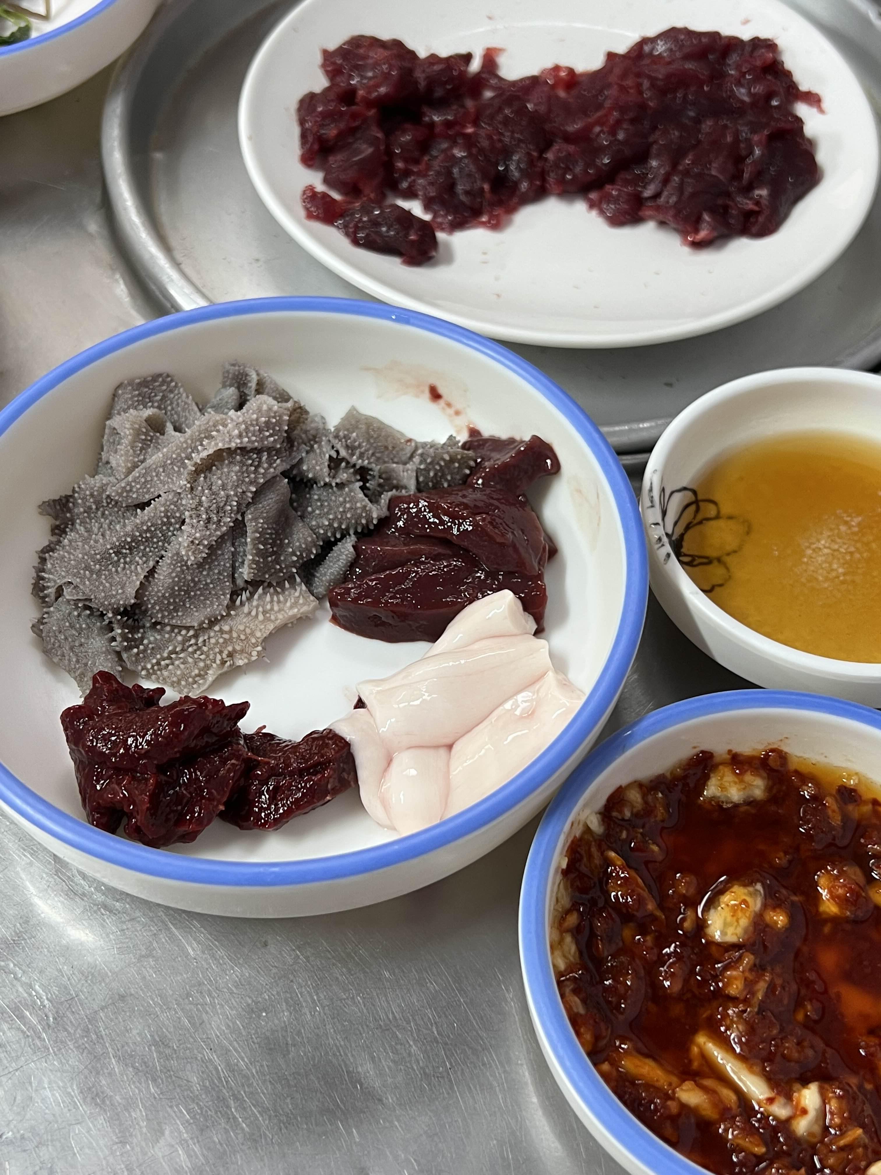그리고 간이랑 천엽도 주셨고, 하얗게 생긴 것도 주셨는데 부위 이름이 기억이 안나네요. 서울에서는 내주지 않는 부위고 대구에서만 볼 수 있는 부위라고 하네요. 그래서 맛 보았는데 약간 담백하고 진득한 식감입니다. 맛이 강하게 나지는 않아요. 간과 천엽 모두 신선하고 맛있었어요. 여기서 먹으니까 더 맛있었던 것 같아요. 먹고 더 달라고 해서 더 먹었습니다. 기본 반찬도 2-3개 나오는데 제가 찍은 게 없네요. ㅠㅠ먹느라 정신 없었나봅니다.....