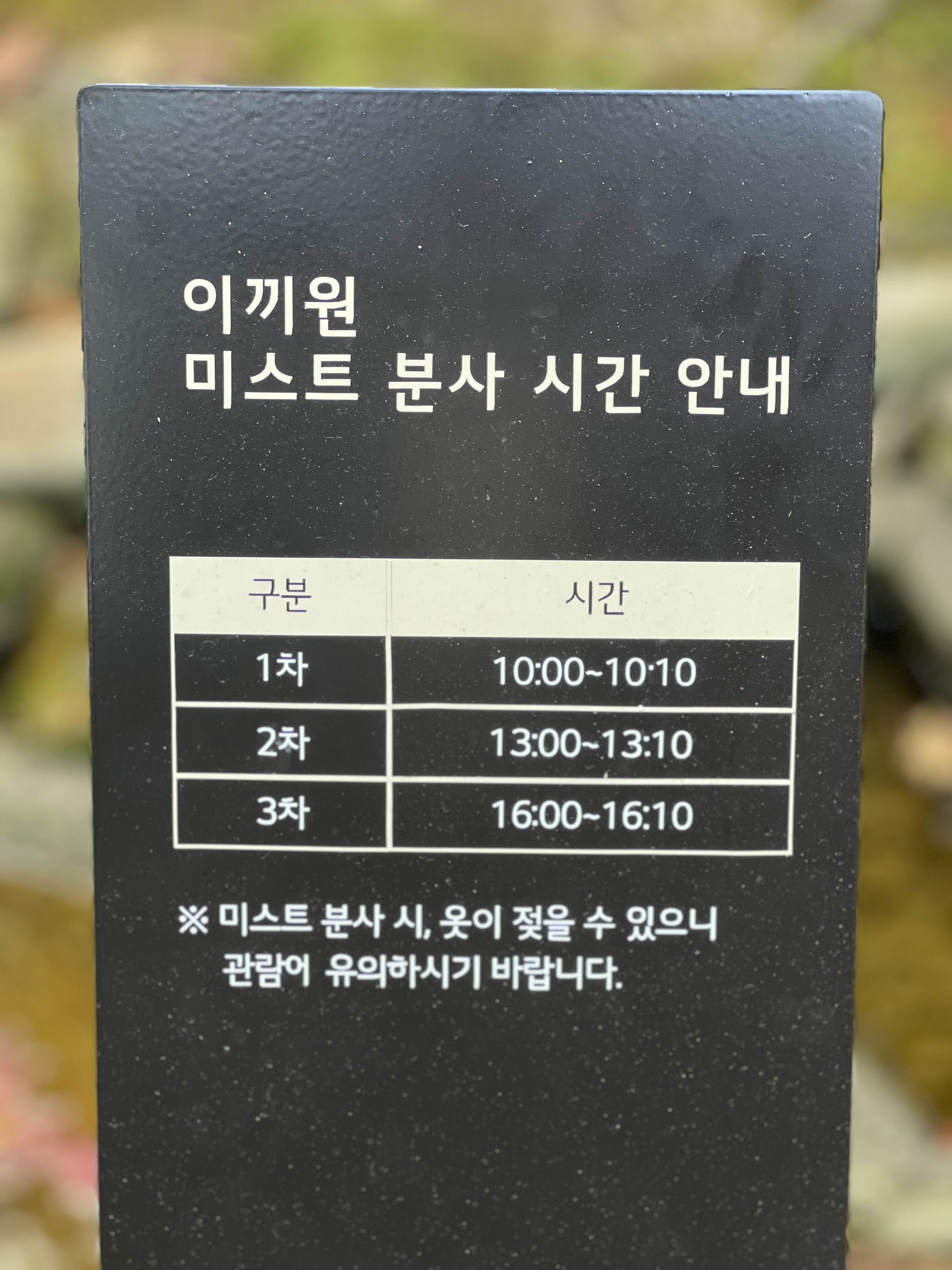 이끼원에는 30여 종의 이끼가 식재되어 있다고 해요. 이끼가 있어서 그런지 숲 속에 와 있는 느낌이 들더라고요. 다른 곳도 다 멋진데 이끼원도 저는 너무 좋았습니다. 미스트 분사도 시간에 따라서 분사가 되나 봐요. 제가 4시가 되었을 때 궁금해서 봤는데 미스트는 안 나오고 바람만 나왔어요. 아마 계절에 따라서 분사량도 다른 것 같아요.
