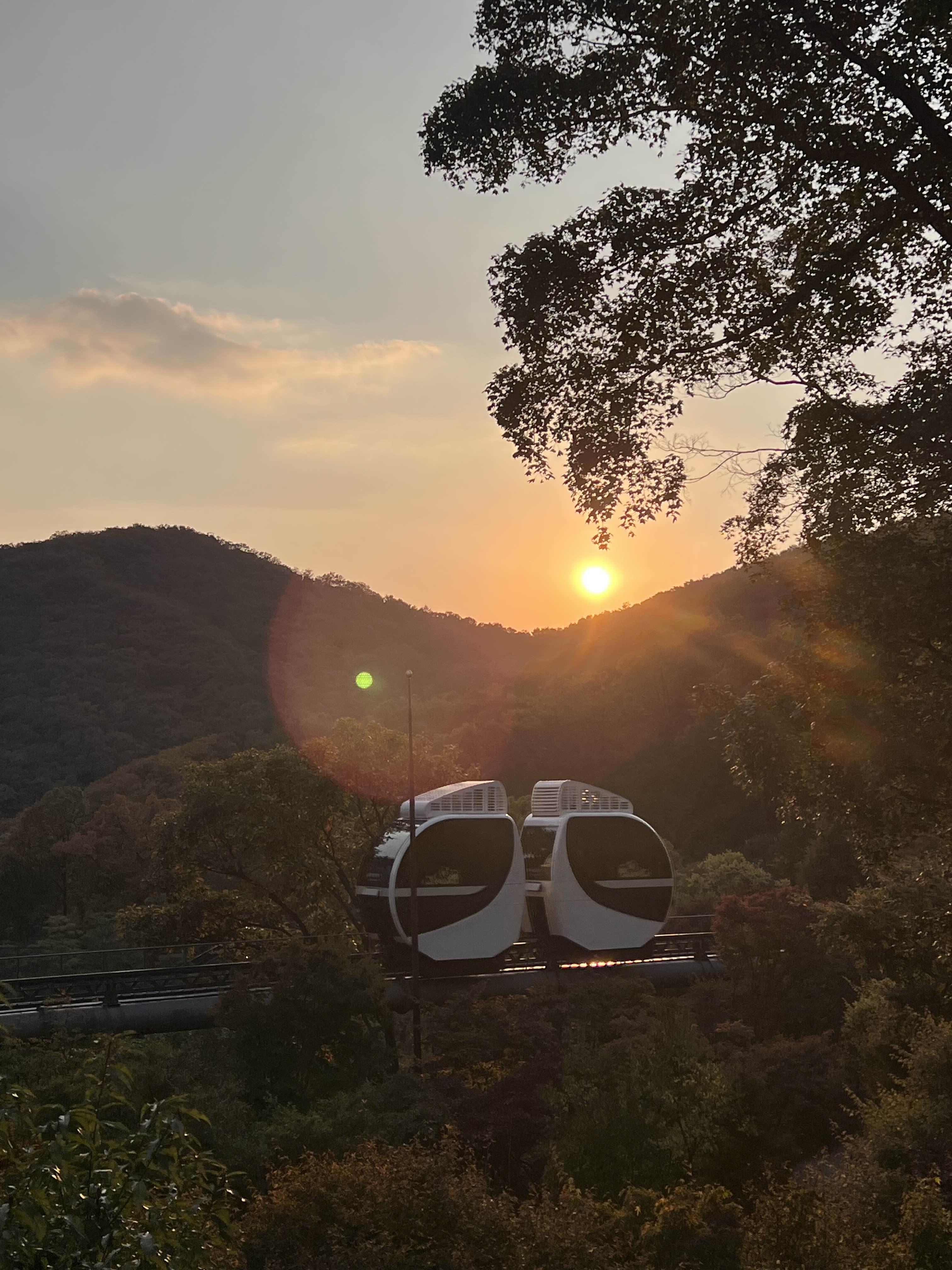 해가 지고 있어서도 그렇고 산도 약간은 붉게 물들고 있어서 좋았습니다. 아미 낙엽이 떨어지고 있는 나무도 있어서 조금 허전해 보이기도 했는데 대체적으로 울긋불긋해서 가을임을 실감했습니다. 모노레일에는 앞뒤로 의자가 4개가 있는데 임산부나 노약자가 앉도록 양보해 주시고 10명 정도 20명 정도 타고 갔던 것 같습니다. 생각보다 사람에게 가려서 시야가 가리기도 하고 창문도 제한적이라 밖을 보기가 편하진 않았어요. 모노레일로 밖을 보기보다 편히 이동하기 위해서 이용하는 게 맞을 것 같아요.