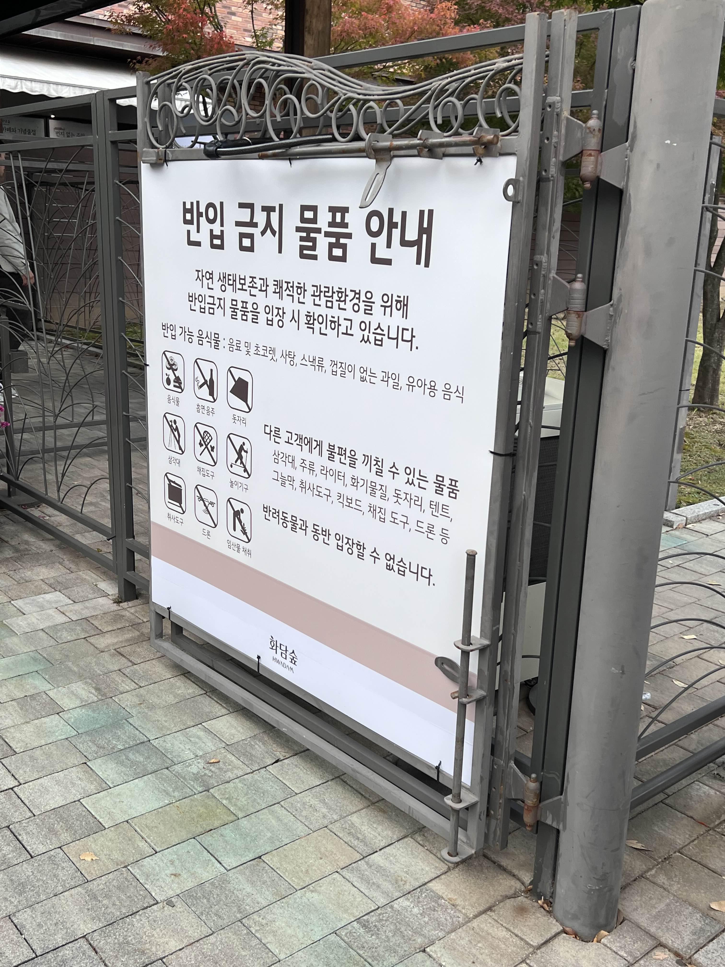 반입금지물품: 삼각대, 주류, 라이터, 화기도구, 돗자리, 텐트, 그늘막, 취사도구, 킥보드, 채집도구, 드론 등