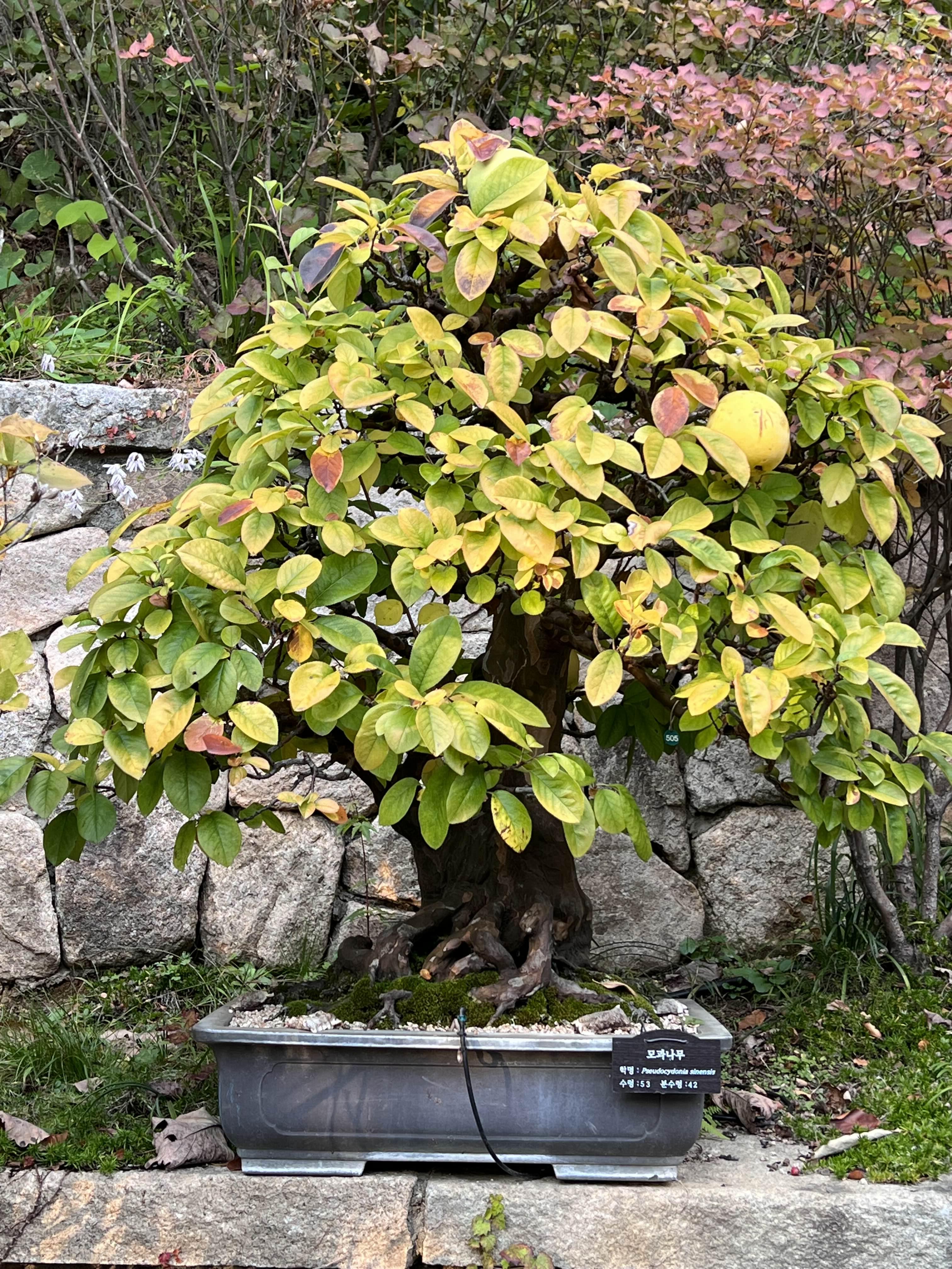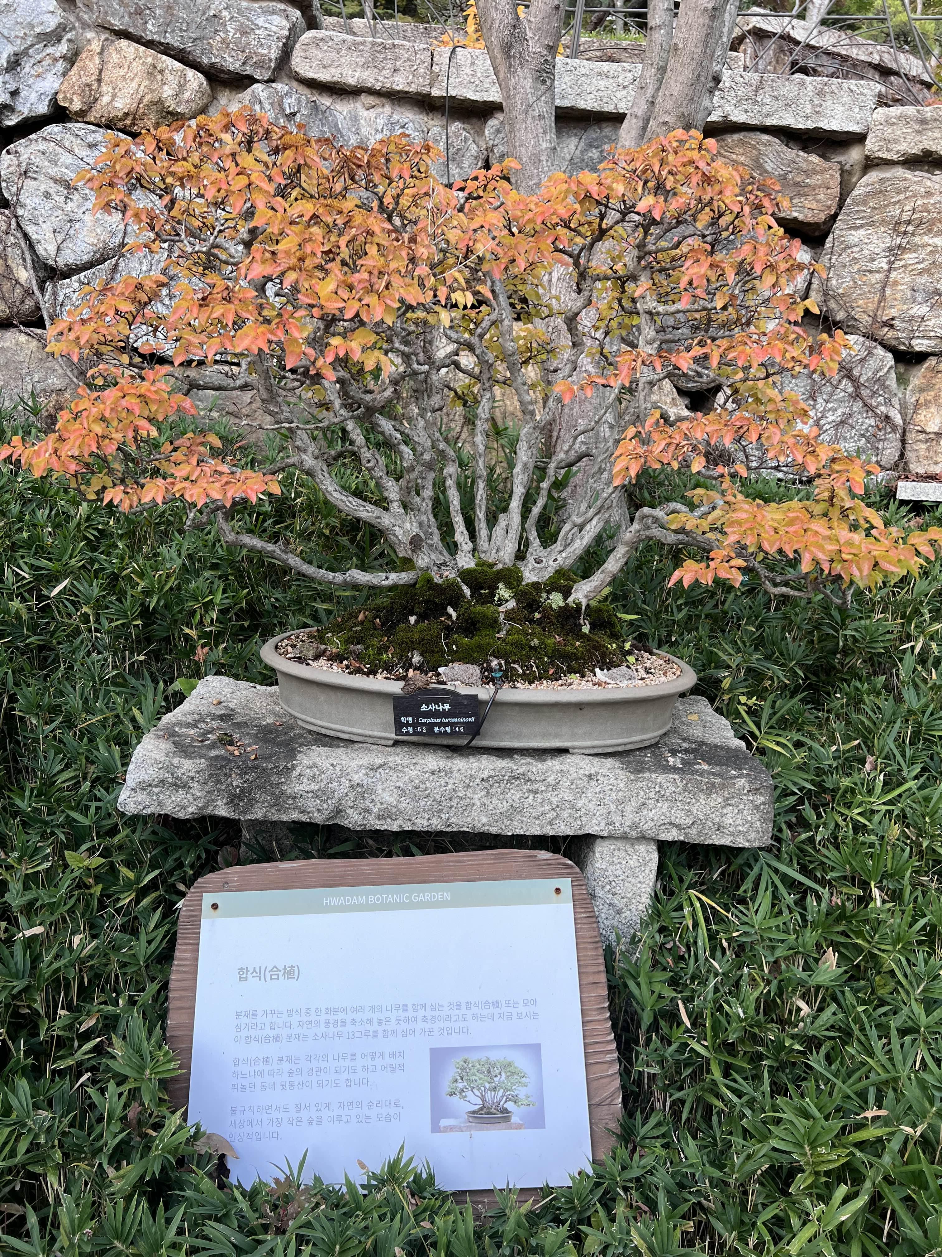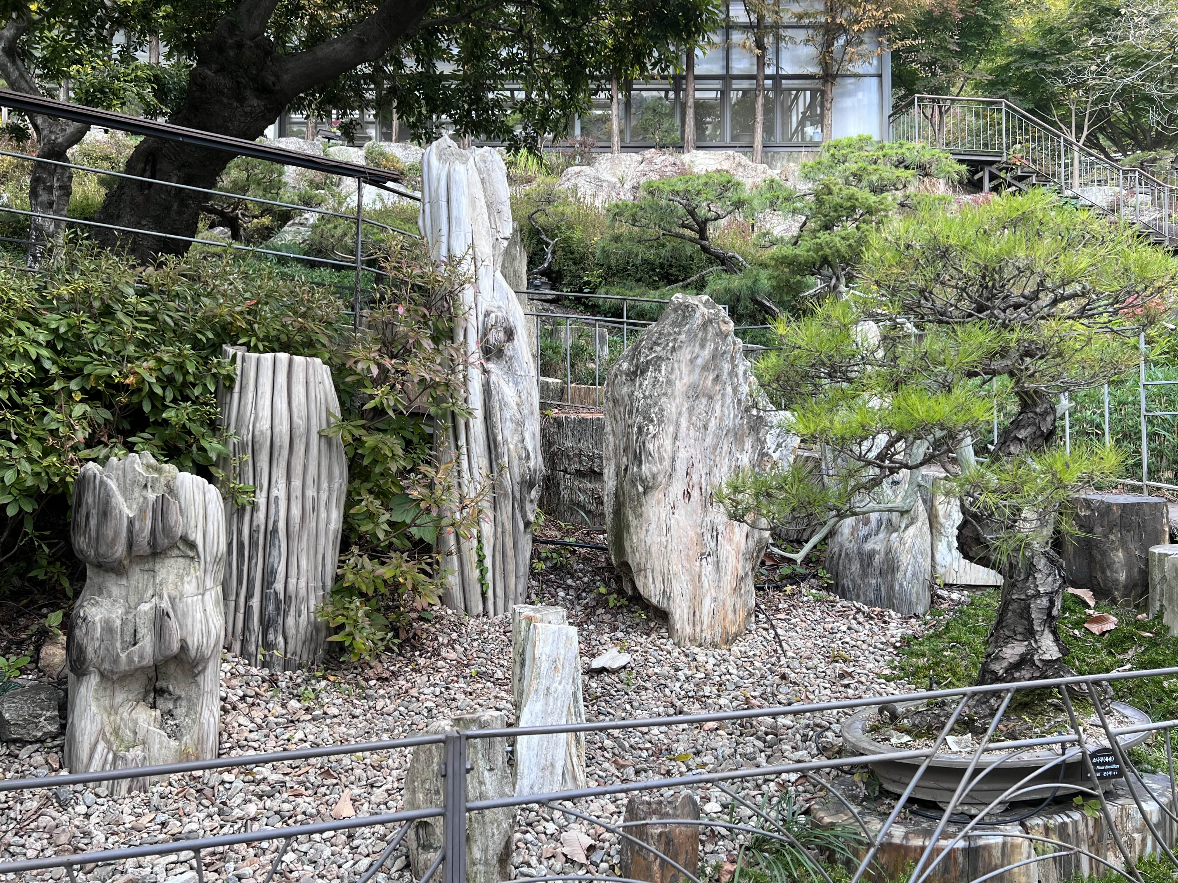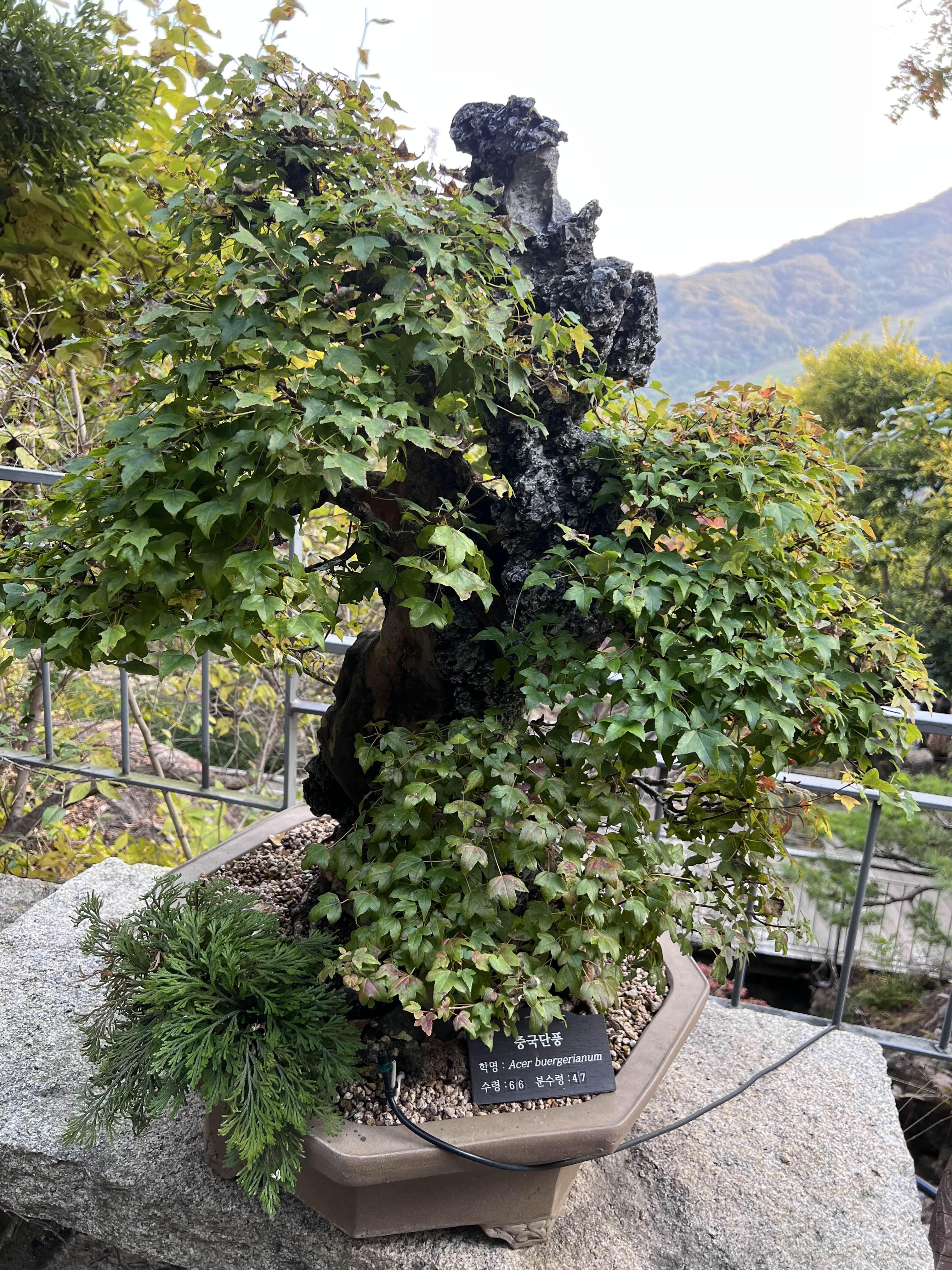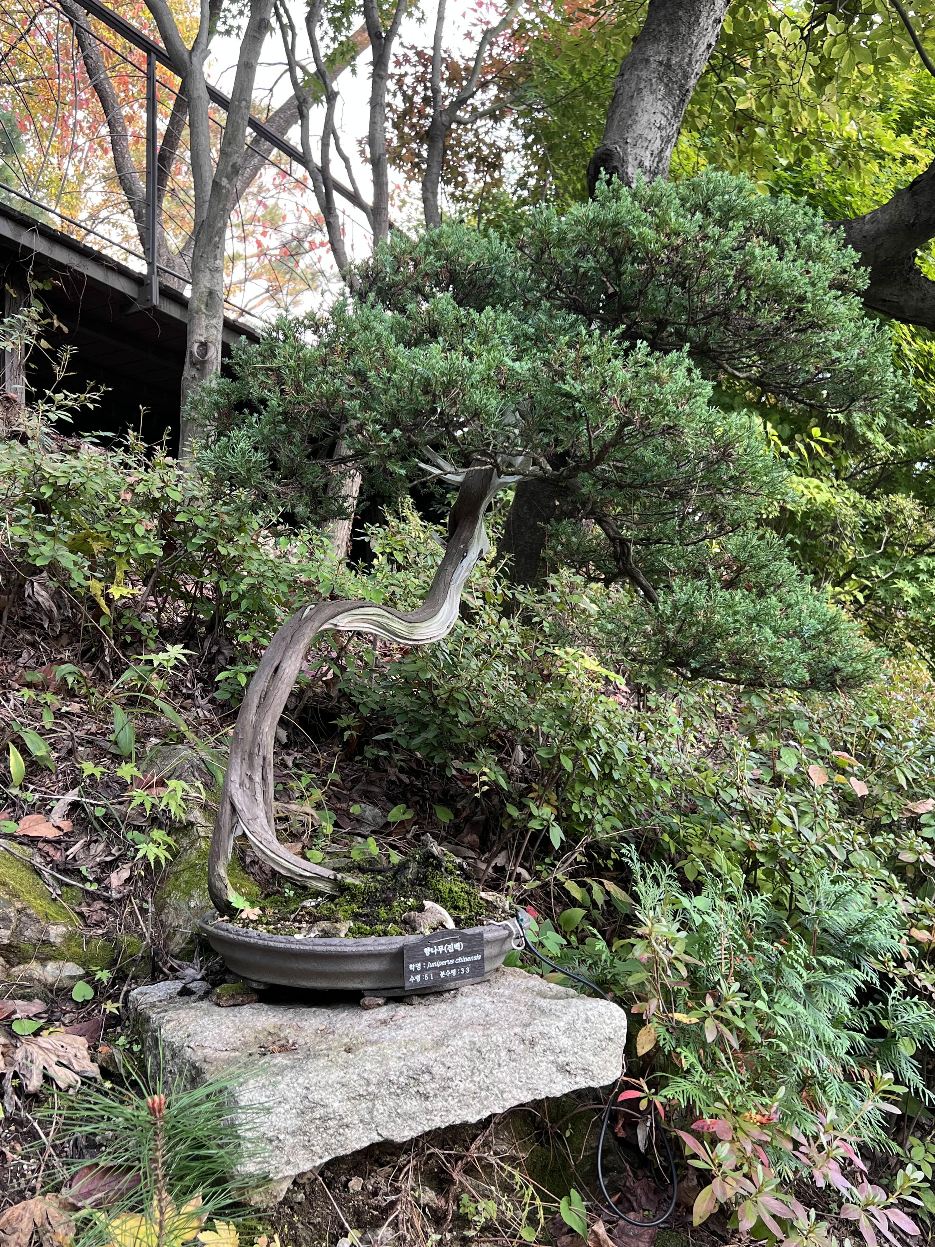돌과 나무가 하나가 되어 얽혀있는 석부작이라는 분재도 있고, 여러 나무가 하나로 묶여서 자라나는 분재도 있었고, 화분에 심어진 지 30년 이상이 된 분재들도 많았습니다. 나이가 60살이 넘는 분재도 엄청 많았어요. 크기만 작지 나이는 다들 엄청 많습니다. 나무가 굳어서 돌처럼 된 것들도 있었어요. 처음 보는 것들이 너무 많아서 다 읽고 지나가고 했었어요. 사진도 엄청 찍어서 엄청 많은데 블로그에는 다 올리지 않겠습니다. 가서 직접 보시는 게 좋아요!