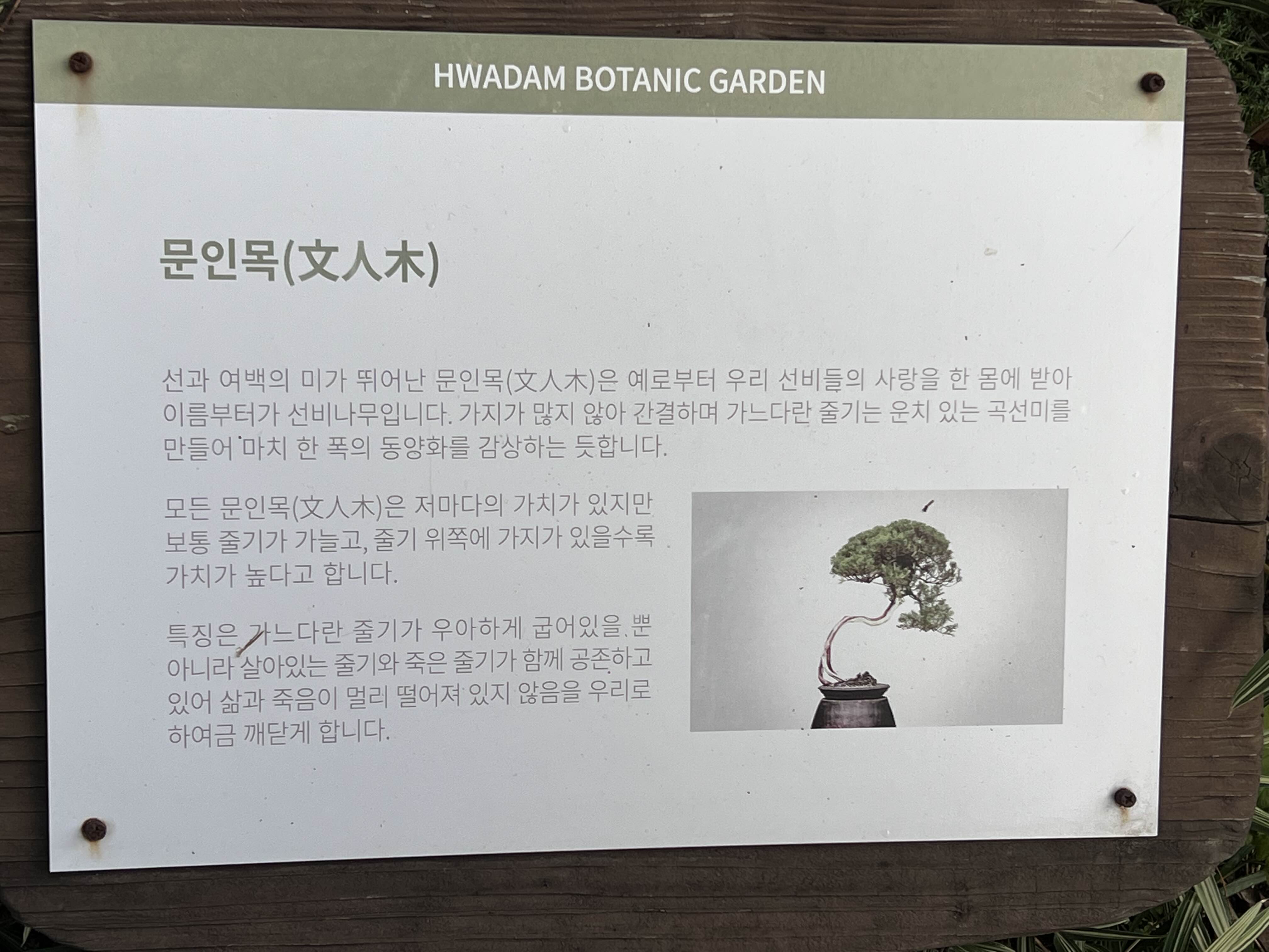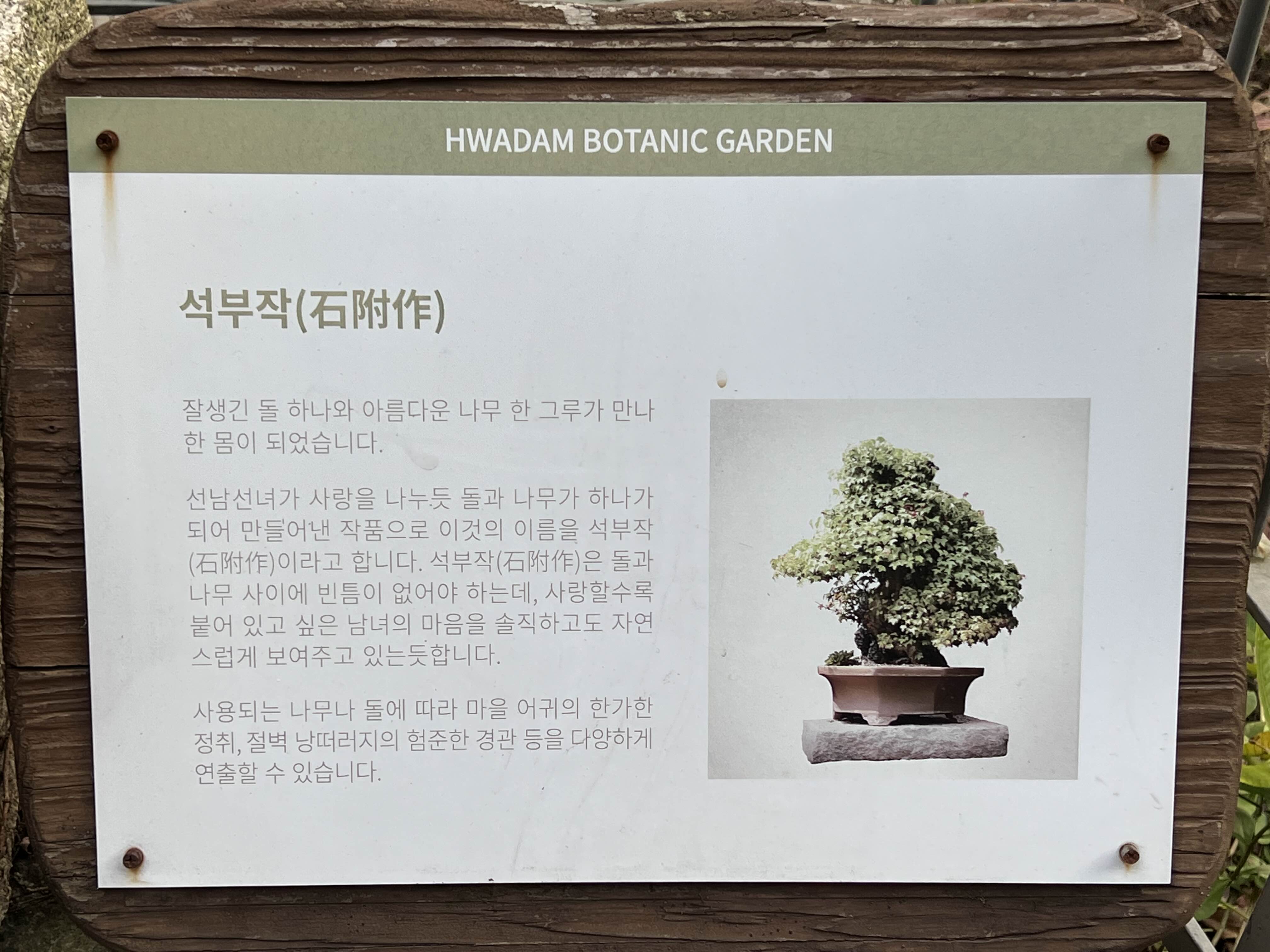 문인목 석부작 수석 등 작품에 설명도 되어 있어서 이해하는데 도움이 됩니다. 수석 빼고는 처음 듣는 단어인데 정말 식물도 이렇게 대단하고 신기할 수 있구나 싶었어요. 분재원을 보고 나도 언젠가 분재를 키워서 가꾸고 싶다는 생각을 했어요. 저희 아버지는 어릴 때부터 분재를 하시기도 해서 내년에는 부모님을 모시고 한번 다녀오고 싶어요. 아버지께 분재를 한번 배워보기도 해야겠어요.