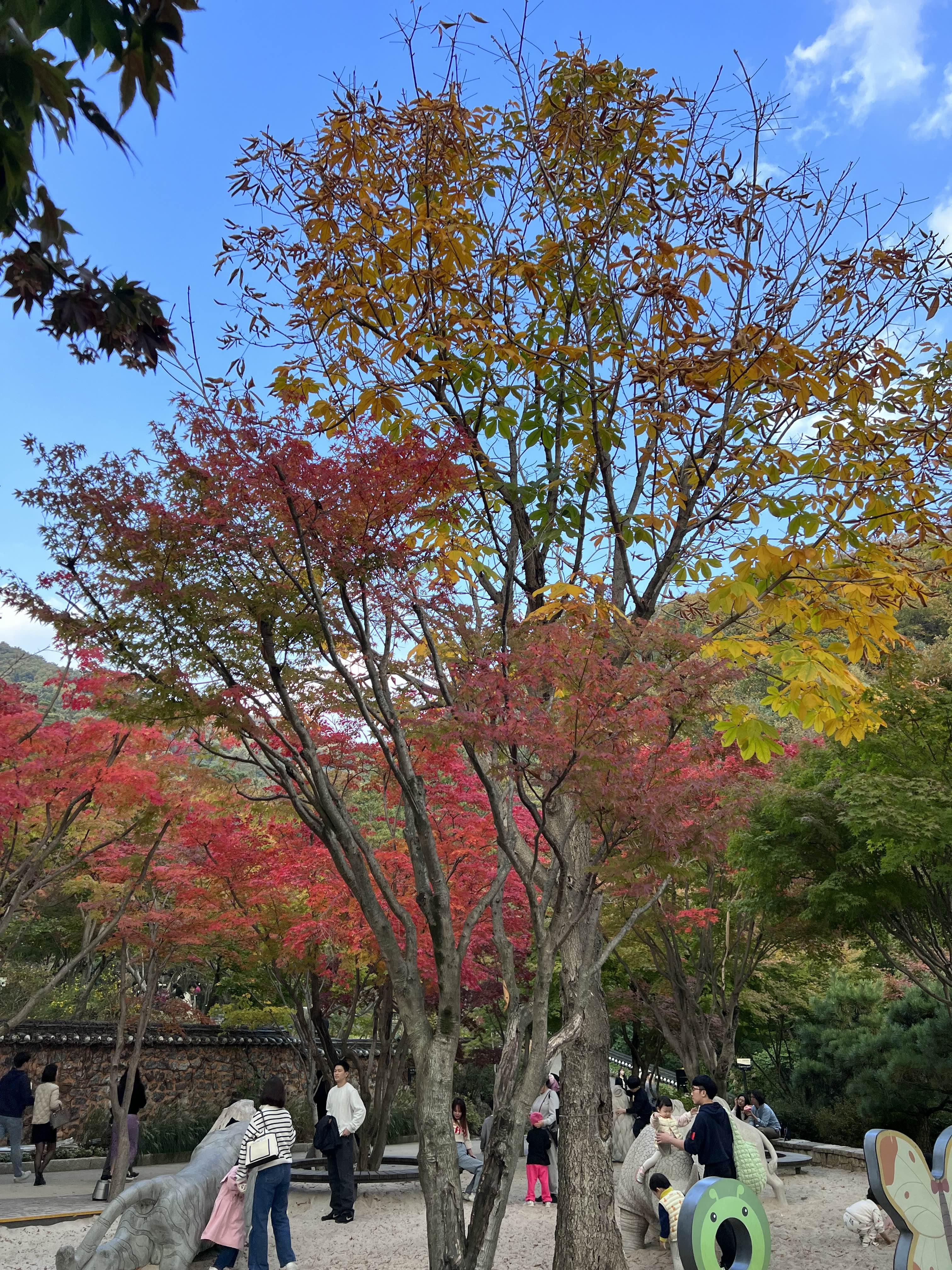 그리고 곤충생태관 앞 단풍은 아주 폼이 미쳤습니다. 아직 낙엽도 하나 떨어지지 않았는데 정말 빨갛고 노랗고 한 단풍들이 방문객의 눈을 사로잡았습니다. 여기서도 사람들이 사진을 많이 찍었습니다. 아마 10월 말에는 더 많이 단풍이 들어서 어디서든 빨간 단풍을 볼 수 있지 않을까 싶네요. 저희는 10월 23일에 다녀와서 그렇게 단풍이 많이 들어있지는 않았습니다. 단풍시기를 정확하게 파악해서 예약하는 것도 정말 쉽지 않네요.
