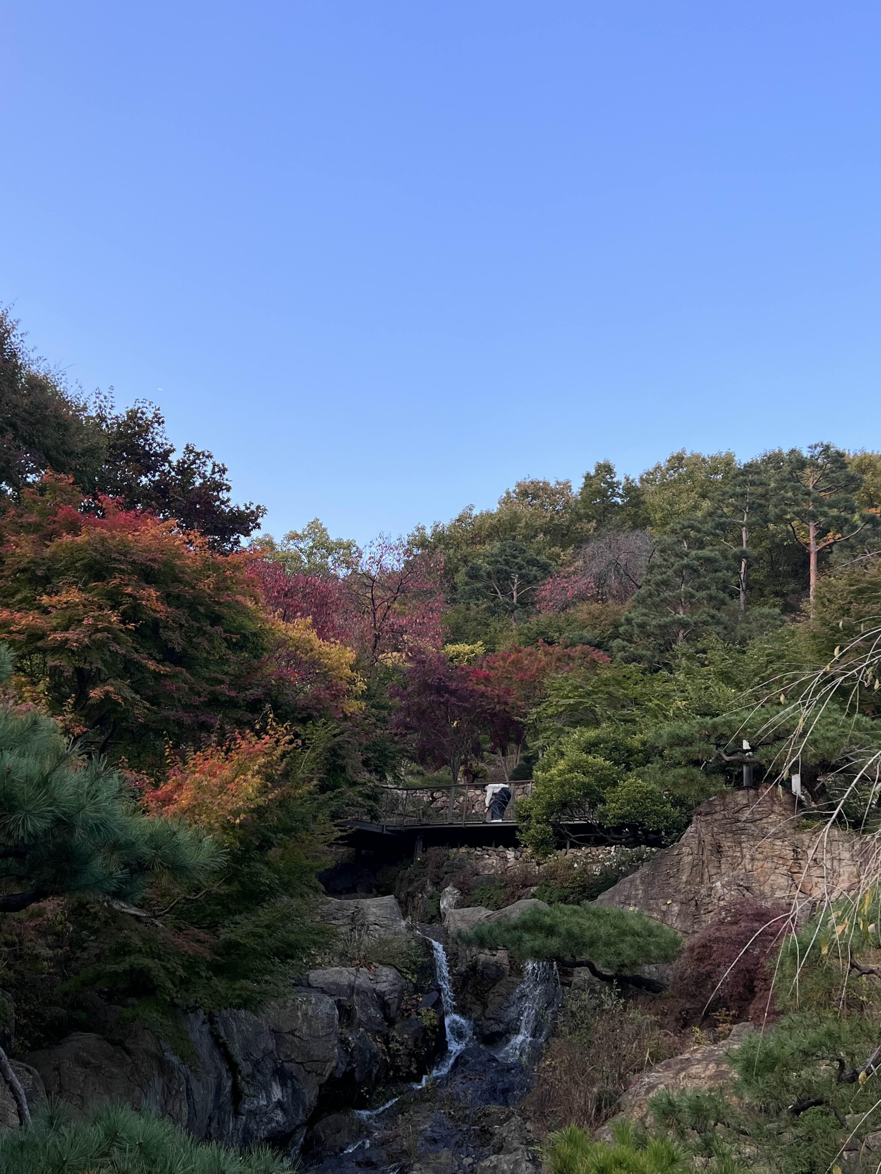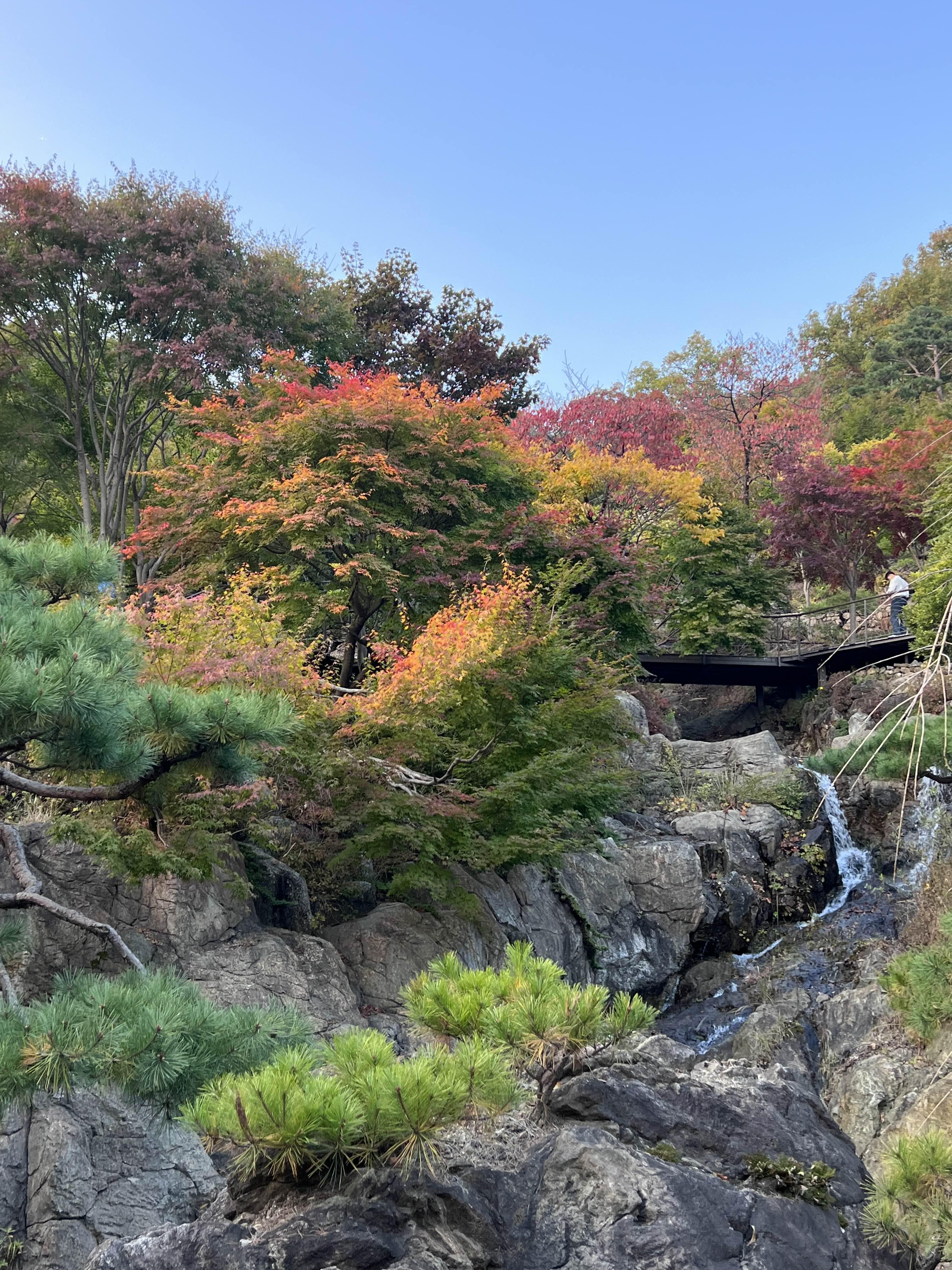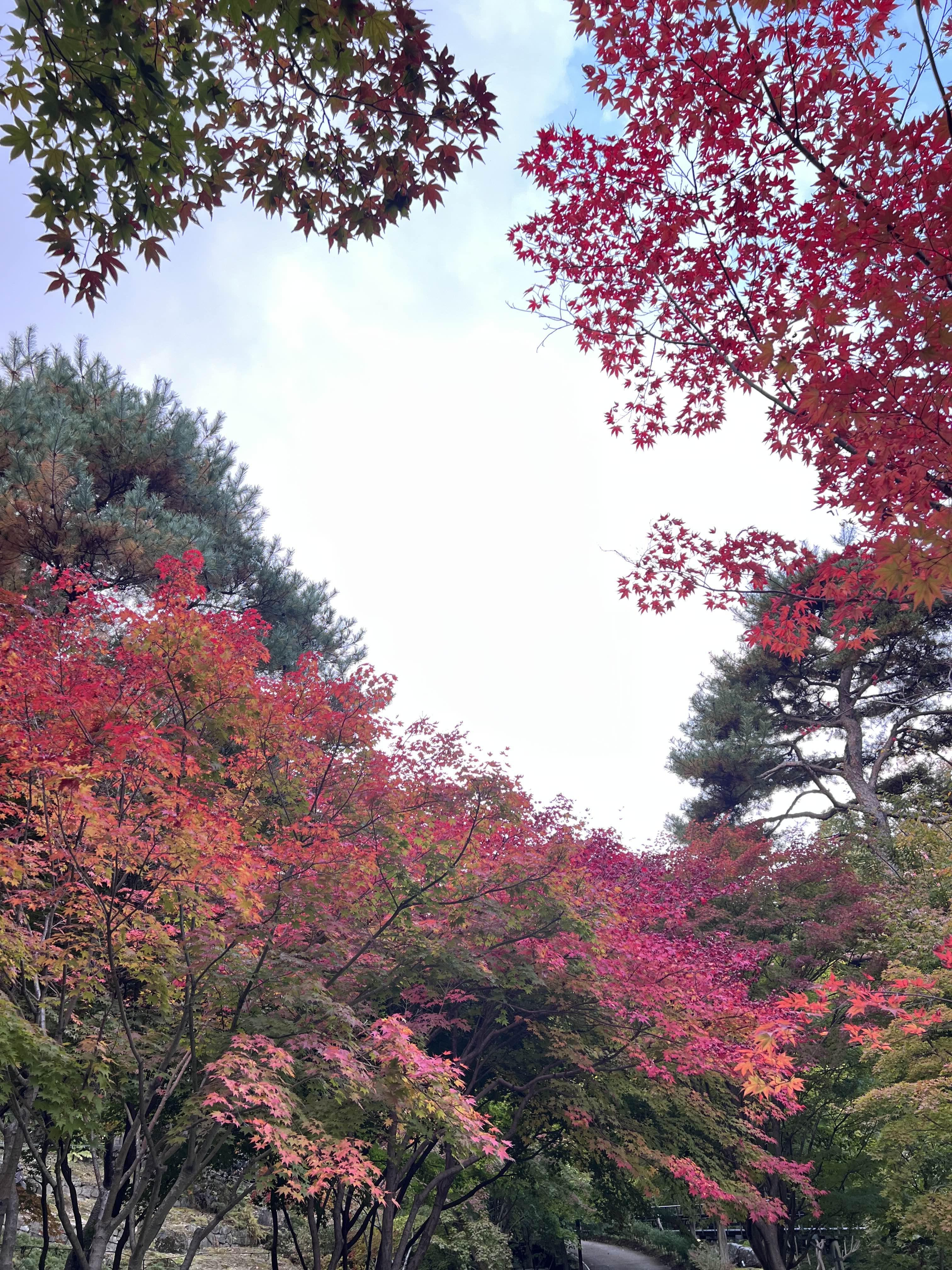 하트다리에서는 모노레일이 지나갈 때 영상이나 사진을 찍으면 멋있어요. 아마도 인스타그램에 많이 올라온 영상이나 사진이 여기에서 찍은 게 아닌가 싶어요. 저희가 갔을 때는 많이 단풍이 들지 않았지만 조금만 더 지나면 다 빨갛게 물들어 이쁠 것 같아요. 저는 다 빨갛지 않고 약간은 풋풋한 지금이 더 좋기도 했습니다.