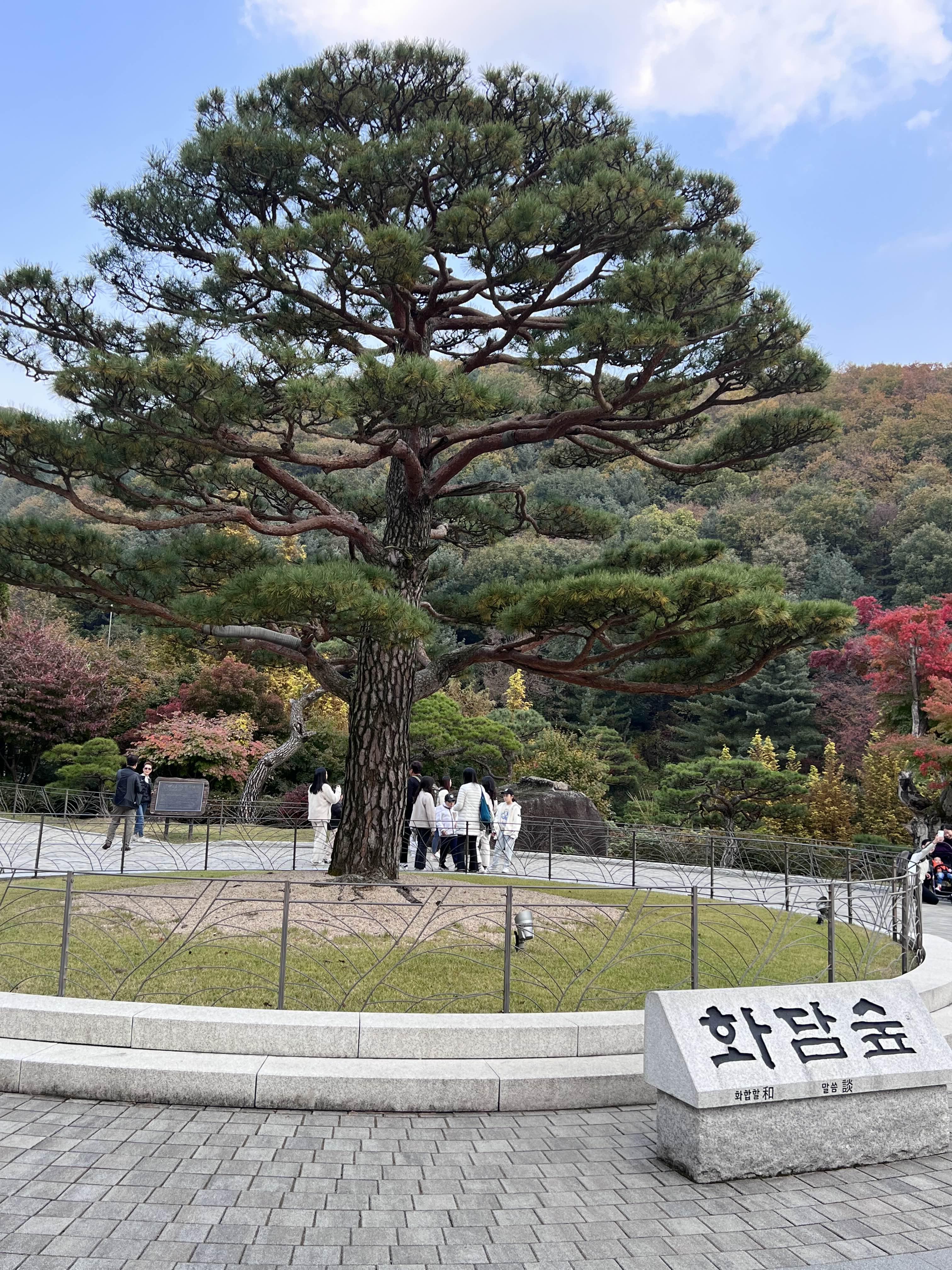 화담숲에 입장하면 멋진 소나무가 제일 먼저 반겨줍니다. 천년화담송이라고 하던데 여기서부터 사람들이 사진을 많이 찍더라고요. 저희는 빠르게 지나쳐서 지도를 살펴봅니다. 혹시나 입장하기 전에 매표소 등에 지도나 리플릿이 있으면 챙겨서 들어오시는 게 좋아요. 저희는 서둘러서 들어온다고 그냥 왔는데 다들 지도를 하나씩 들어 있더라고요. 지도가 있으면 움직이고 시간 파악하는데 도움이 됩니다. 아니면 저희처럼 사진을 미리 찍어두고 보시는 것도 방법입니다.