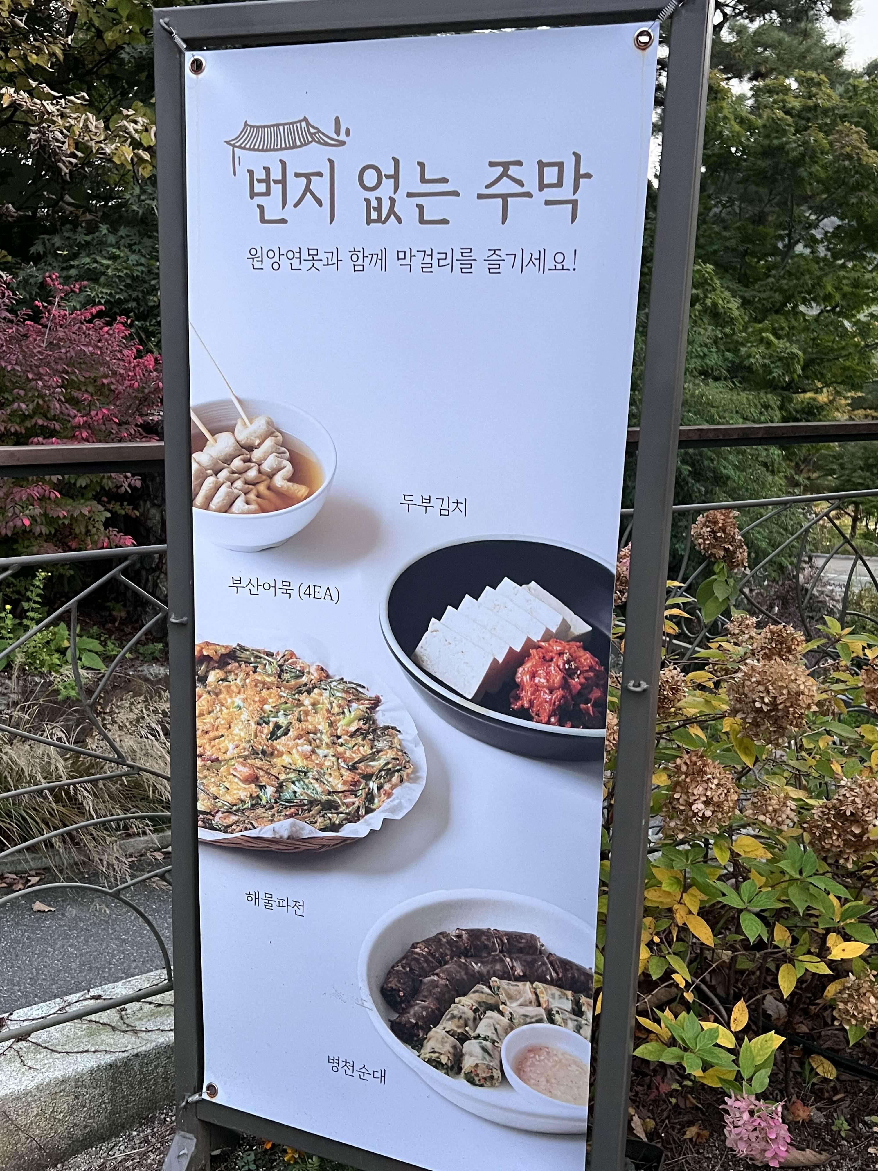 번지없는 주막에는 두부김치나 부산어묵, 해물파전, 순대 등을 팔고 있어요. 대신에 마지막 주문이 17시 30분까지라고 너무 늦게 가지면 안 됩니다. 주막까지 다 이용하시려면 12시부터는 입장하셔서 봐야 하지 않을까 싶네요! 나름 원앙연못이 앞에 보이고 배경이 화담숲이 있어서 여기서 막걸리 한잔 하면 너무 좋을 것 같아요. 일찍 오시는 분들은 한번 들러서 한잔 하시고 출출한 배를 채우고 가시는 것도 좋을 것 같아요.