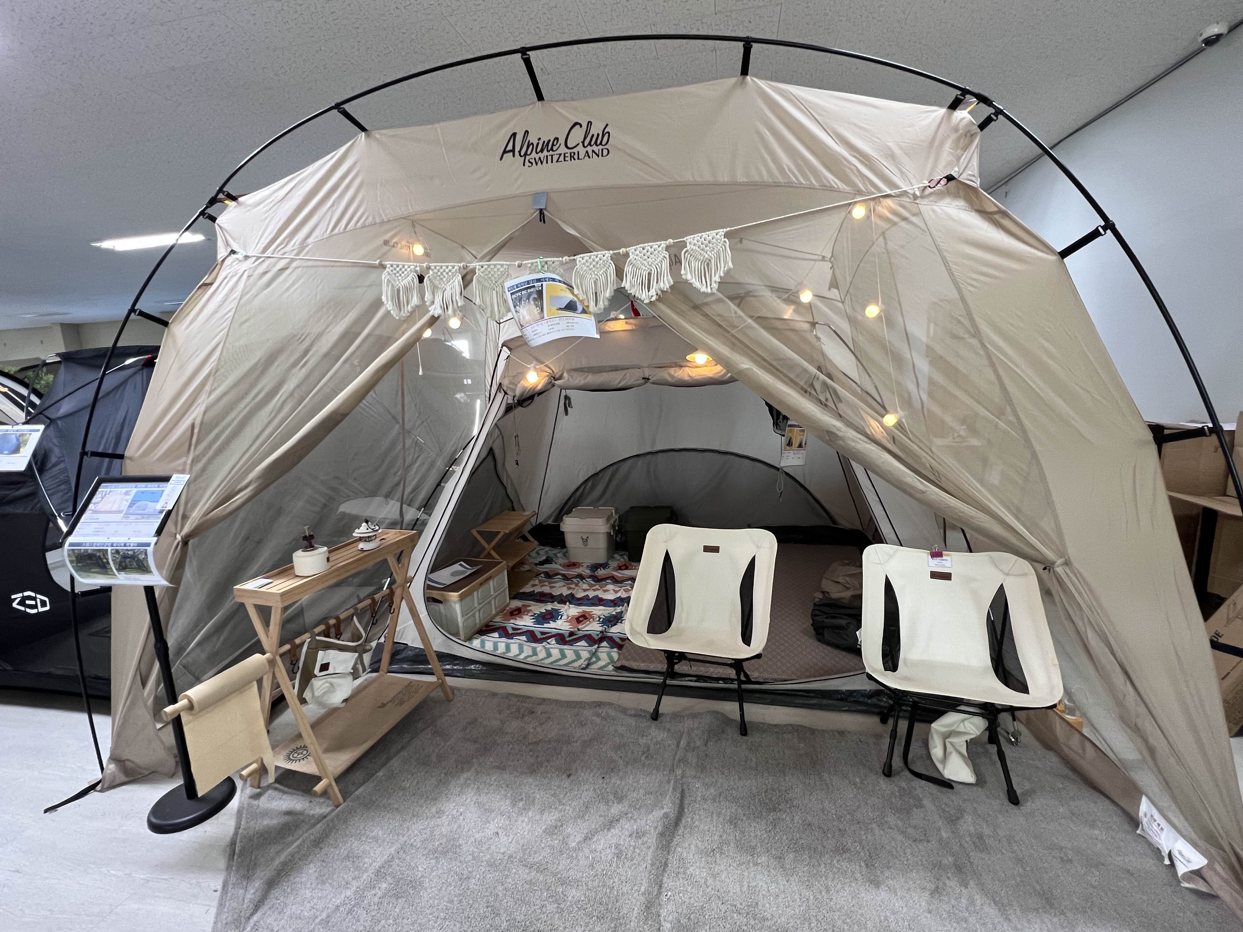 리빙쉘터/쉘터/텐트 등 다양하게 전시되어 있었어요. 가격이랑 실제 펼쳤을 때 어떤 느낌인지 바로 알 수 있어서 좋았습니다. 역시 저는 텐트는 밝은 색이 더 좋은 것 같아요. 아이보리색이나 베이지 색이 밝고 따듯한 느낌이라 더 눈에 들어오네요.