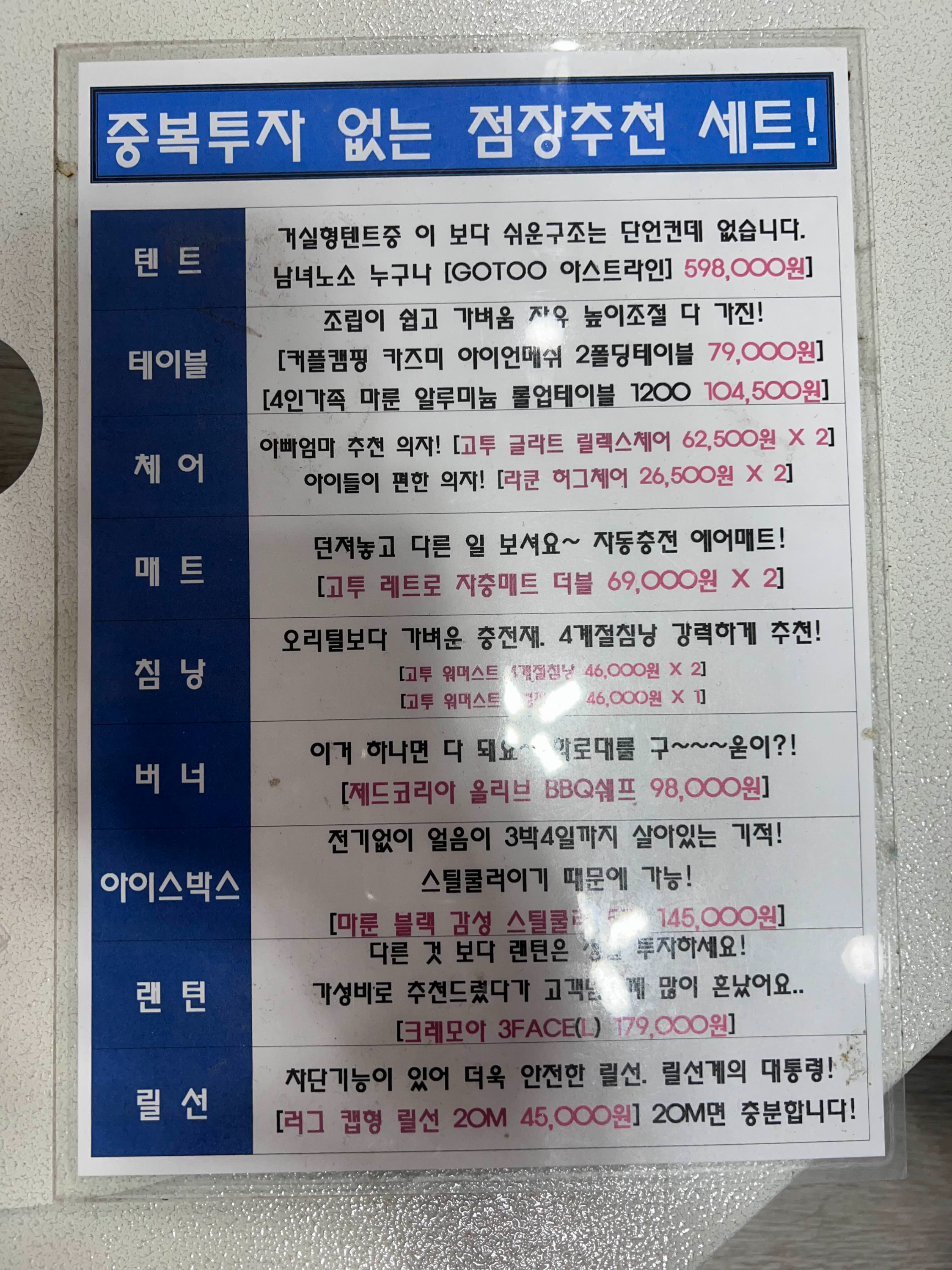 점장이 추천하는 세트도 있어서 진열되어 있는 상품을 보고 하면 좋을 것 같아요. 무엇을 사야 할지 모른다면 점장님의 추천으로 구매를 하셔도 좋을 것 같아요. 직원들이 꽤 계셔서 모르거나 못 찾는 물건 있으면 언제든지 물어보시면 될 것 같습니다. 저희가 12시쯤 방문했는데 사람들이 꽤 많았어요. 다들 저희처럼 캠핑장 가기 전에 들리신 건지 모르겠지만 생각보다 사람이 많아서 놀랬습니다.