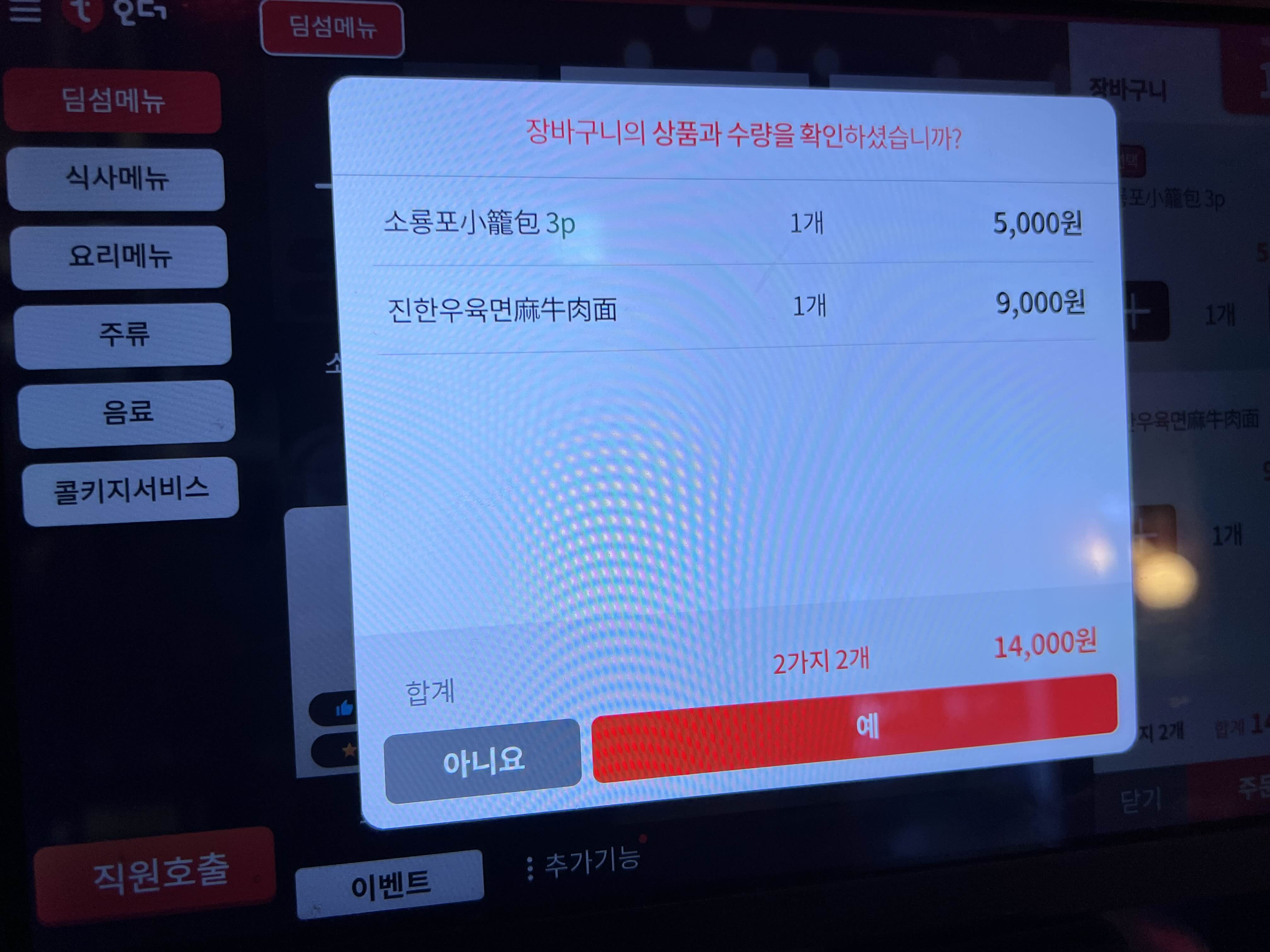 이렇게 4인테이블이 많이 있고, 주방 주변으로 바 자리도 있어서 혼자 먹기 편했어요. 저도 혼자 갔기 때문에 바 자리에 앉아서 혼자 주문을 했습니다. 저는 소룡포와 진한우육면을 주문했습니다. 자리에서 셀프로 주문했는데 카드결제가 안되서 따로 직원께 말씀드렸어요.