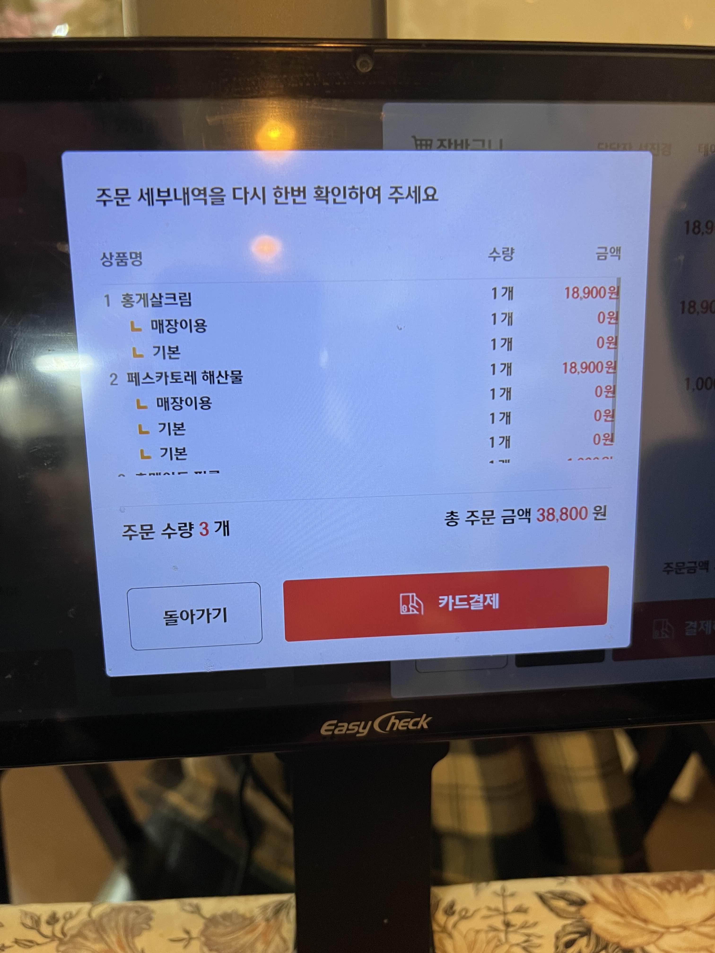 저희는 홍게살크림파스타랑 페스카토레해산물파스타를 주문했습니다. 다른 메뉴들은 그 전에 먹어보았는데 두 메뉴는 안 먹어봐서 먹어보기로 했어요. 이전과 다르게 기기에 주문 입력하고 선결제하니까 더 좋더라고요. 따로 직원을 부를 필요도 없고 오래 고민해도 눈치 안 봐서 좋았어요.