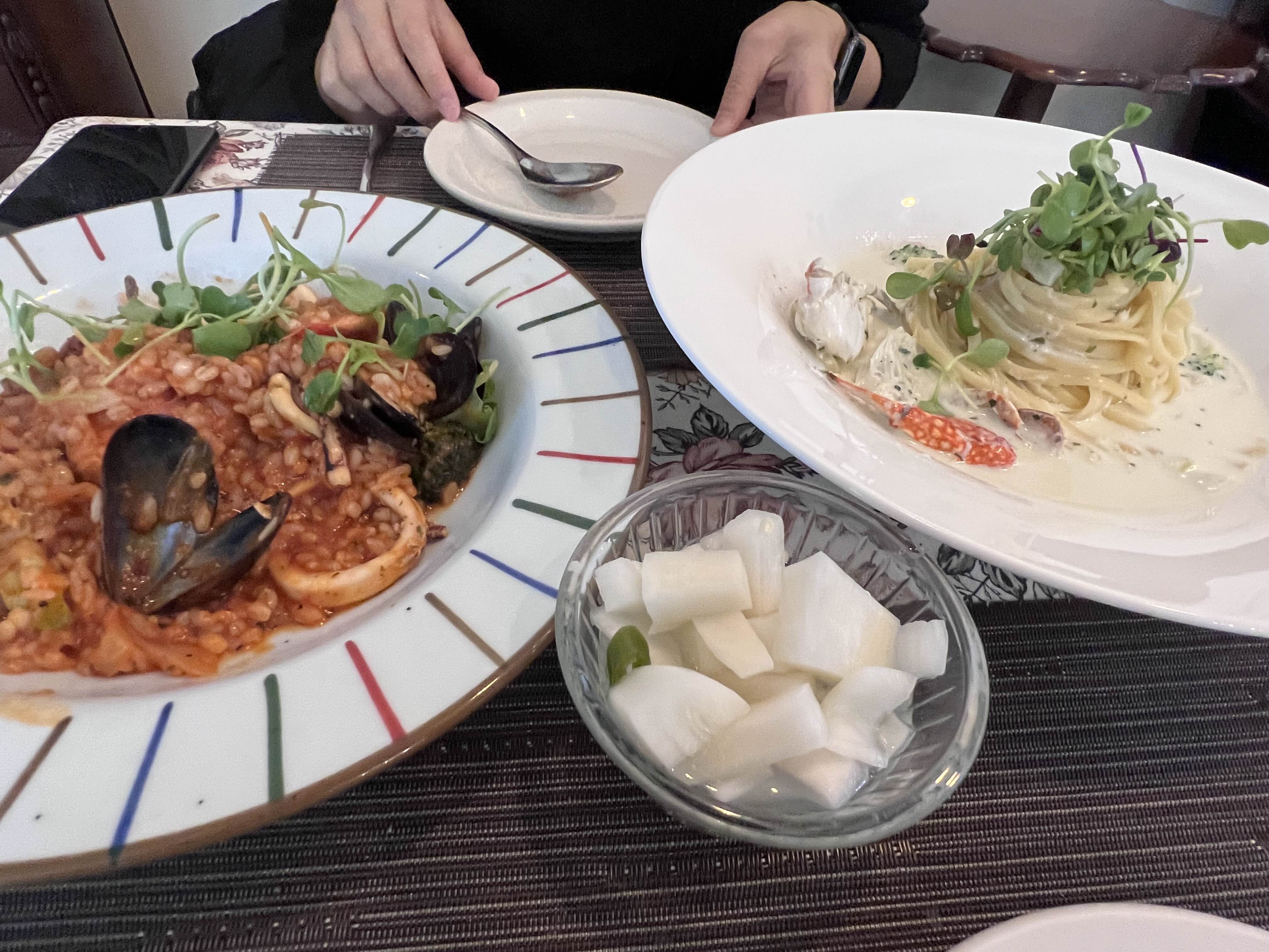 각종 해산물이 들어가 있어서 맛 좋았고, 크림파스타와 같이 먹으면 좋을 것 같아요. 양은 적당했고, 맛은 좋았어요. 그리고 저희는 피클을 따로 시켰어요. 파스타집에서는 피클을 기본으로 주는 것 아닌가요. ㅠ 여기서는 피클도 1000원에 따로 주문을 했습니다. 파스타 가격도 18,000원도 여서, 2명이서 먹으면 기본 4만원은 되는 것 같습니다. 그래서 아까 앞에 있던 세트메뉴로 주문하는 것도 음료포함이니까 좋은 구성인 것 같다는 생각이 듭니다.