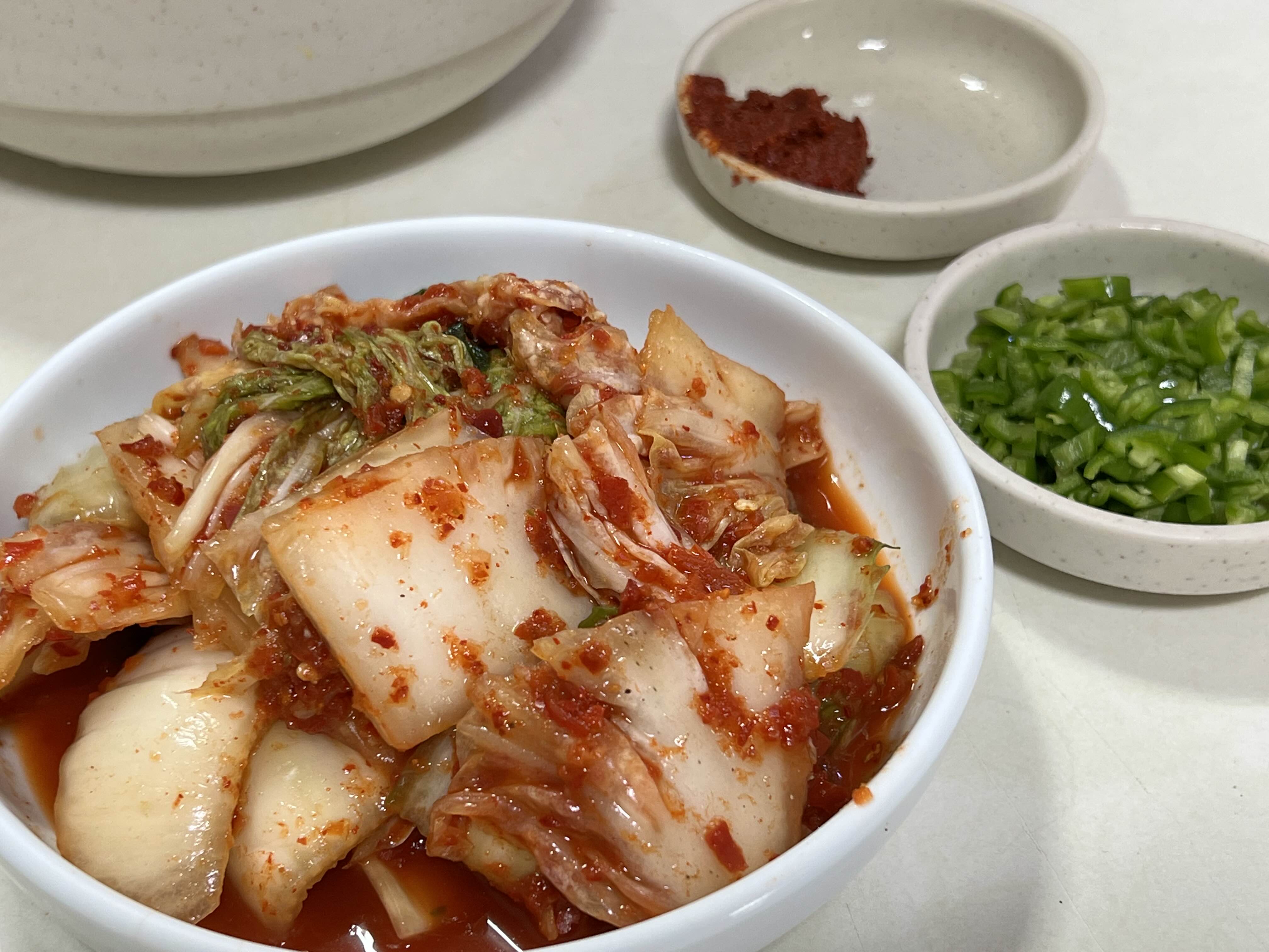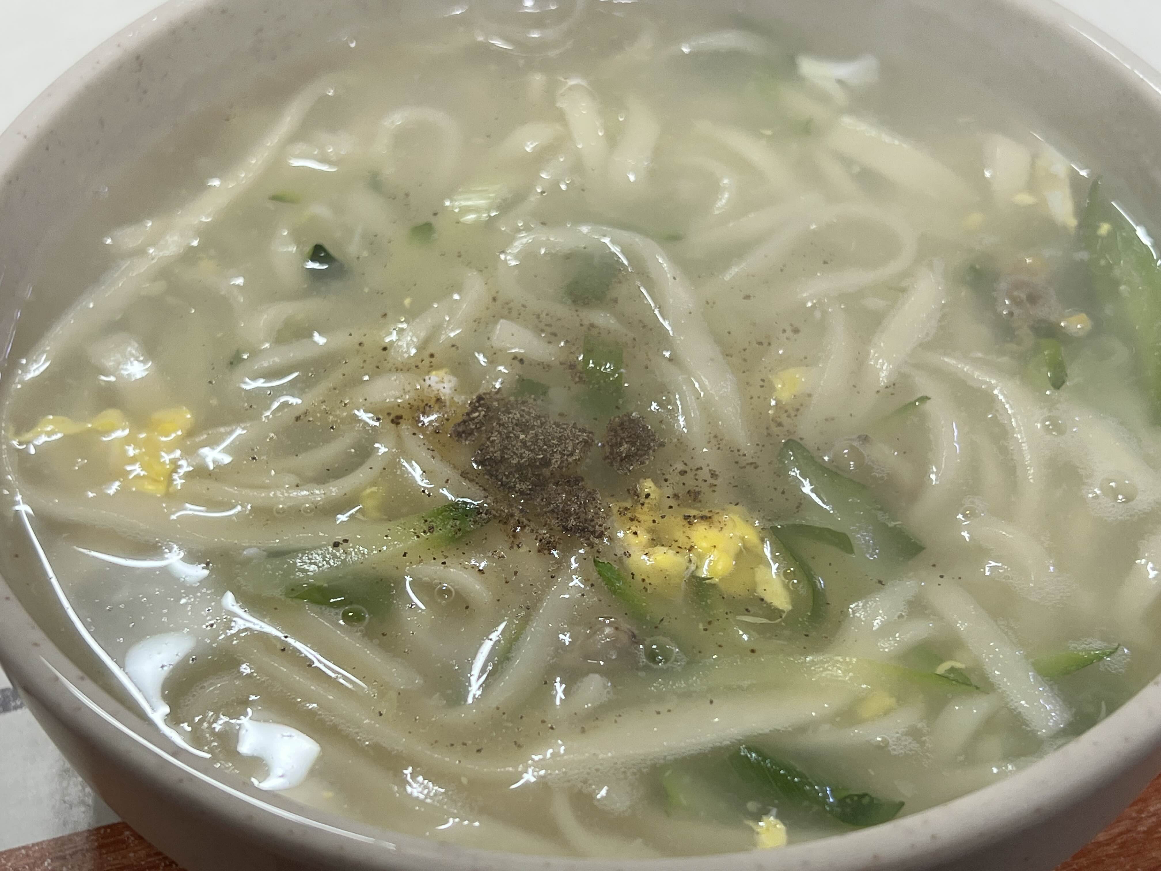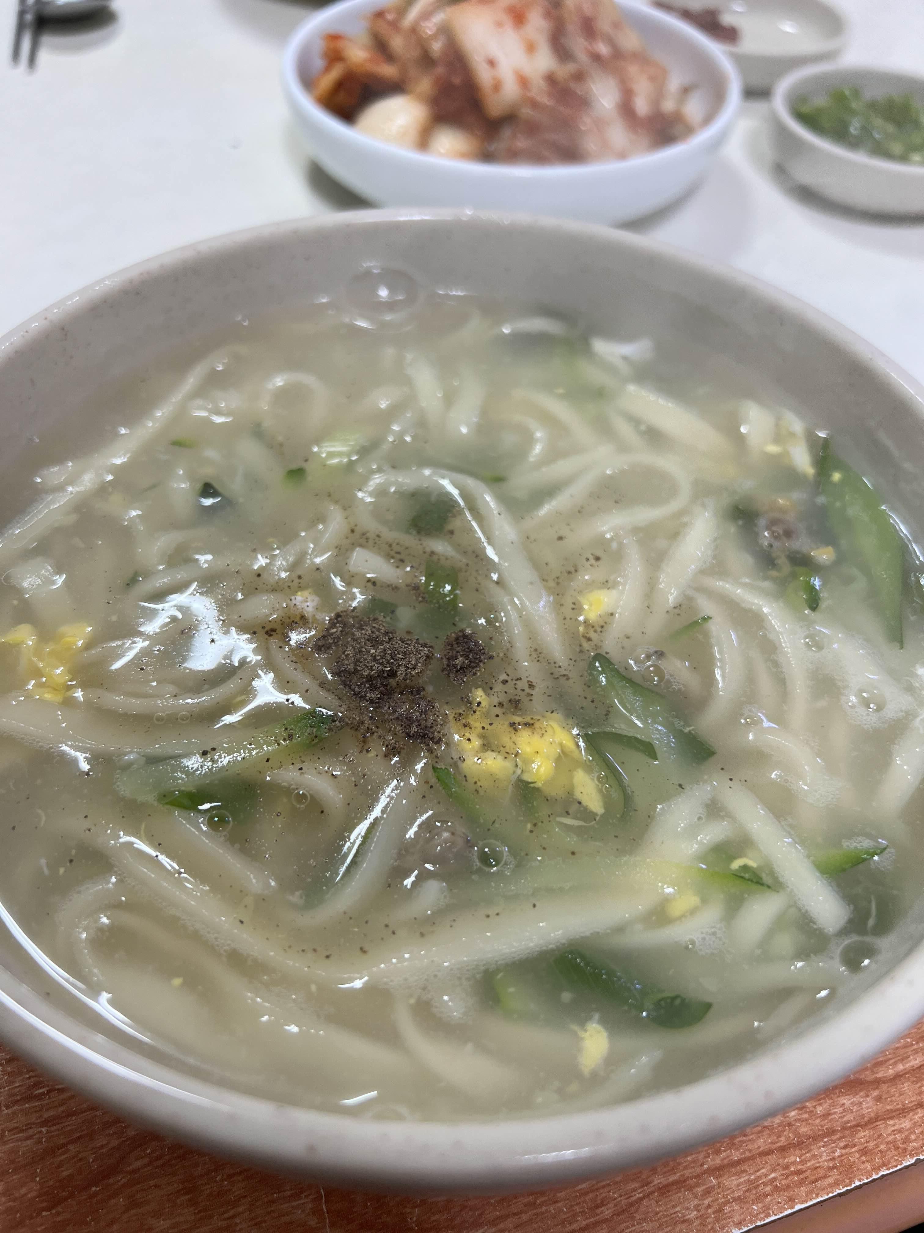 손칼국수는 국물이 약간 걸죽하게 나옵니다. 후추는 뿌려져서 나오고 면을 보시면 손으로 만든 칼국수라는 걸 알 수 있어요. 다진 양념랑 청양고추가 나오고 김치가 나옵니다. 나오는 반찬은 이게 다입니다. 더 필요도 없고 이렇게만 있으면 맛있게 먹을 수 있어요! 만약에 후추를 싫어하시면 미리 말씀해 주시는 게 나을 것 같아요! 저는 정말 시원하니 맛있게 먹었습니다. 김치랑도 잘 어울려서 잘 먹었고, 먹다가는 다진 양념랑 고추를 넣어서도 먹어보았습니다.