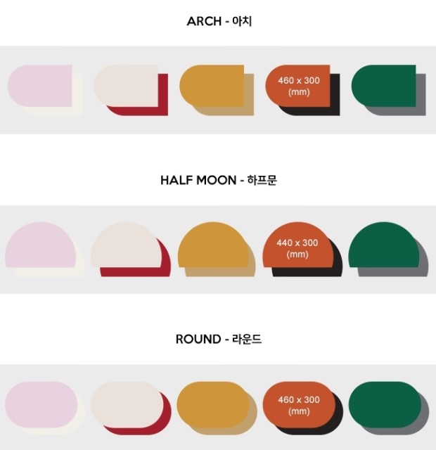 모양은 아치/하프문/라운드/페블/스톤 이렇게 5개의 모양이 있어서 취향에 따라 구매하시면 됩니다. 저는 불규칙한 모양보다는 안정되고 대칭된 모양을 선호하는 편이라 라운드 모양으로 골랐고, 의자색과 비슷하게 노란색/연한갈색으로 선택했습니다. 컬러는 아래 처럼 두가지 색을 양면으로 선택할 수 있기 때문에 좋아하는 컬러가 있는 것으로 고르시면 됩니다. 개인적으로는 초록/회색도 너무 좋아보이고, 아이보리/레드도 음식과 잘 어울릴 것 같다는 생각이 듭니다.