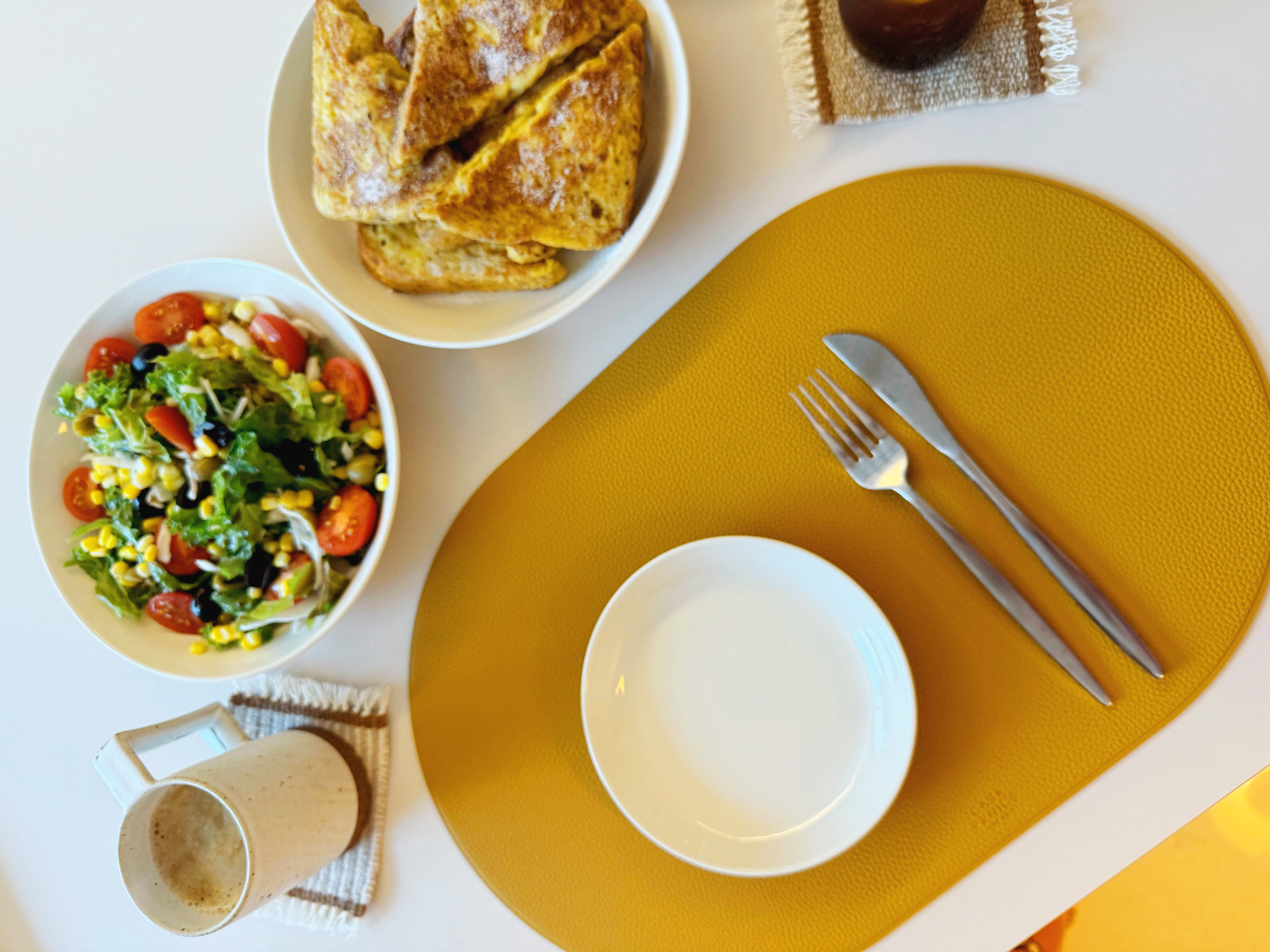 테이블 매트로 아침 식사 분위기를 냈습니다. 더 로맨틱하게 느껴져서 신혼집에는 테이블매트 필수인 것 같습니다. 혼자 사시는 분들도 대충 차려서 먹지말고 테이블 매트 깔고 이쁘게 사진찌고 드시면 좋아요! 자존감 뿜뿜합니다!:-)
