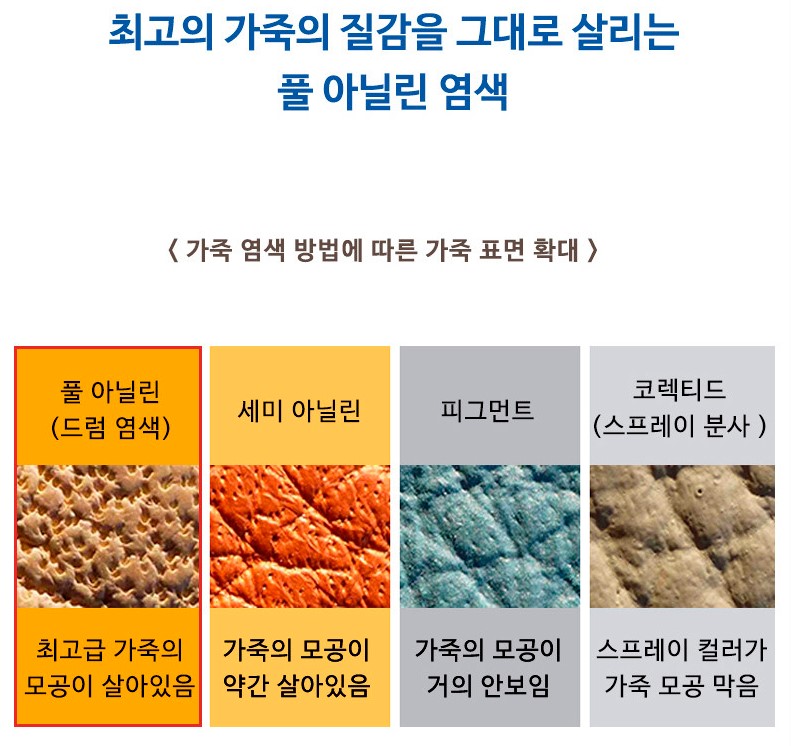가죽의 표피층을 사용하여 가장 내구성이 좋다고 하고, 실제로 껴보니까 너무 부드러워서 움직이거나 손가락을 사용하는데 불편함이 없었습니다. 그리고 내부도 따듯한 재질로 되어 있어서 습기가 차거나 하지 않고 뽀송뽀송하게 유지가 되더라고요. 염색방법도 아래 이미지처럼 가죽의 질감을 살리는 풀 아닐린 염색을 해서 실제 가죽과 비슷한 모습을 하고 있습니다.