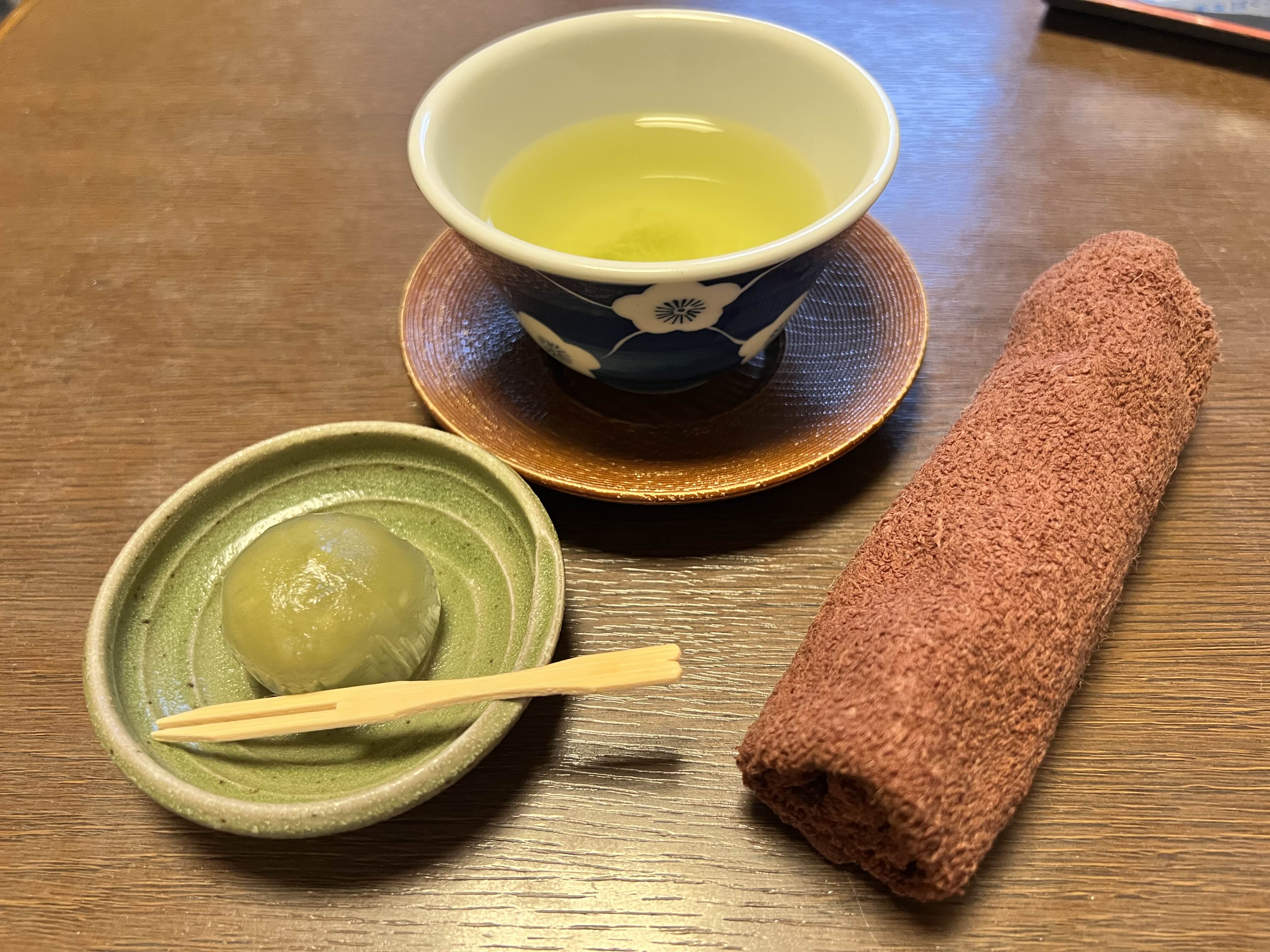 따듯한 수건과 모찌 그리고 차가 나옵니다. 손을 따듯하게 닦고 따듯한 차를 마시면서 모찌를 먹으니까 정말 일본에 온 게 실감이 났습니다. 웰컴티를 먹고 나서 시간이 아깝기 때문에 바로 시내구경하러 나갔습니다.