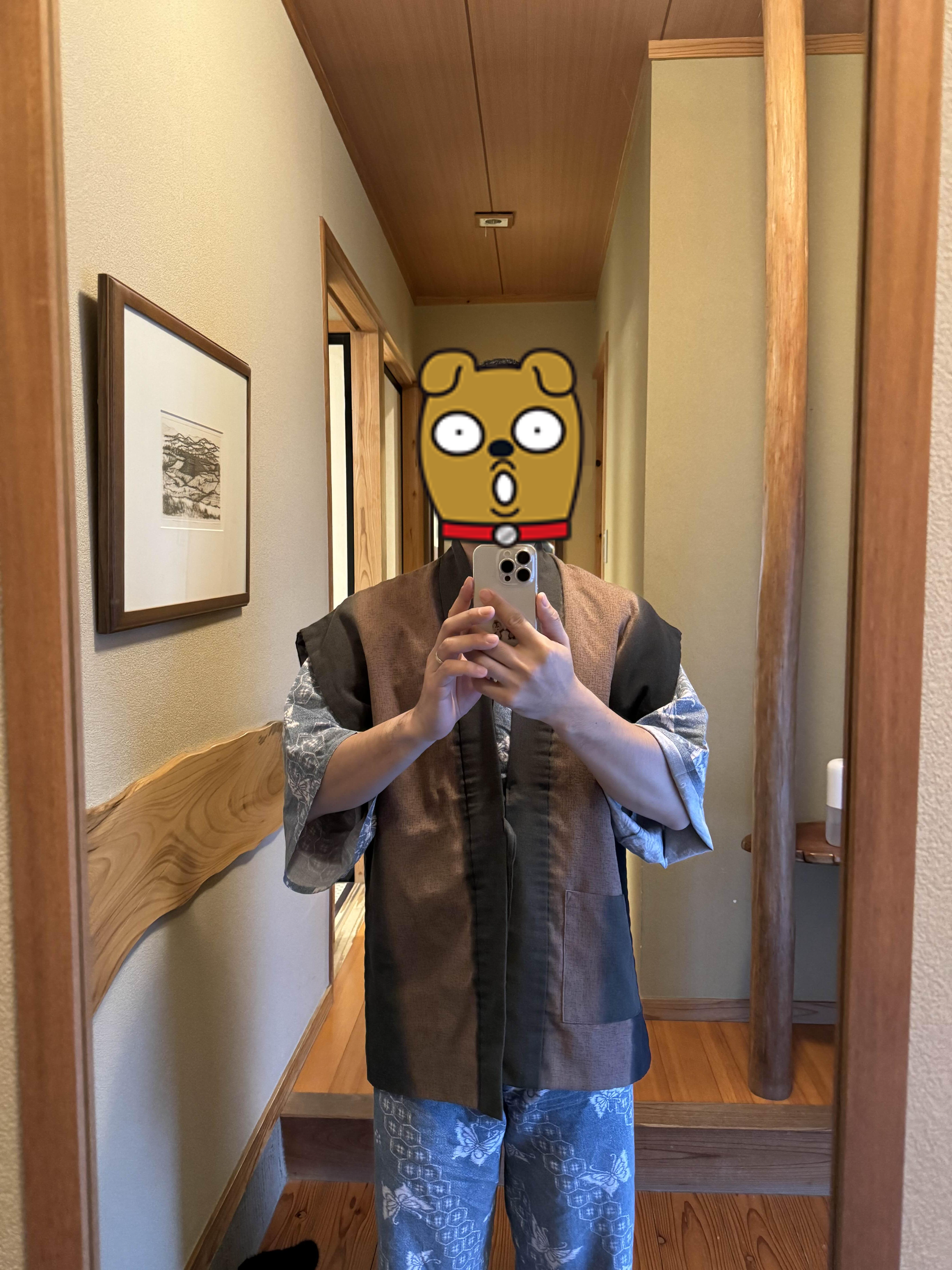 유카타는 입으면 이런 차림인데 실내나 식사, 온천가실 때 입으면 좋습니다. 따로 옷을 챙겨가지 않아도 매일 입을 옷을 주니까 좋더라고요. ㅋㅋ 그리고 온천이나 식사하러 갈때 입을 두꺼운 코트같은 유카타도 뒤편에 있으니 꼭 챙겨입고 다니세요. 저희는 못 보고 입지를 못했습니다. 떠날 때야 알았어요...흑
