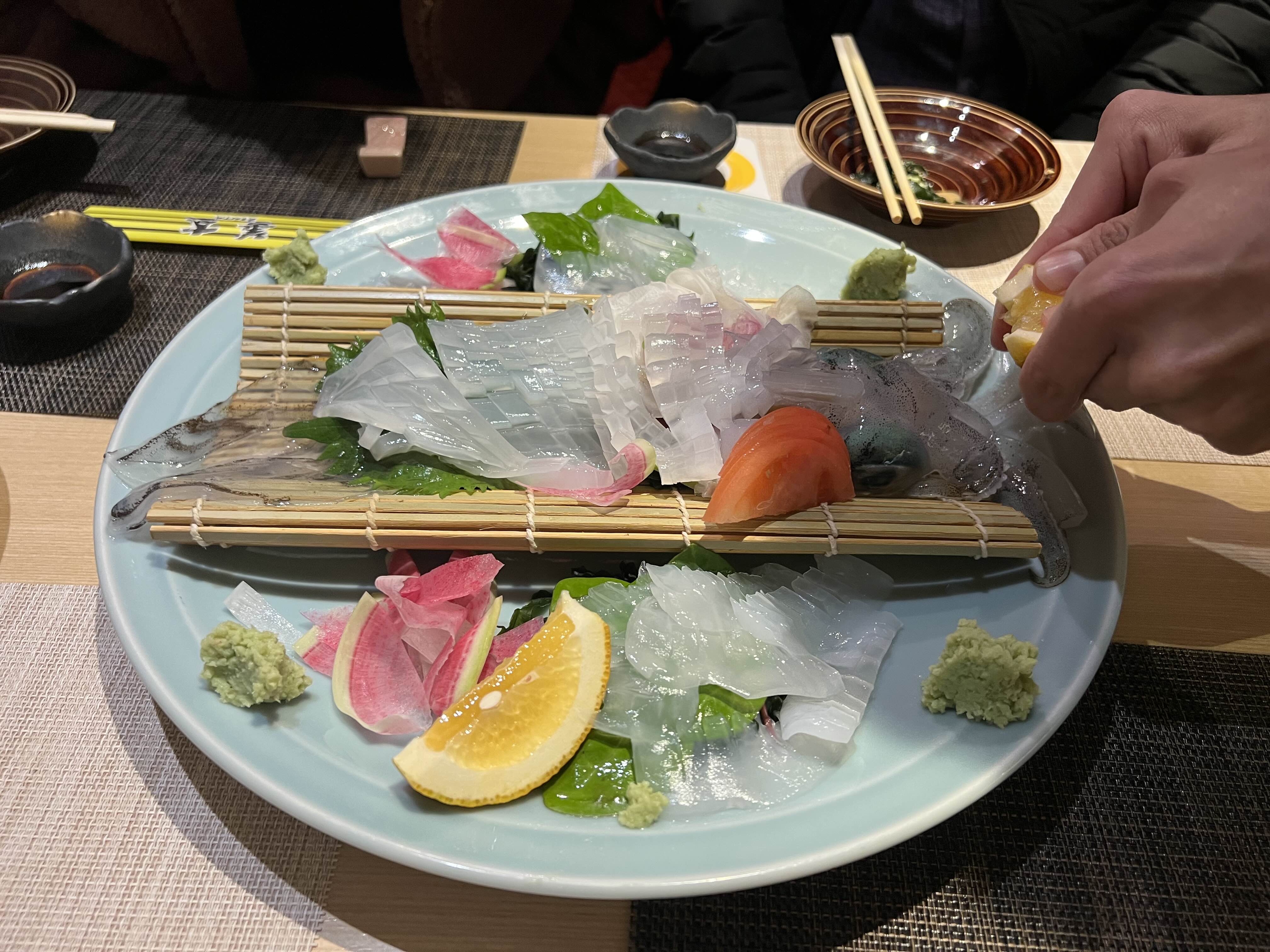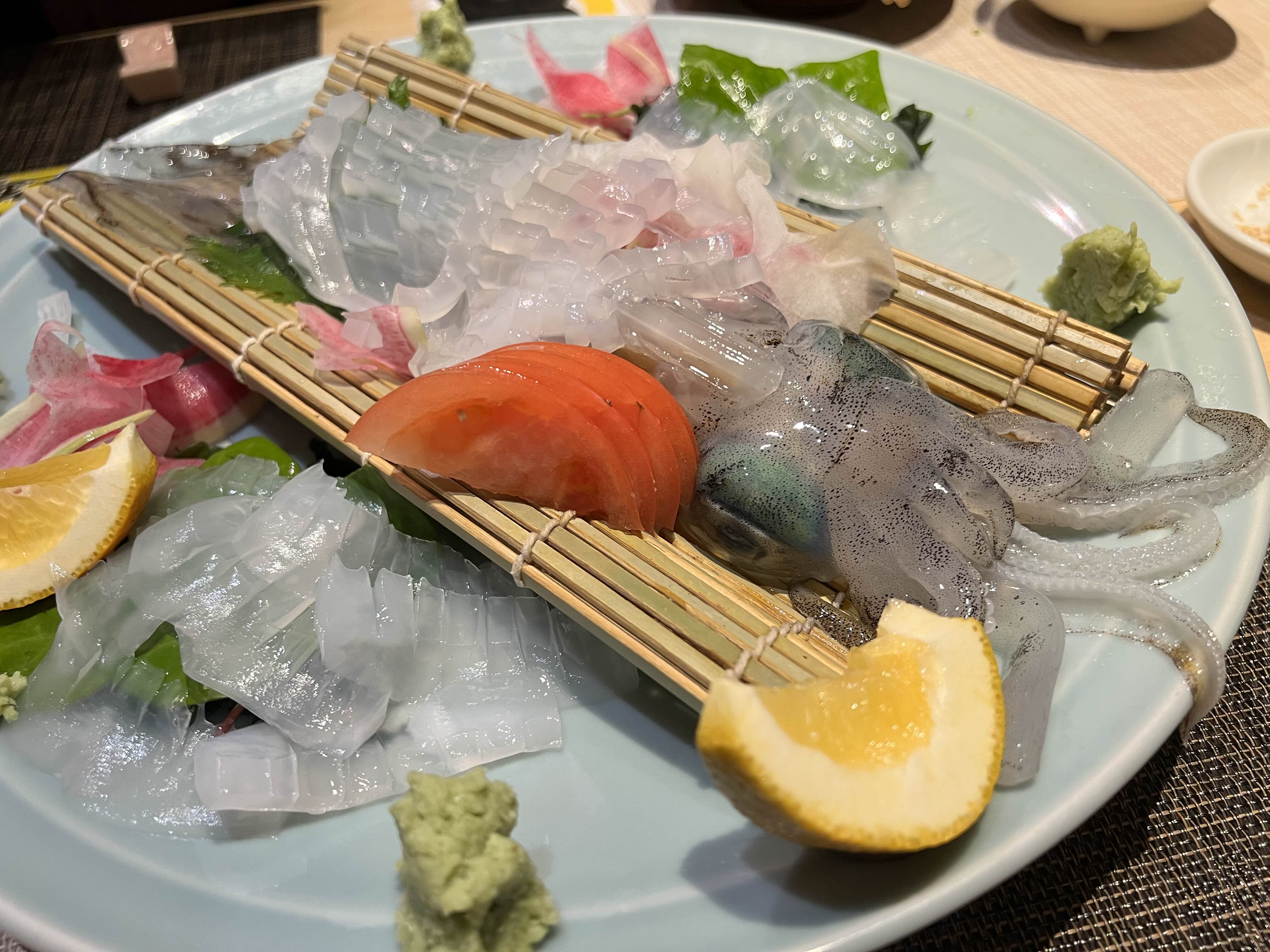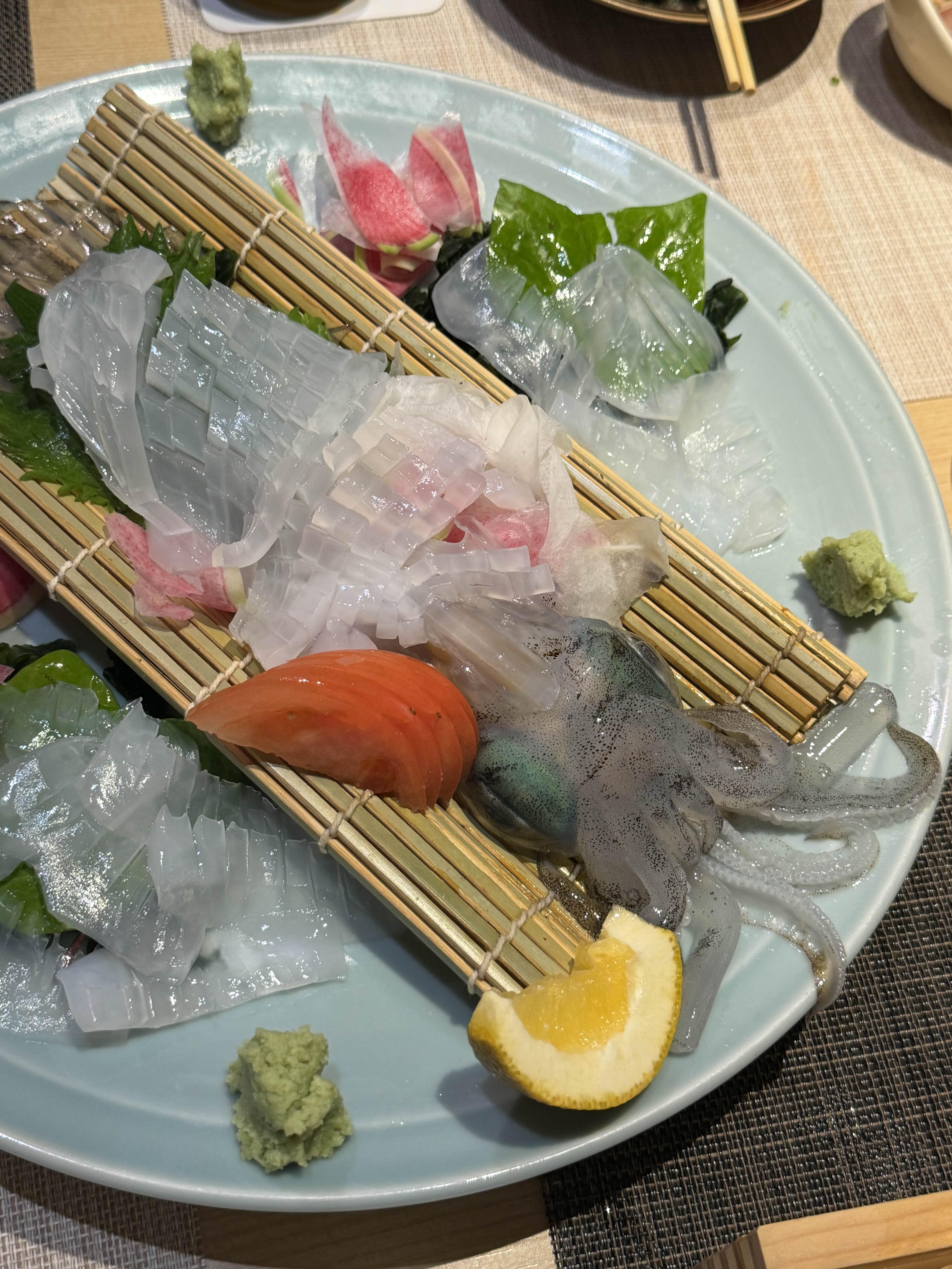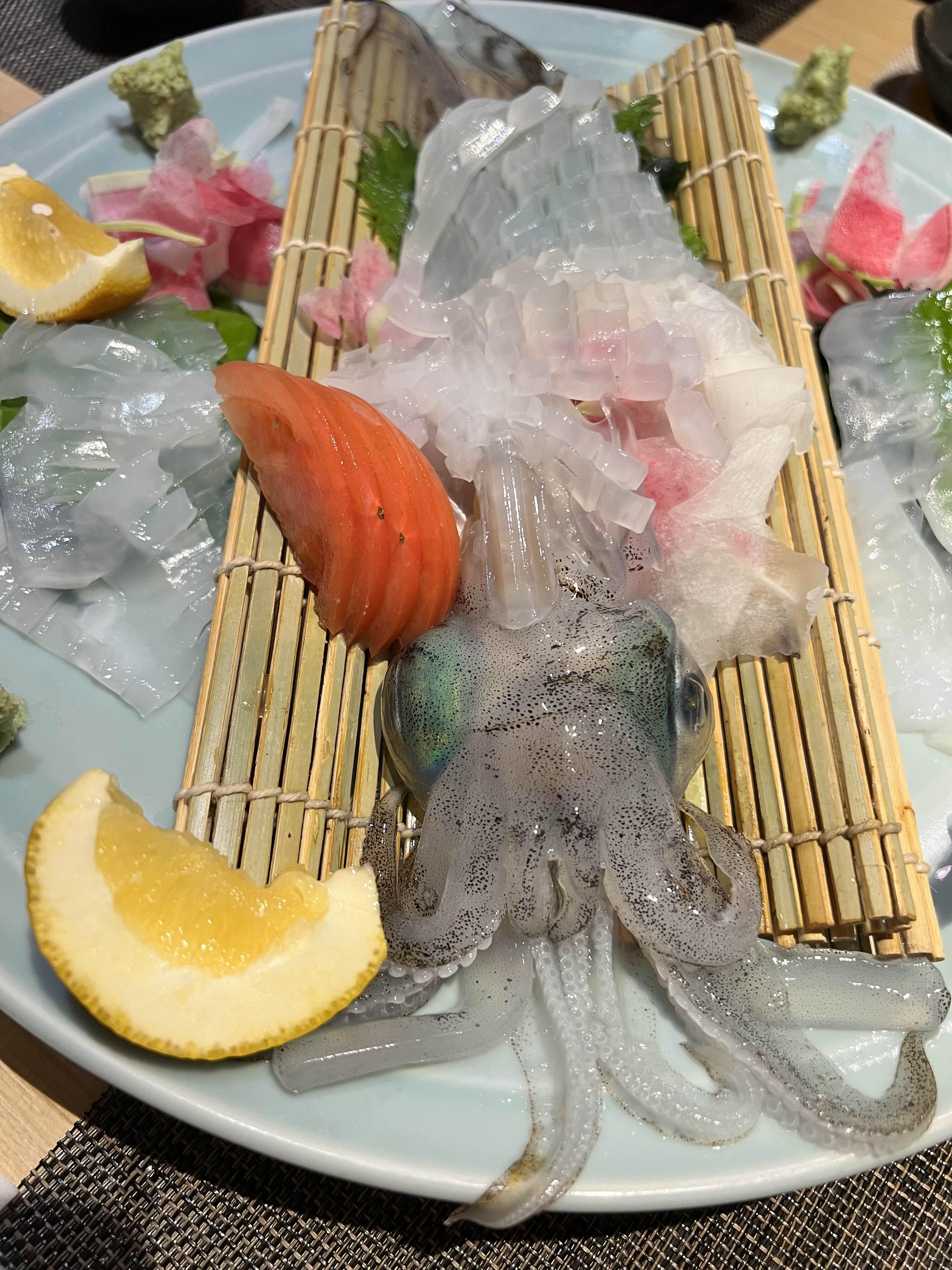 신기하게도 오징어의 눈 주변이 파랗더라고요. 구글에서도 찾아봤을 때 하카타 오징어회의 눈 주변이 파랬는데 실제로 보니까 너무 신기했습니다. 대신 오징어 다리는 짧아 보입니다. 오징어 모양대로 잘 썰려있고, 레몬즙을 짜서 오징어 다리에 뿌려주면 생오징어라 다리가 엄청 꼼지락 거립니다. 주방장이 직접 나와서 설명해 주고 들어가셨습니다. 아무래도 한국분들이 잘 오지 않는 식당인데 와서 잘 챙겨주시는 듯했습니다. 어떻게 찾아왔냐고 여쭤보기도 해서 구글맵으로 '오징어회'를 쳐서 왔다고 파파고로 알려드렸습니다.