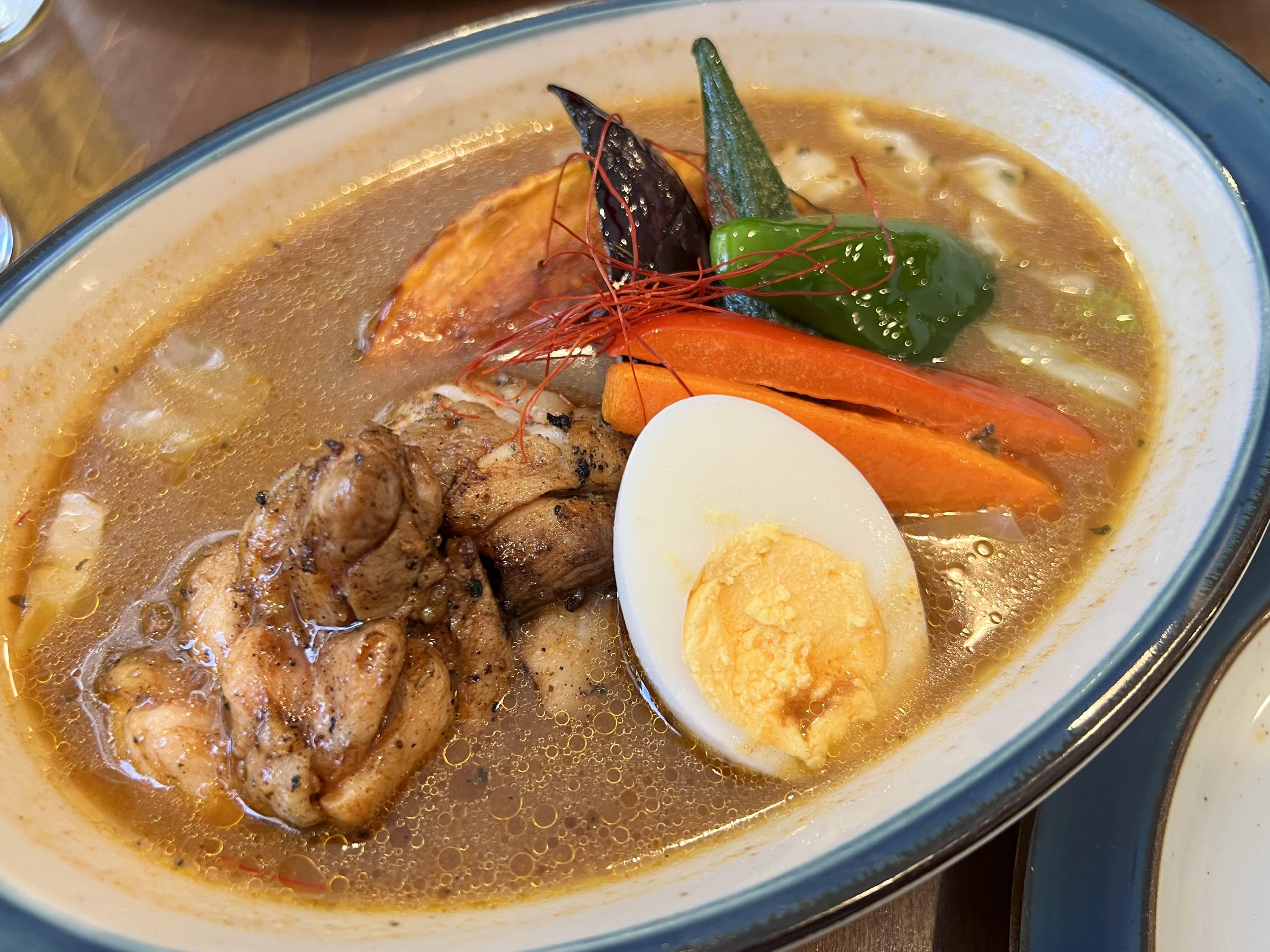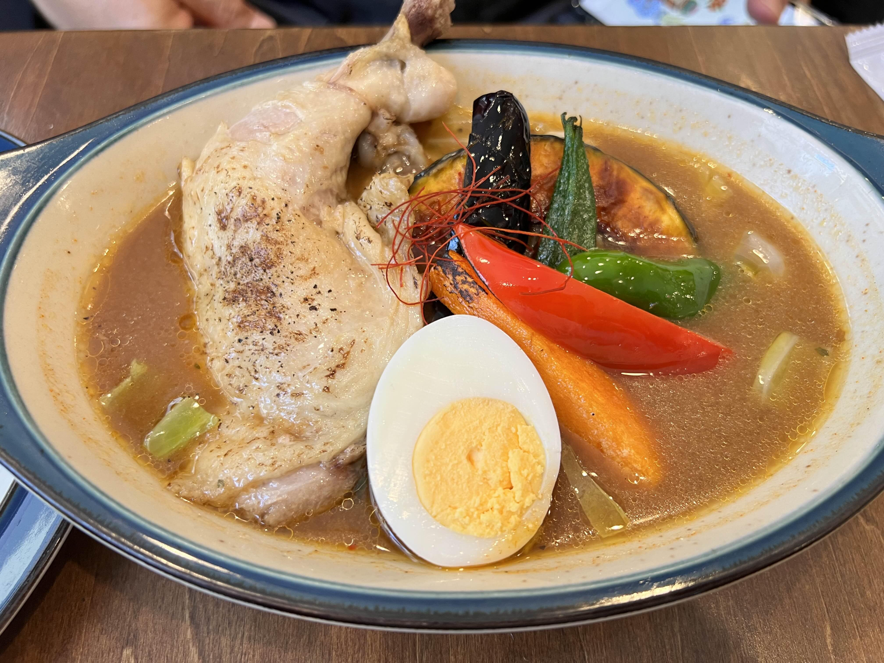 이건 닭다리 큰 거 1개가 들어가 있는 수프카레입니다. 약간 매운맛으로 주문했었어요. 닭다리를 좋아하시는 분들은 이걸로 추천드립니다. 사람들이 가장 많이 시키는 메뉴인 것 같아요. 유튜브에서도 닭다리가 들어간 수프카레를 먹는 분들 영상을 많이 봤었습니다.