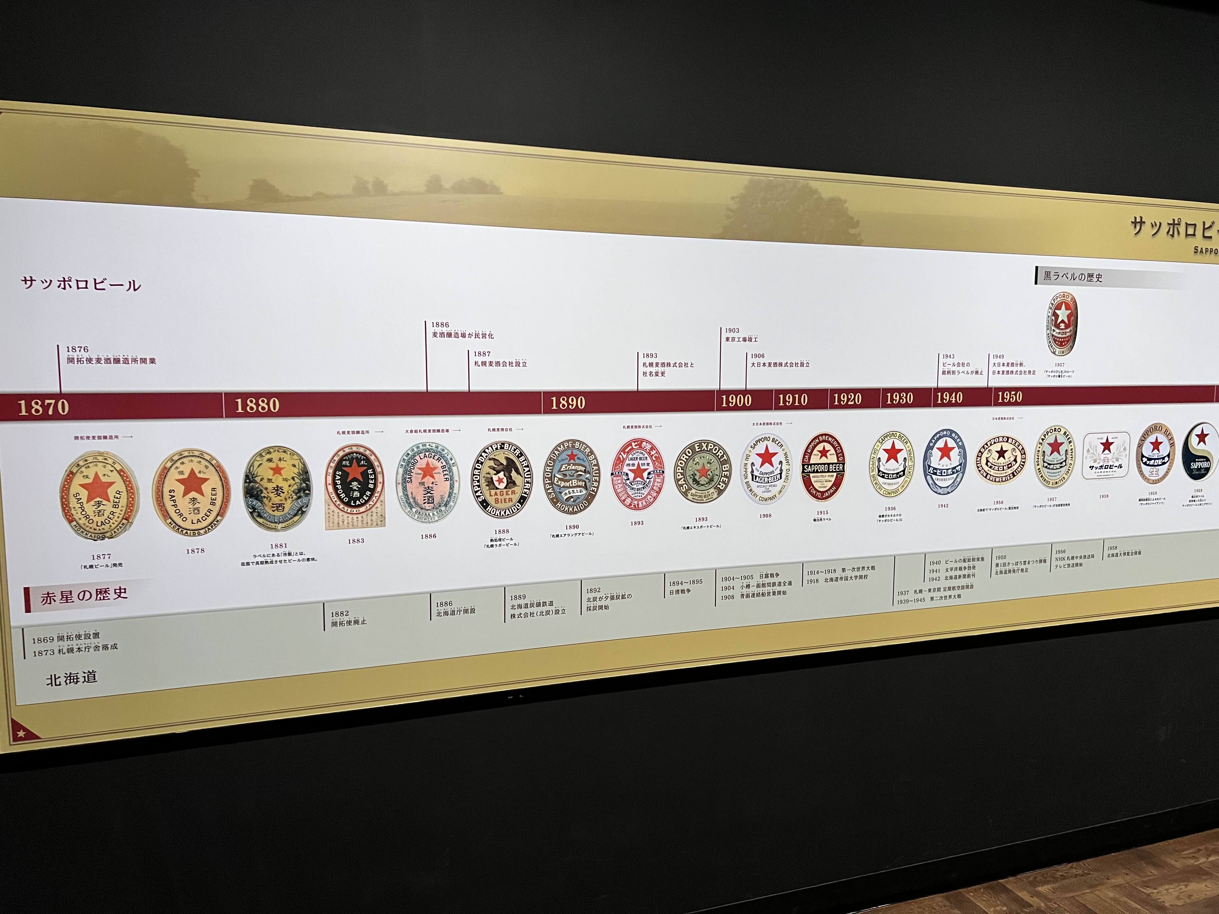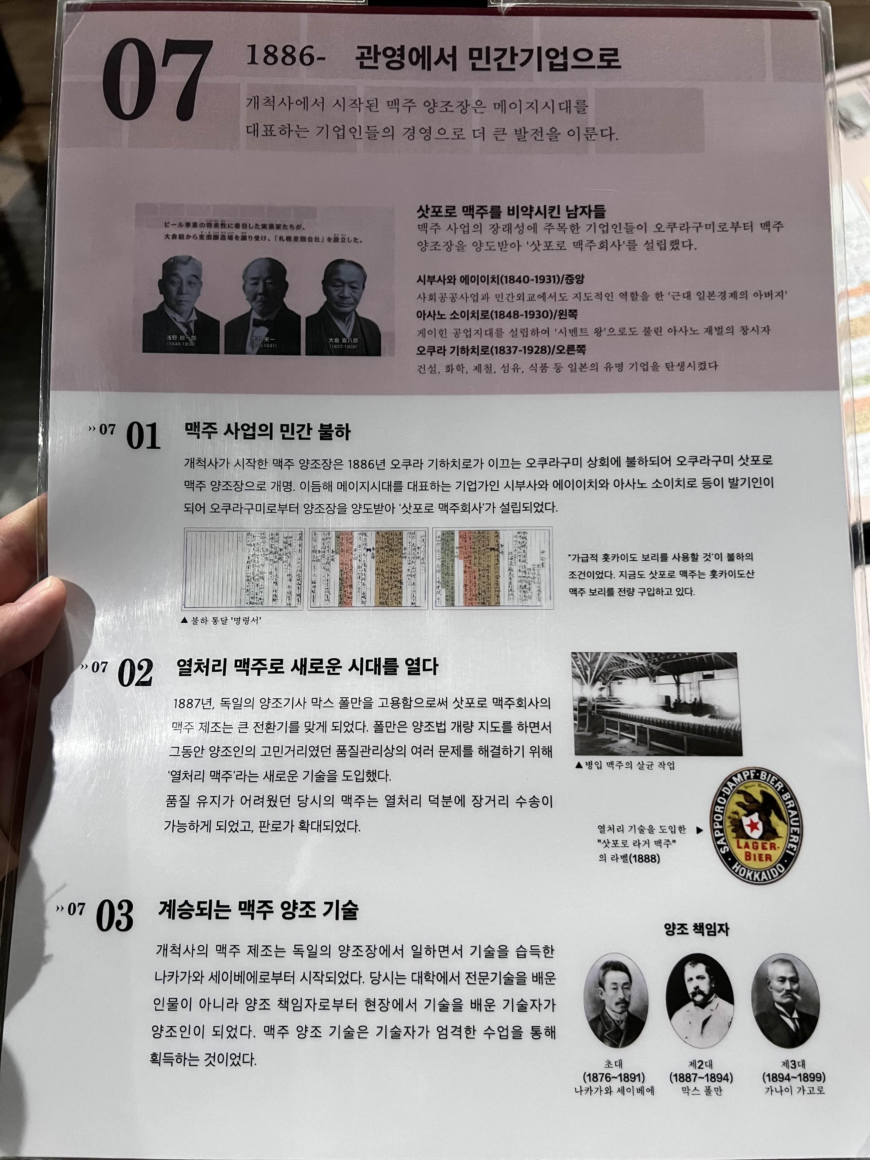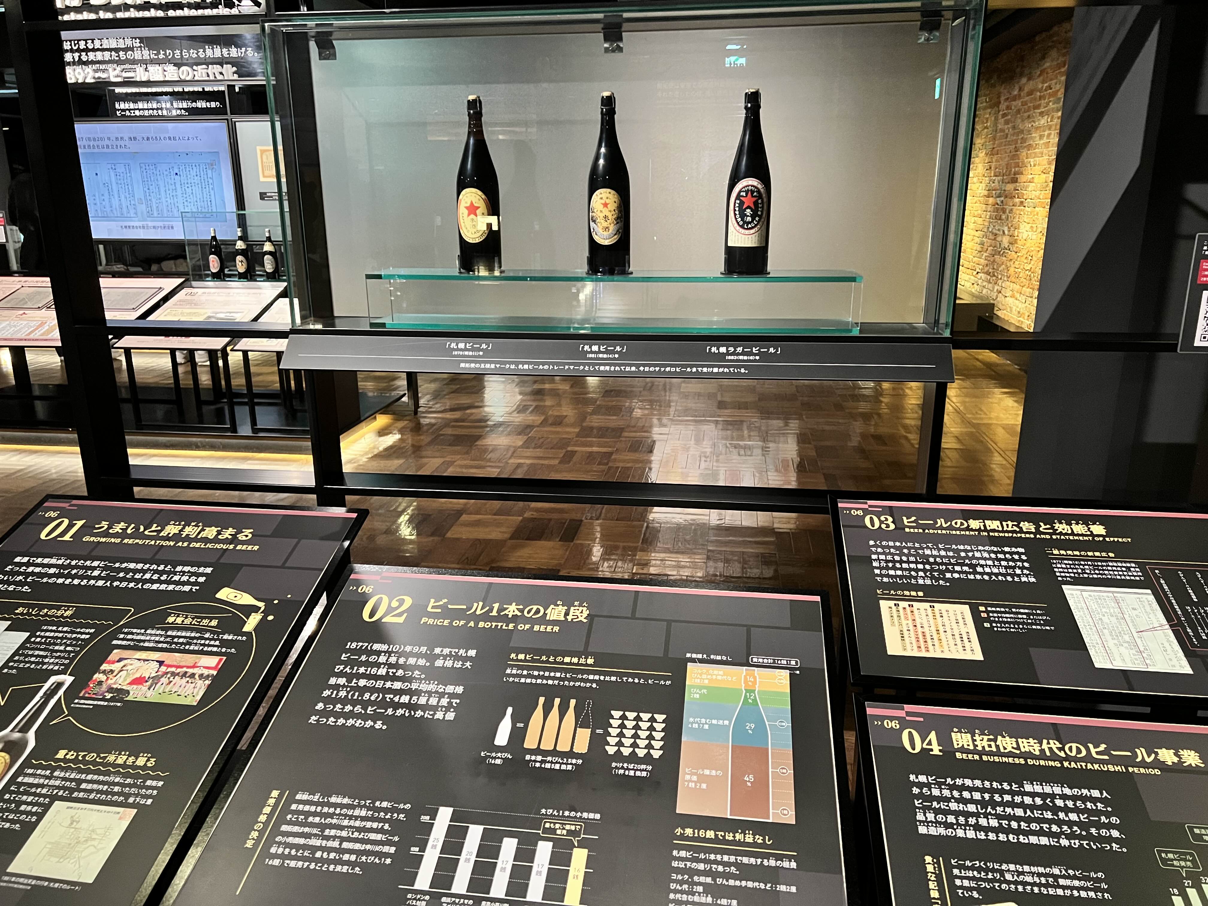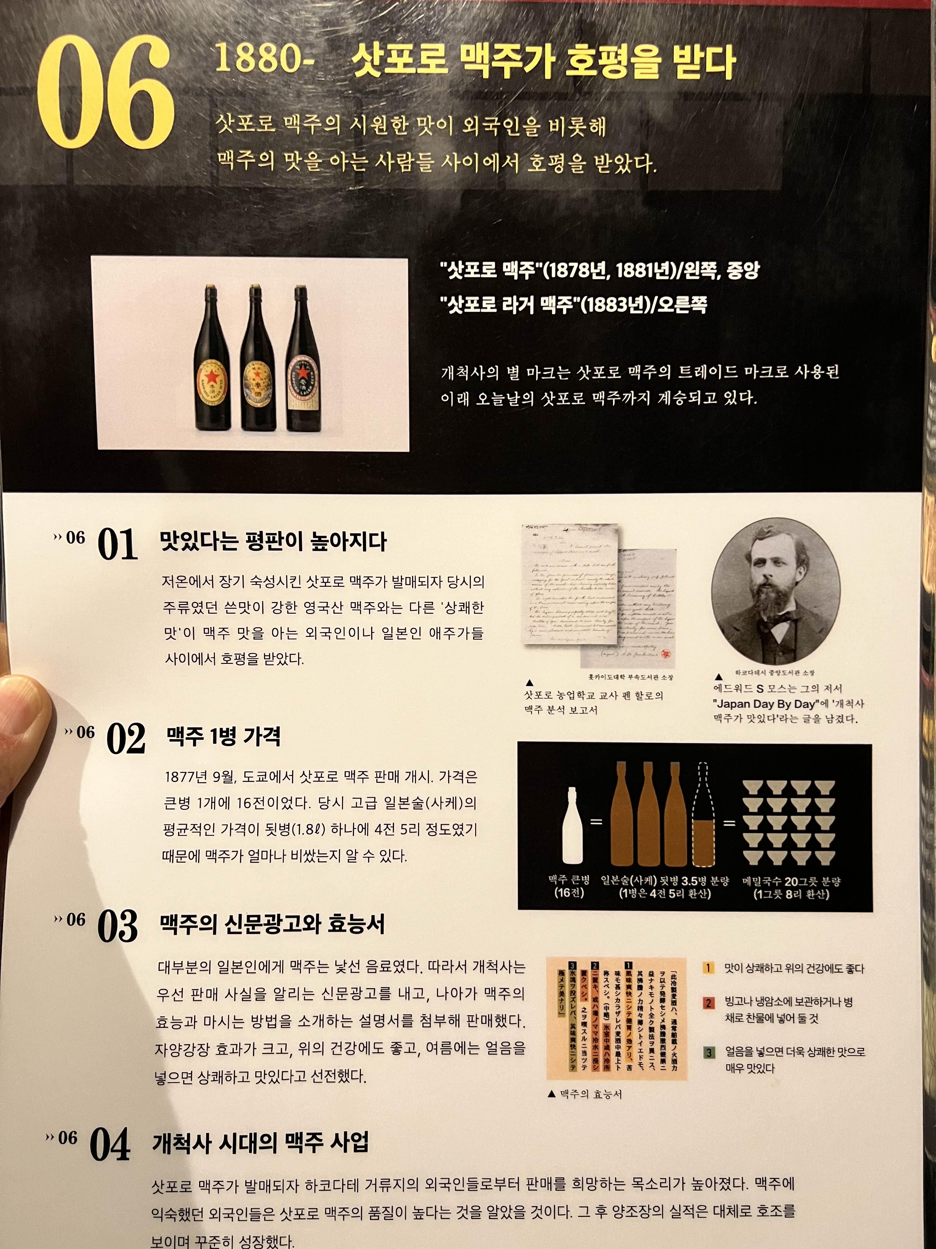 시대순으로 번호가 있어서 각 번호 챕터마다 아래 사진처럼 한국어로 내용이 있으니까 괜히 일본어로 들여다보지 마시고 빠르게 한국어로 읽고 넘어가시는 게 좋습니다. 옛날에는 맥주 1병 가격이 사케 3.5병 가격과 비슷했다고 합니다. 아주 고급술이었는데 이제는 대량화로 인해서 사케보다 저렴해졌습니다. 맥주병에 있는 패키지나 로고도 시대별로 많이 바뀌게 되는데 오래될수록 멋있게 느껴지더라고요. 맥주 덕분에 더 삿포로가 관광도시가 되지 않았나 싶습니다.