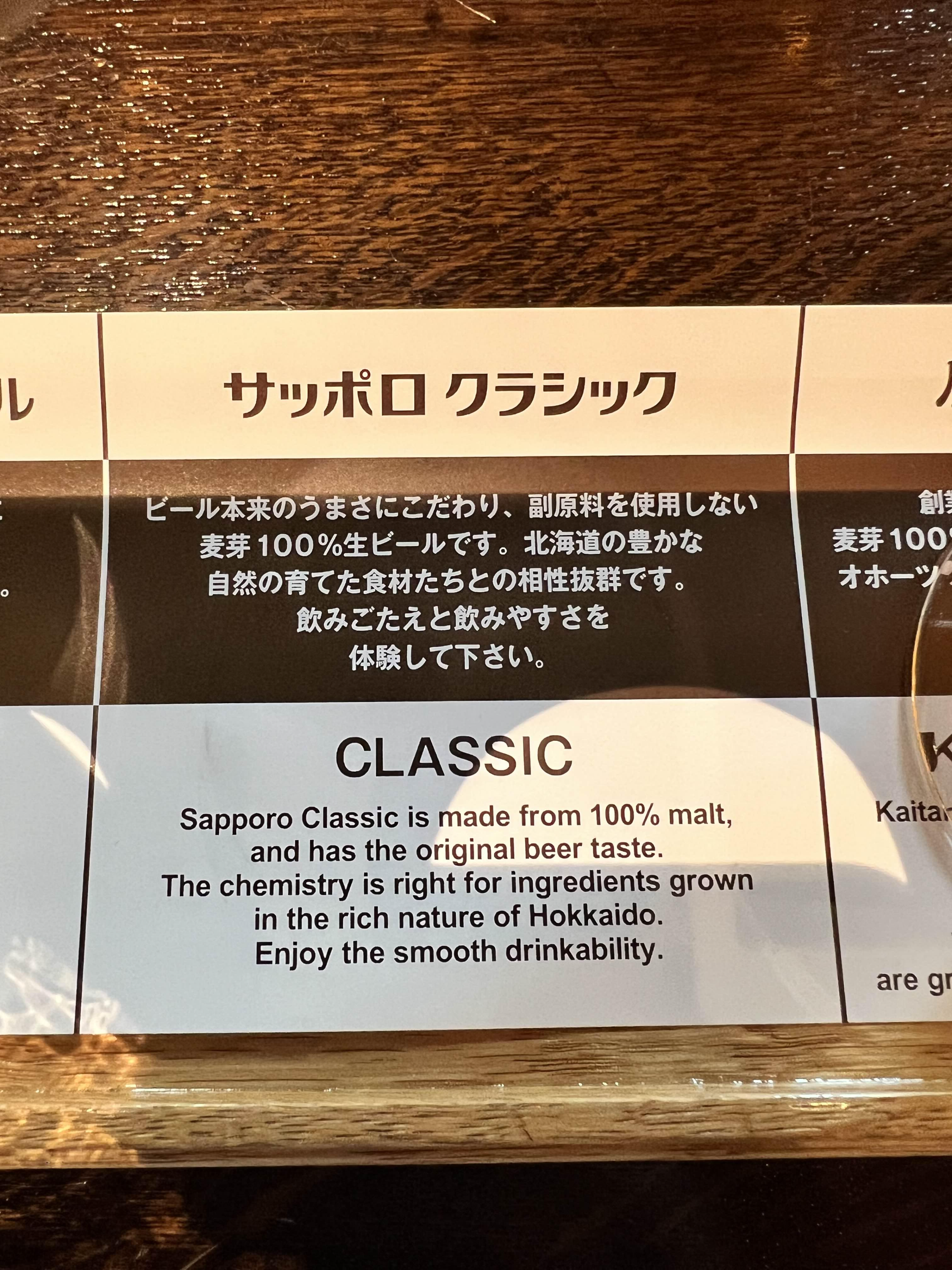 사진 왼쪽부터 블랙 라벨 - 클래식 - Kaitakushi 순서입니다. 개인적으로는 클래식이 가장 부드럽고 맛이 좋았습니다. 클래식과 비교하면 블랙라벨은 조금 더 거친 느낌이고 kaitakushi는 홉향이 느껴지는 맥주입니다. 천천히 비교해 가면서 음미하시면 좋을 것 같아요. 과자 안주도 하나 시켰는데 맛이 좋았어요. 돈키호테에 갔을 때 보여서 왕창 사가지고 왔습니다.