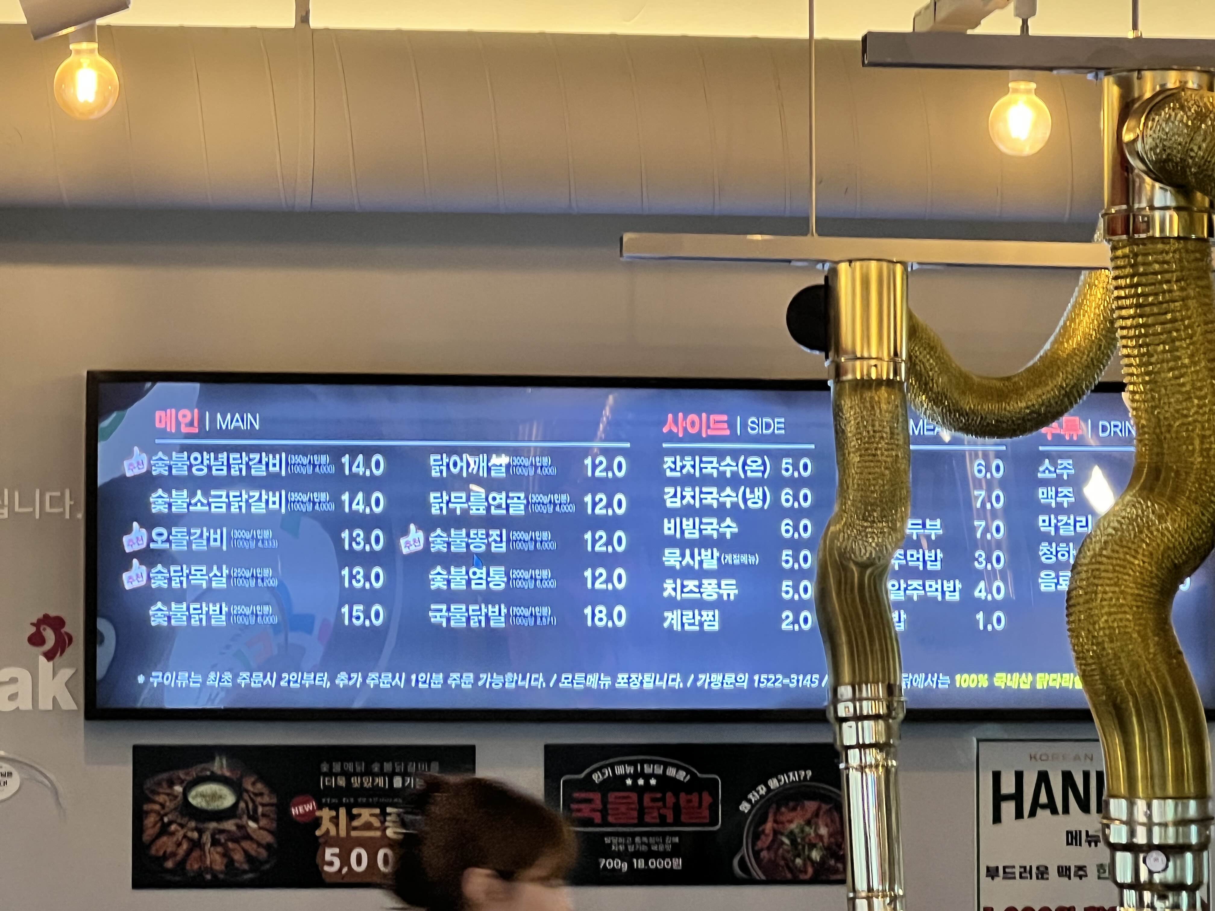 메뉴: 숯불닭갈비 양념/소금, 숯목갈비, 오돌갈비, 숯불똥집