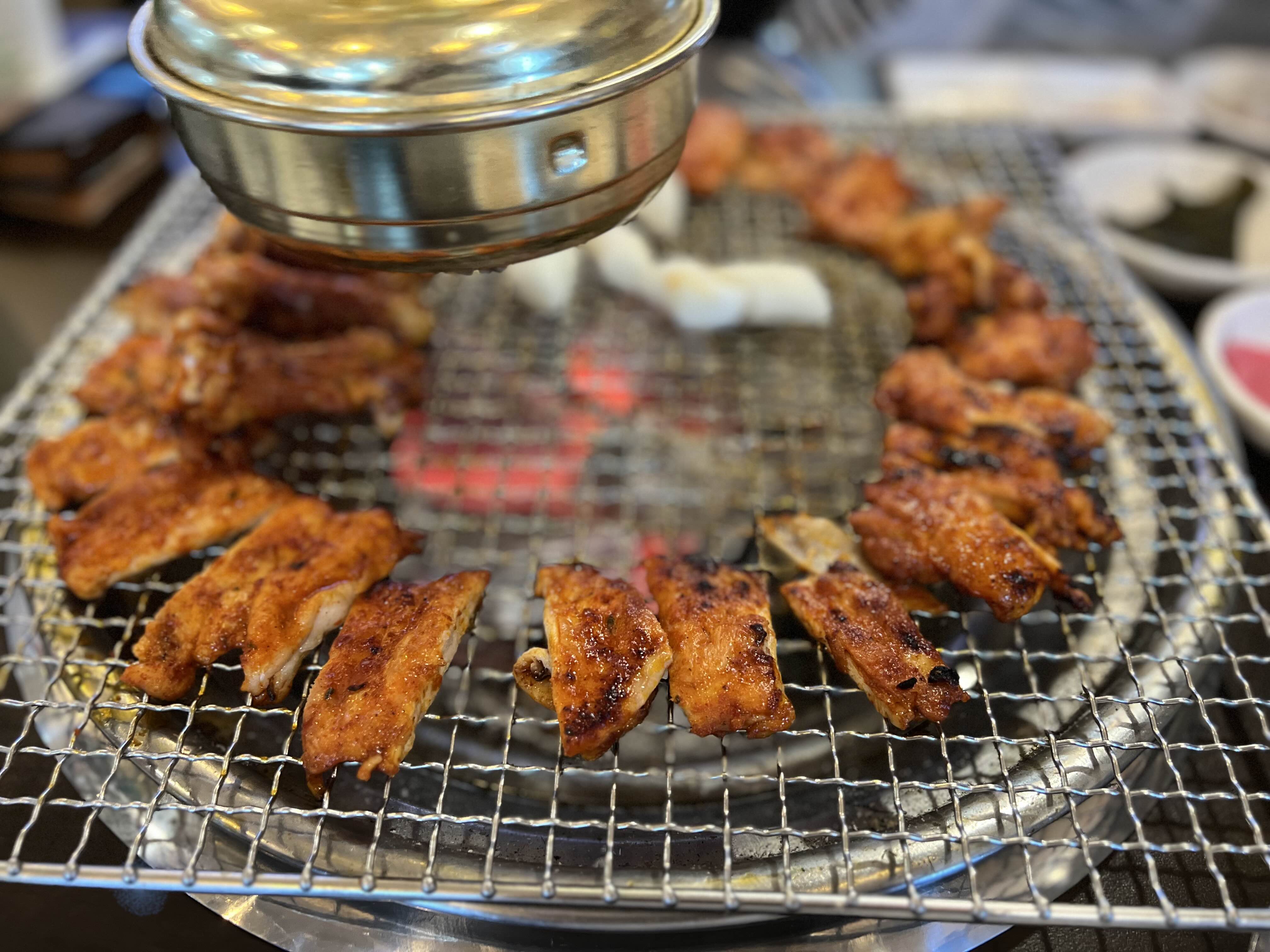 숯불의 열기 때문에 조금 더울 수 있어요. 그래서 얼굴은 최대한 숯불과 멀리해서 드시기 바랍니다. 가래떡도 올려져 있는데 고기만 먹을 때 하나씩 먹어주면 고소하니 맛있어요! 2명이서 갔을 때 이렇게 2인분에 날치알주먹밥 시키면 딱 맞는 것 같아요.