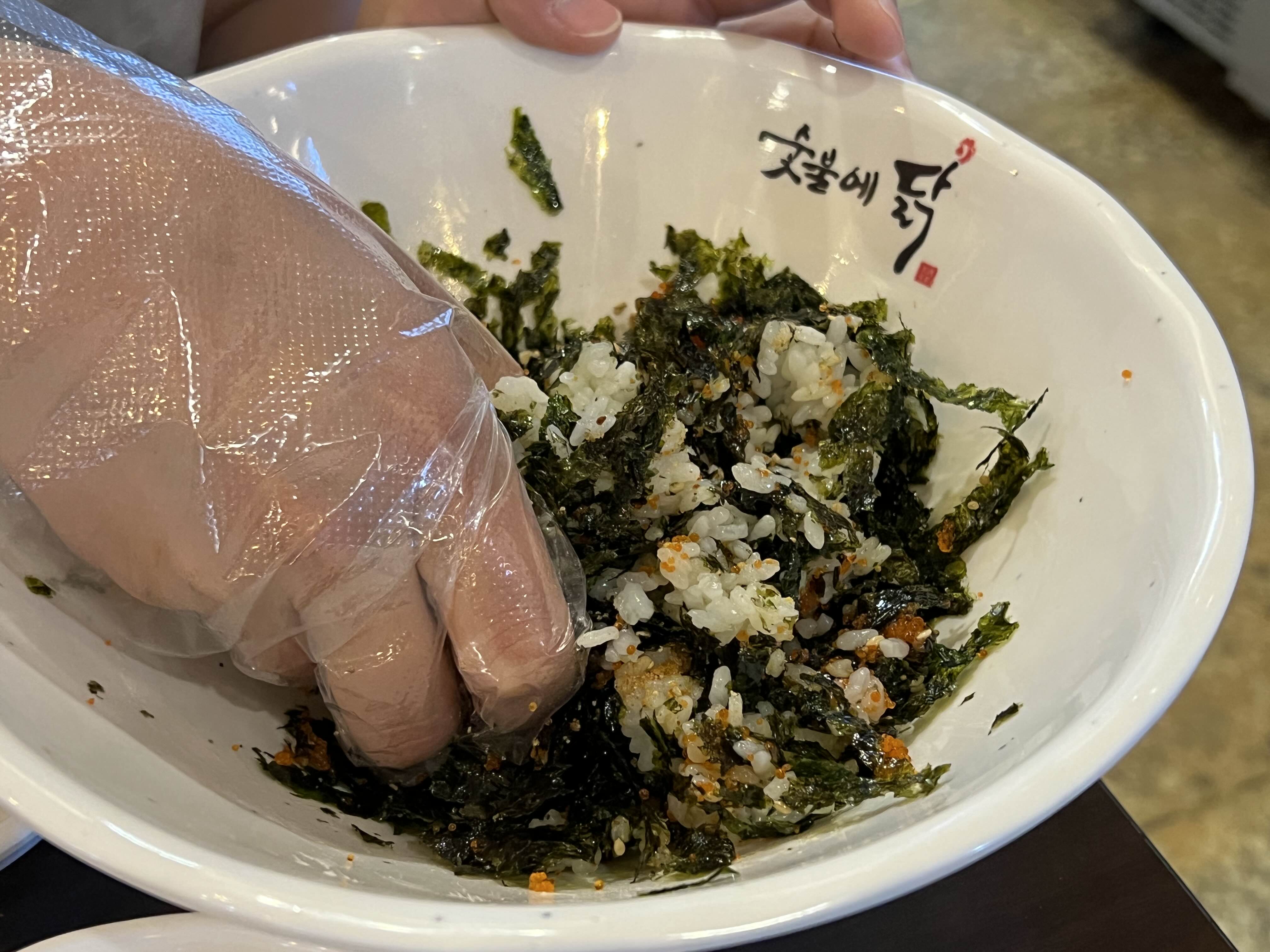 날치알 주먹밥도 도착해서 장갑 끼고 열심히 비벼서 먹었어요. 조금 먹다 보면 드디어 초벌 된 닭갈비가 도착을 합니다.