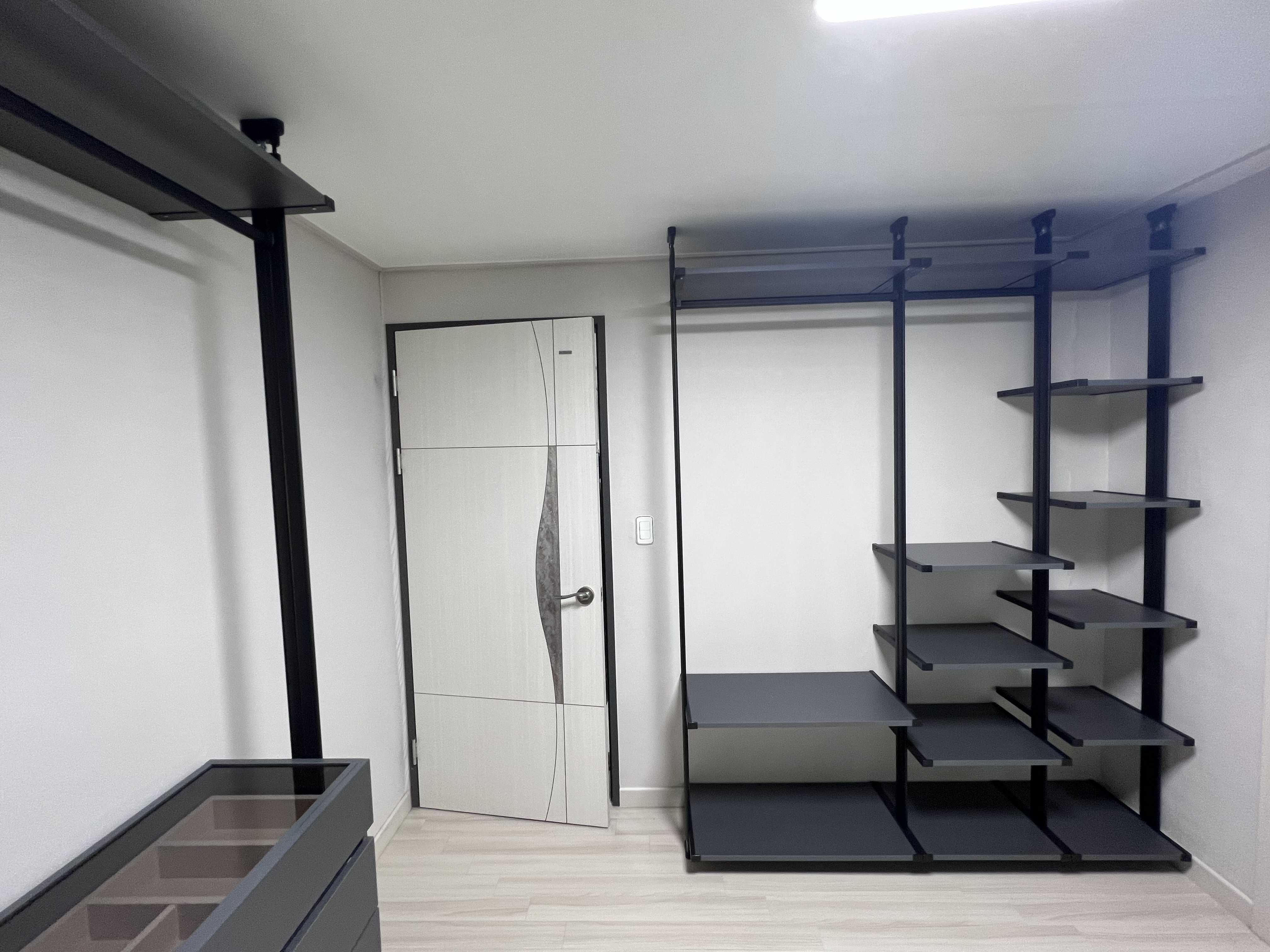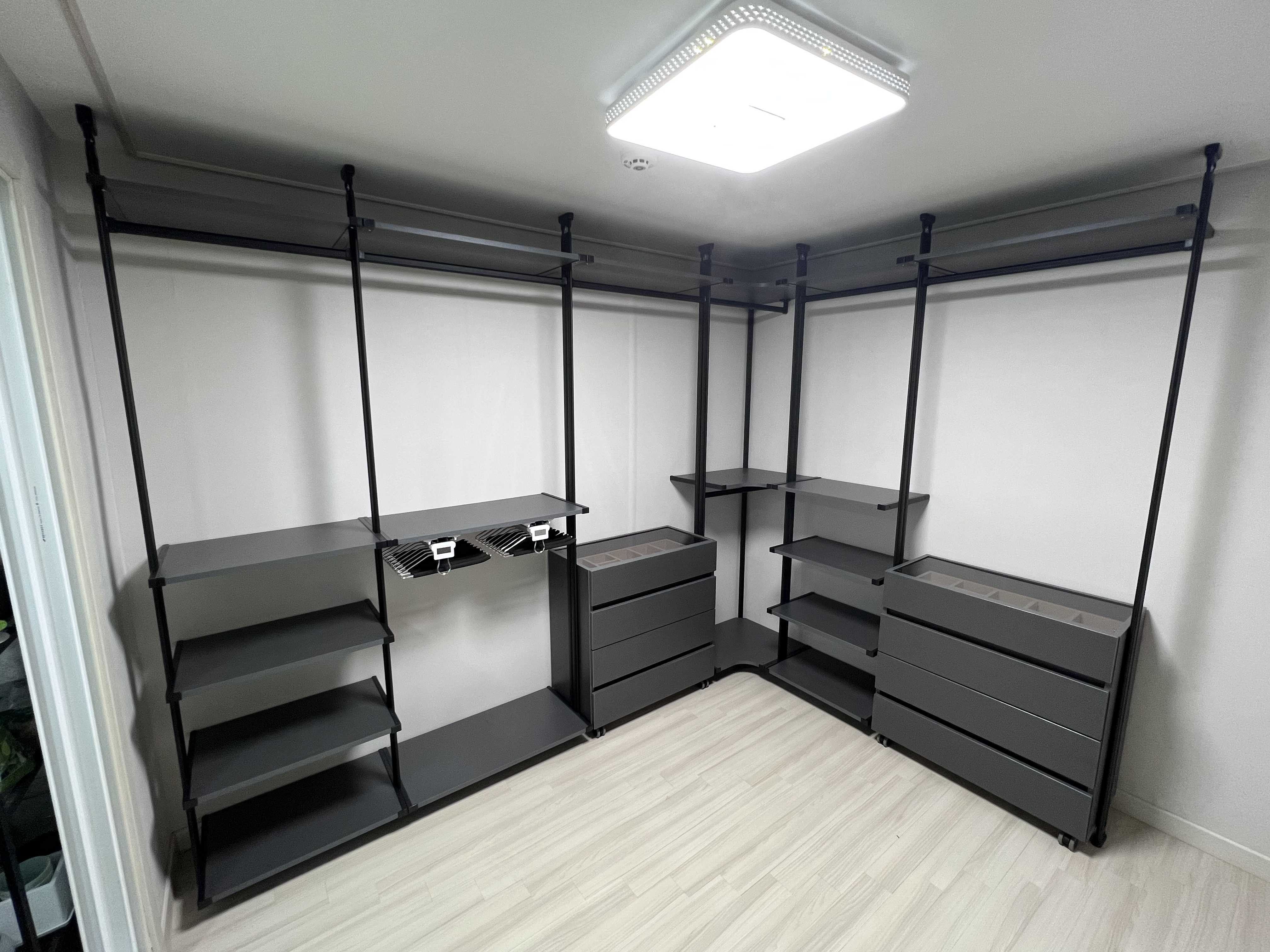 백패킹을 해서 따로 튼튼한 선반을 설치할까도 했지만 한 공간안에 이질감이 느껴질 수 있어서 통일감있게 시스템행거로 설치하였다.