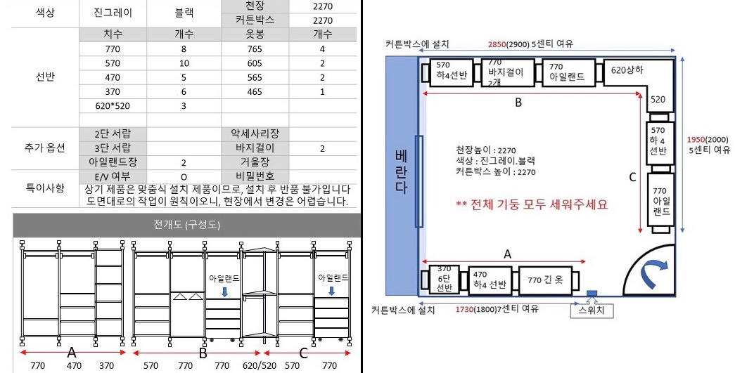 기본적으로 업체마다 구성은 비슷하다. 따라서 업체를 알아보기 전에 구성을 어떻게 할지 정하고 방사이즈를 측정해서 미리 평면도를 그려보면 좋다. 방이 넓다면 거울도 넣고 화장대도 넣으면 좋겠지만 크지 않은 방이라면 다른 옵션들 보다 옷걸이랑 선반을 많이 두도록 하자. 그리고 바지걸이를 따로 옵션으로 넣었는데 정말 실망을 많이 했다. 바지걸이 간격이 좁기도 해서 걸기도 어려웠고 가벼운 바지는 다른 바지를 꺼내다가 흘러내리기가 일수다. 옷걸이를 따로 좋은 것을 사는 것을 추천한다. 천장이 높다면 상부에 또 물건을 올려둘 수 있으므로 이불이나 잘 입지 않는 옷을 보관하면 좋다. 상부 공간이 작다면 신발을 두거나 작은 짐을 올려야 한다.