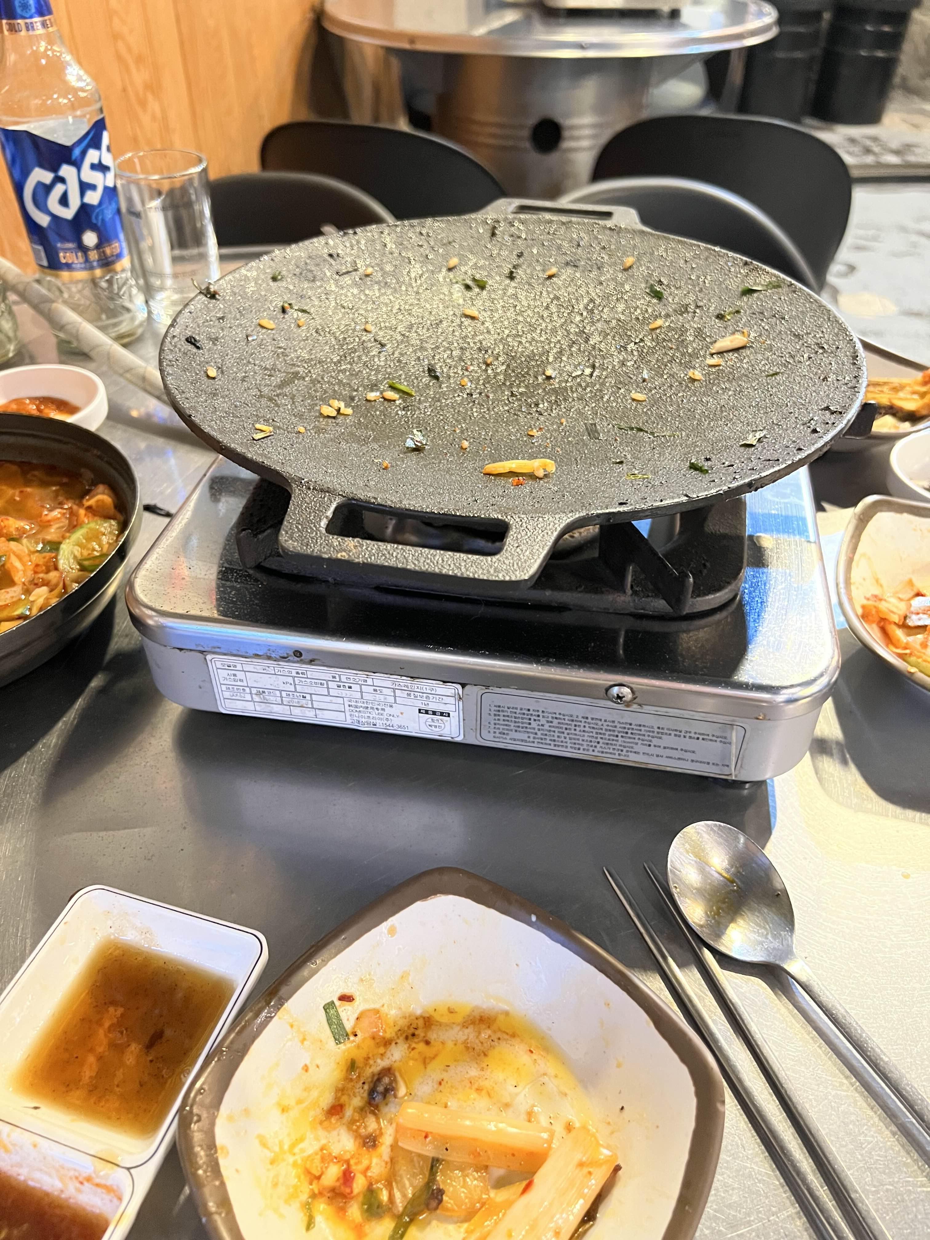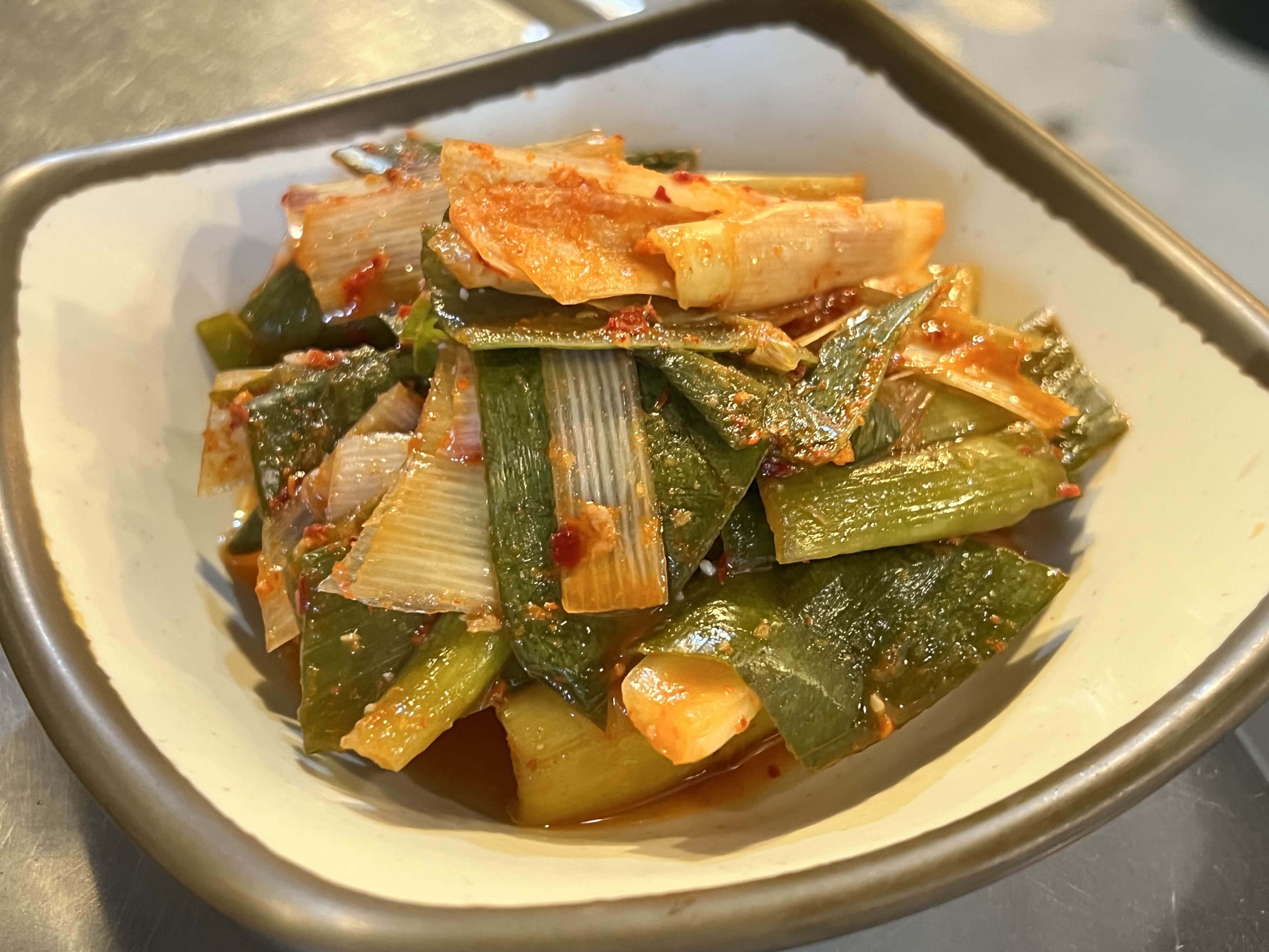 파김치가 나오는데 같이 불판에 올려서 구워 먹기도 하고 따로 먹기도 합니다. 저는 좀 덜 느끼하게 먹기 위해서 안 구워 먹는 게 좋습니다. 그래서 파김치 다 올리면 새로 하나 더 달라고 요청합니다. 다 불판에 올려버리면 다 느끼해져서 많이 먹을 수가 없어요.