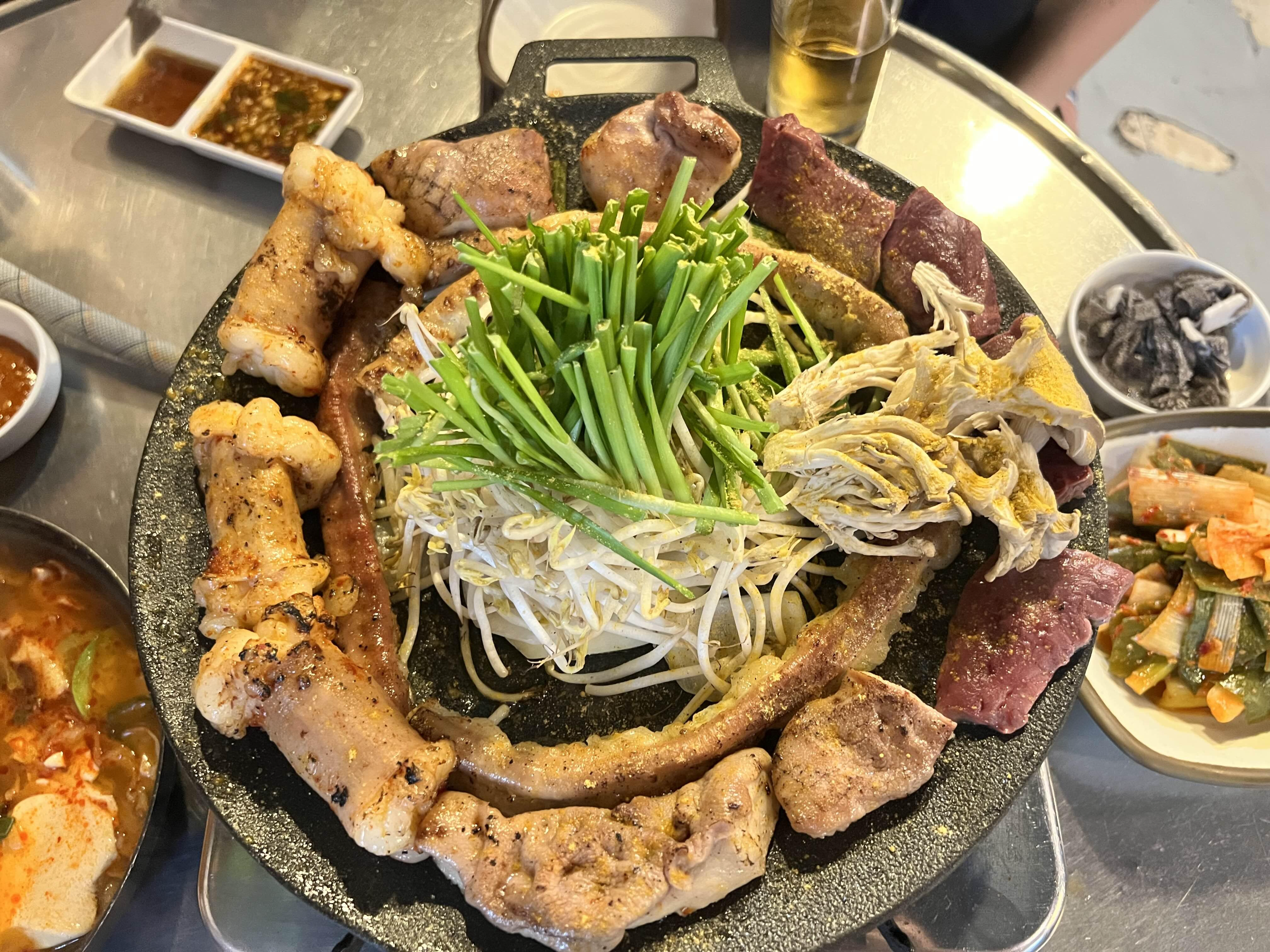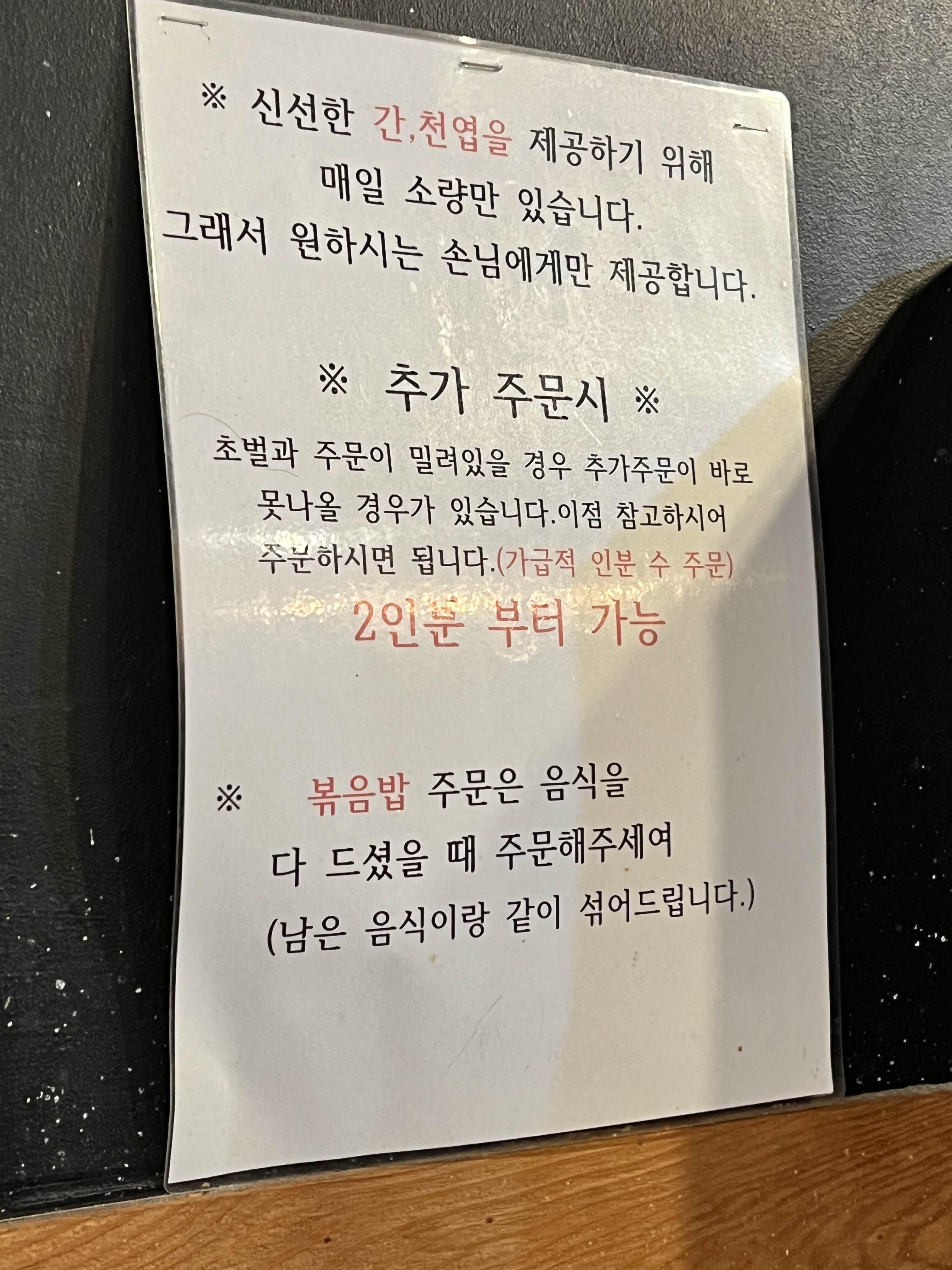 신선한 간과 천엽을 주시는데 안 먹을 이유가 없겠죠? 저희는 보통 가면 모둠구이를 주문합니다. 2명이서 가서 모둠구이 다 먹고 볶음밥도 먹고 나올 수 있는 양입니다. 참고해 주세요. 소곱창은 배불러서 못 먹기보다 느끼해서 더 안 들어가는 느낌입니다.