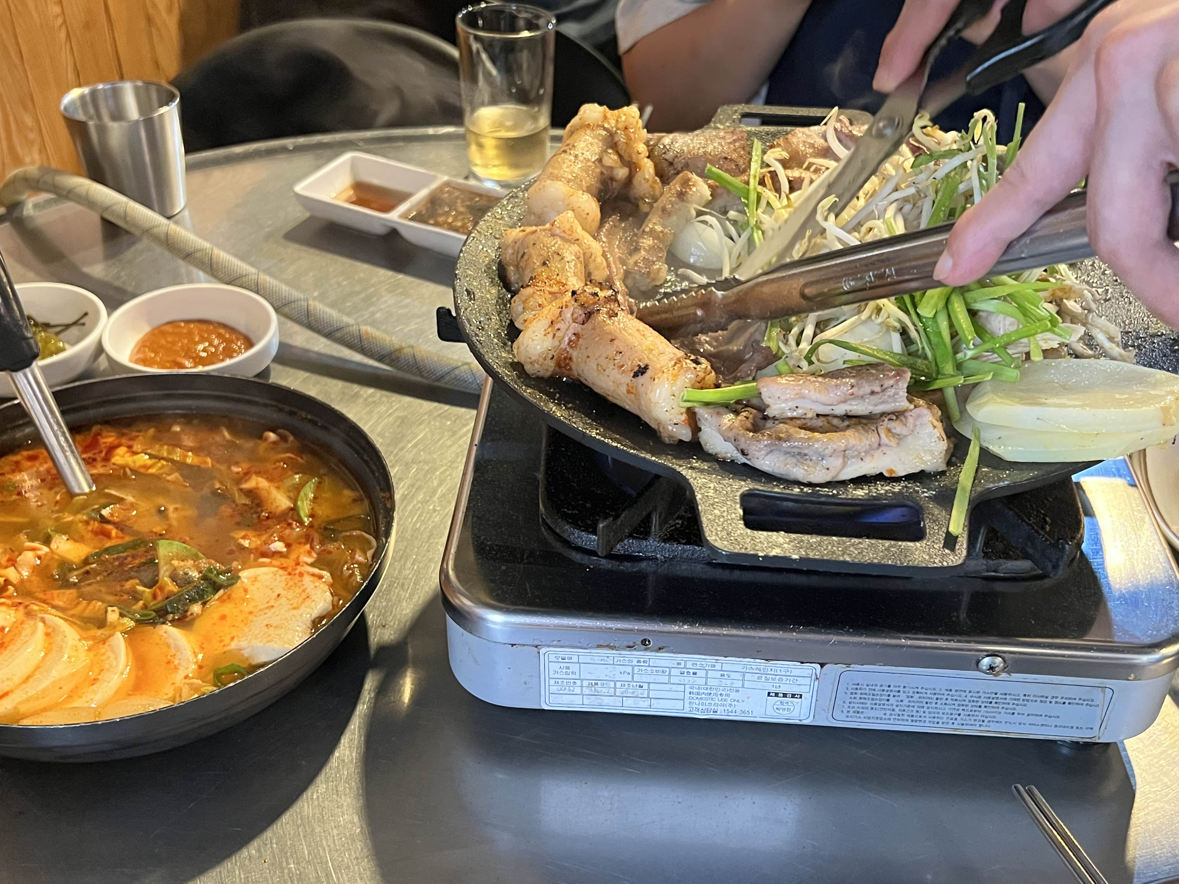 모둠구이가 준비되기 전까지 이렇게 순두부찌개를 끓여주시기 때문에 한잔하면서 순두부찌개 먹고 기다리면 됩니다.