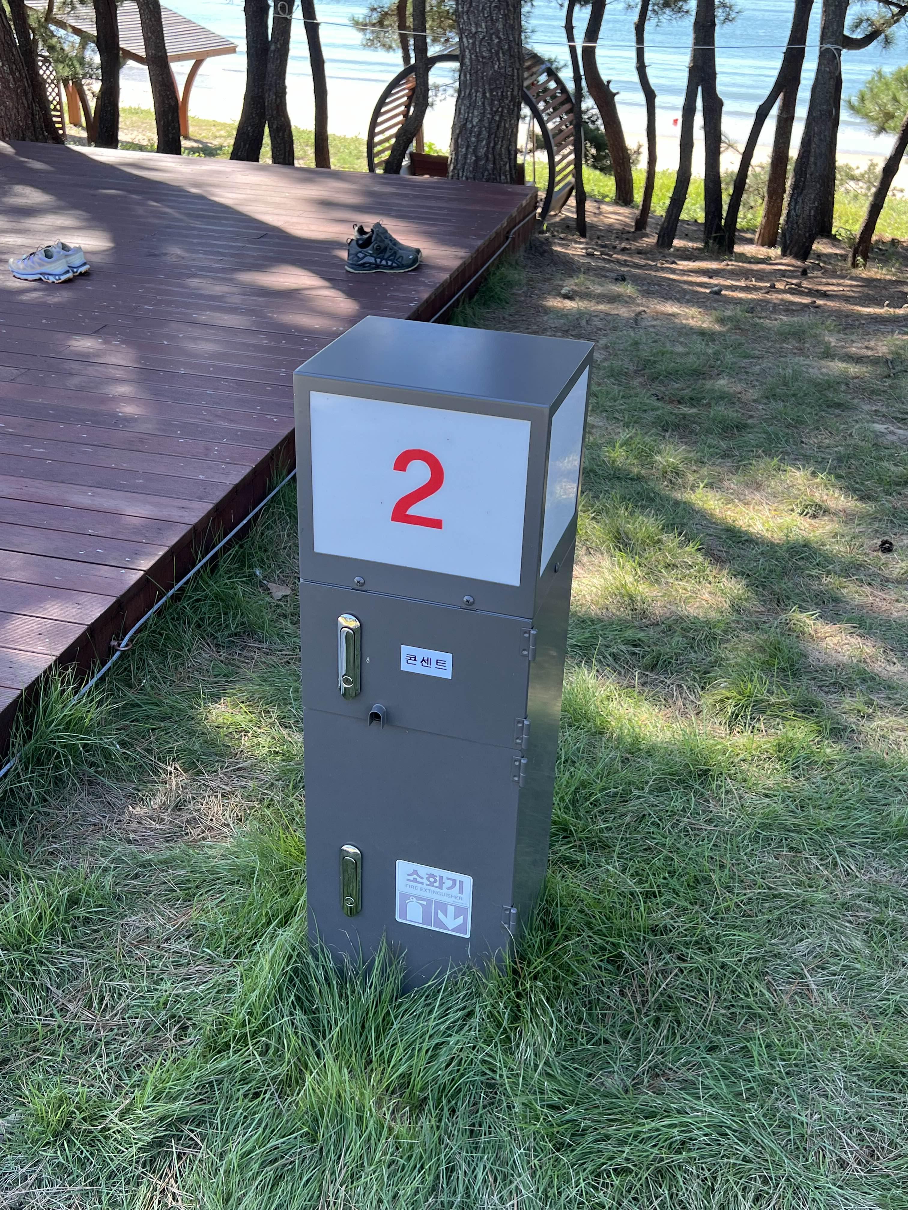 이렇게 사이트마다 콘센트랑 소화기가 있어요. 관리자분이 오셔서 열어주십니다. 저희는 충전할 것이 없어서 사용하지는 않았는데 장박을 하시거나 오토캠핑하시는 분들은 요긴하게 쓰시는 것 같습니다!