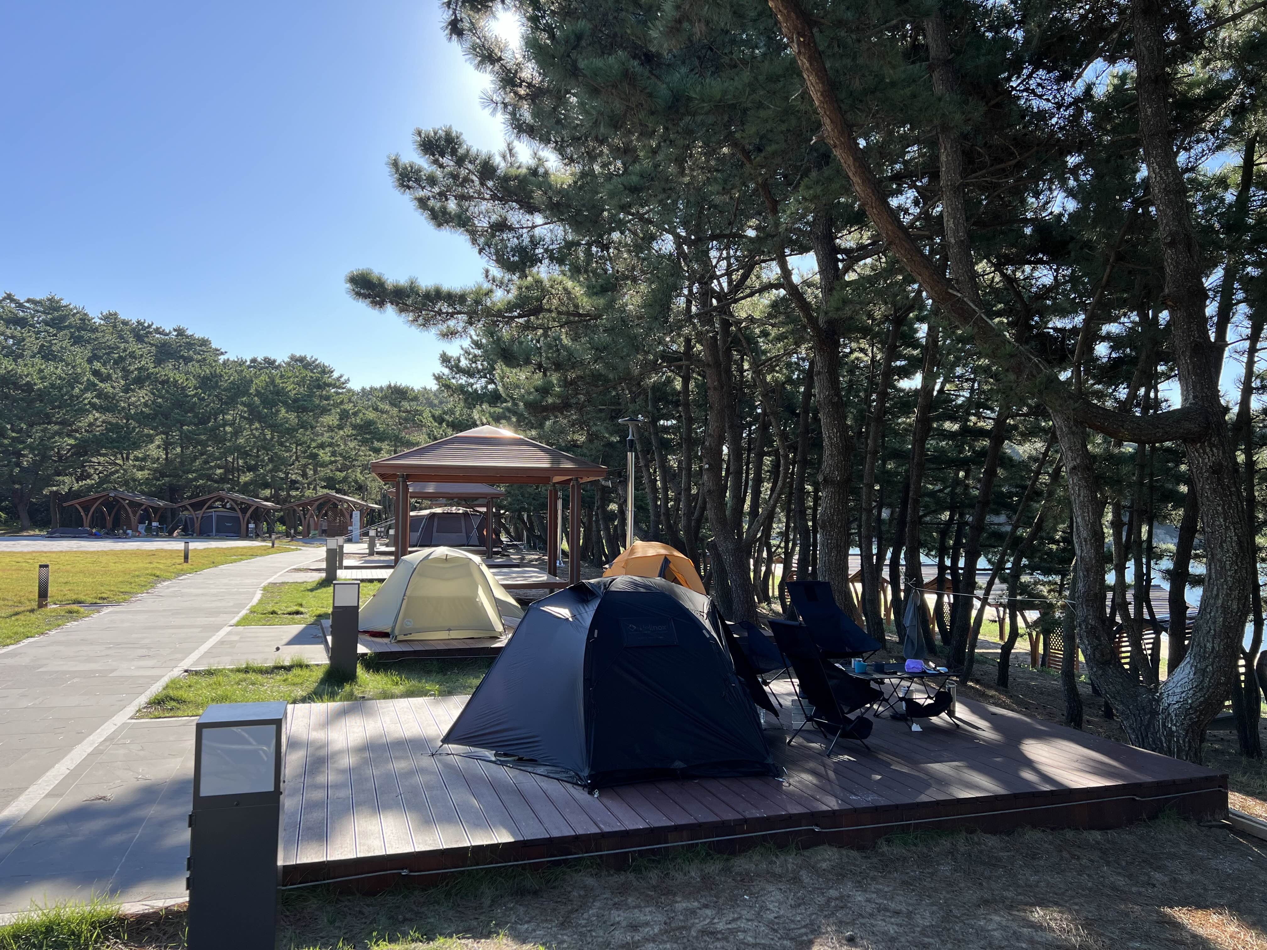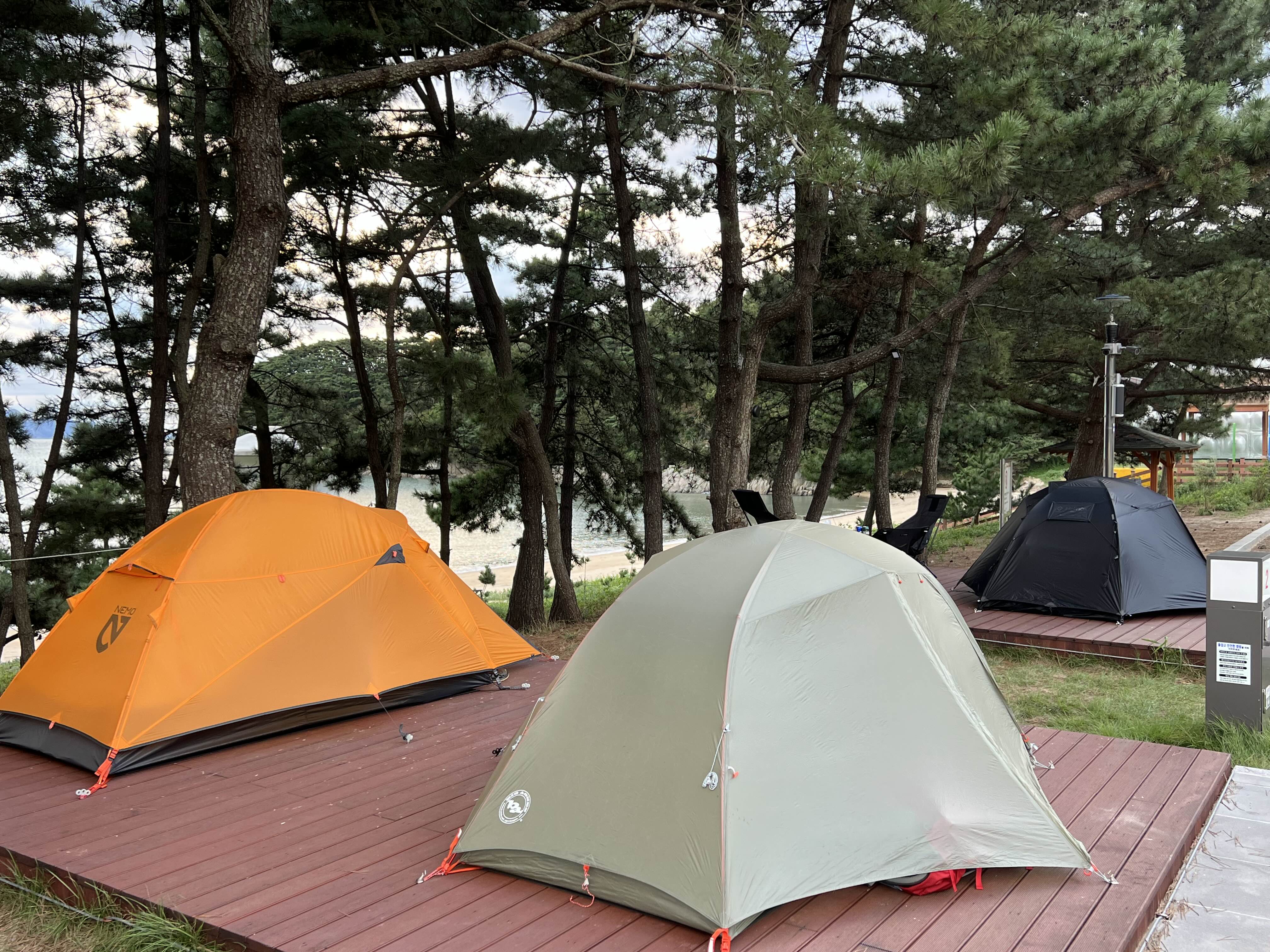 3명이서 갔기 때문에 한 사이트에 2개, 다른 사이트에 1개를 치고 공용공간으로 사용했습니다. 그리고 옆에 정자가 있어서 물건을 올려놓거나 쉬기도 좋았어요. 사람들이 많이 없다면 정자에서 식사를 하거나 쉬는 것도 좋을 것 같아요! 정자 위치도 고려해서 자리 잡아도 좋을 것 같아요!