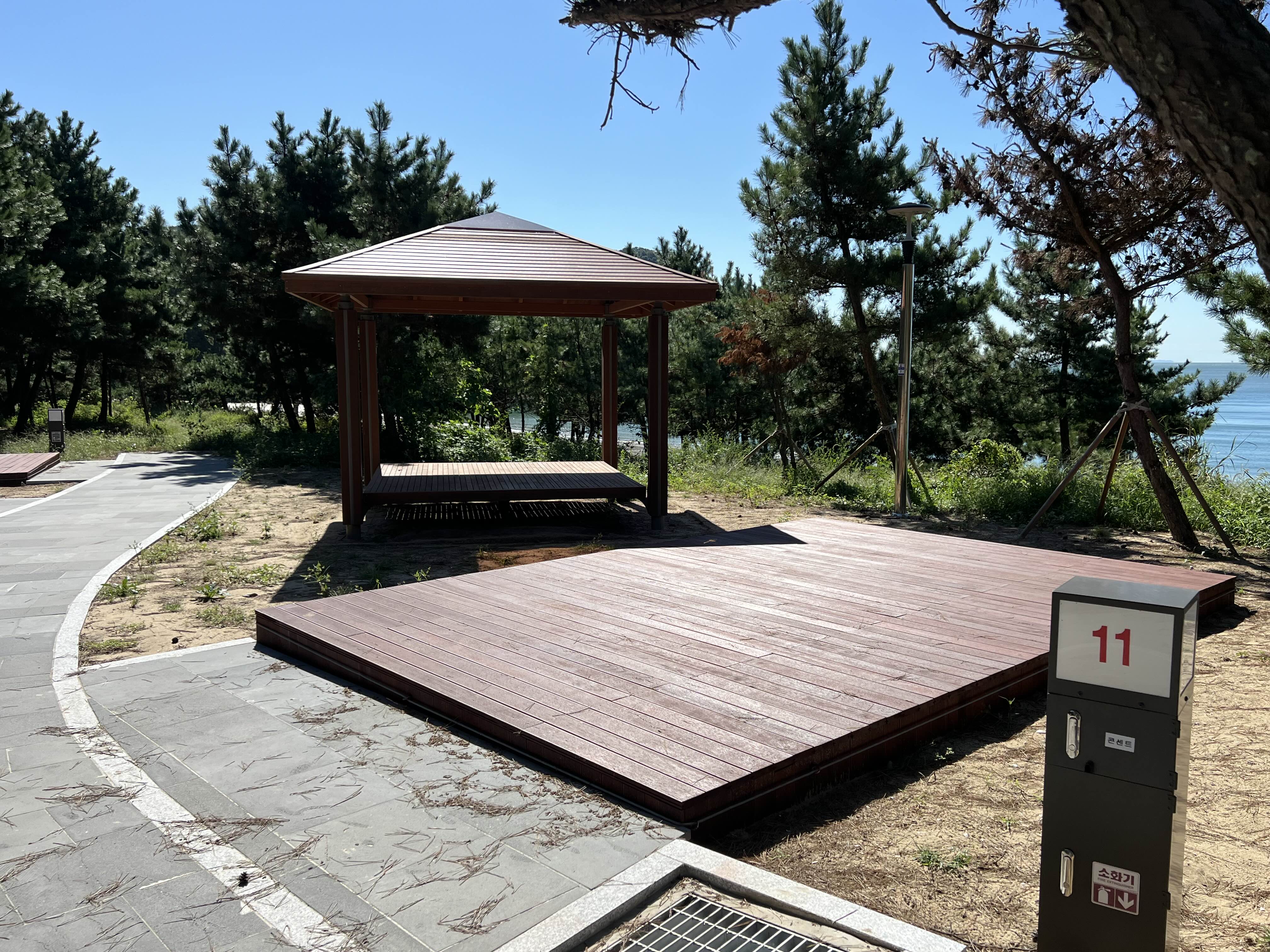 12번은 그늘이 지고 구석자리라 조용할 것 같아 좋아 보이고 11번은 바다가 잘 보이는 트인 곳이라 추천드립니다. 그리고 바로 옆에 정자도 있어서 활용할 수 있을 것 같아요. 정자도 좋고 위가 투명하게 되어 있어요. 데크도 모두 잘 되어 있어서 파손되거나 흔들리는 곳이 없습니다.
