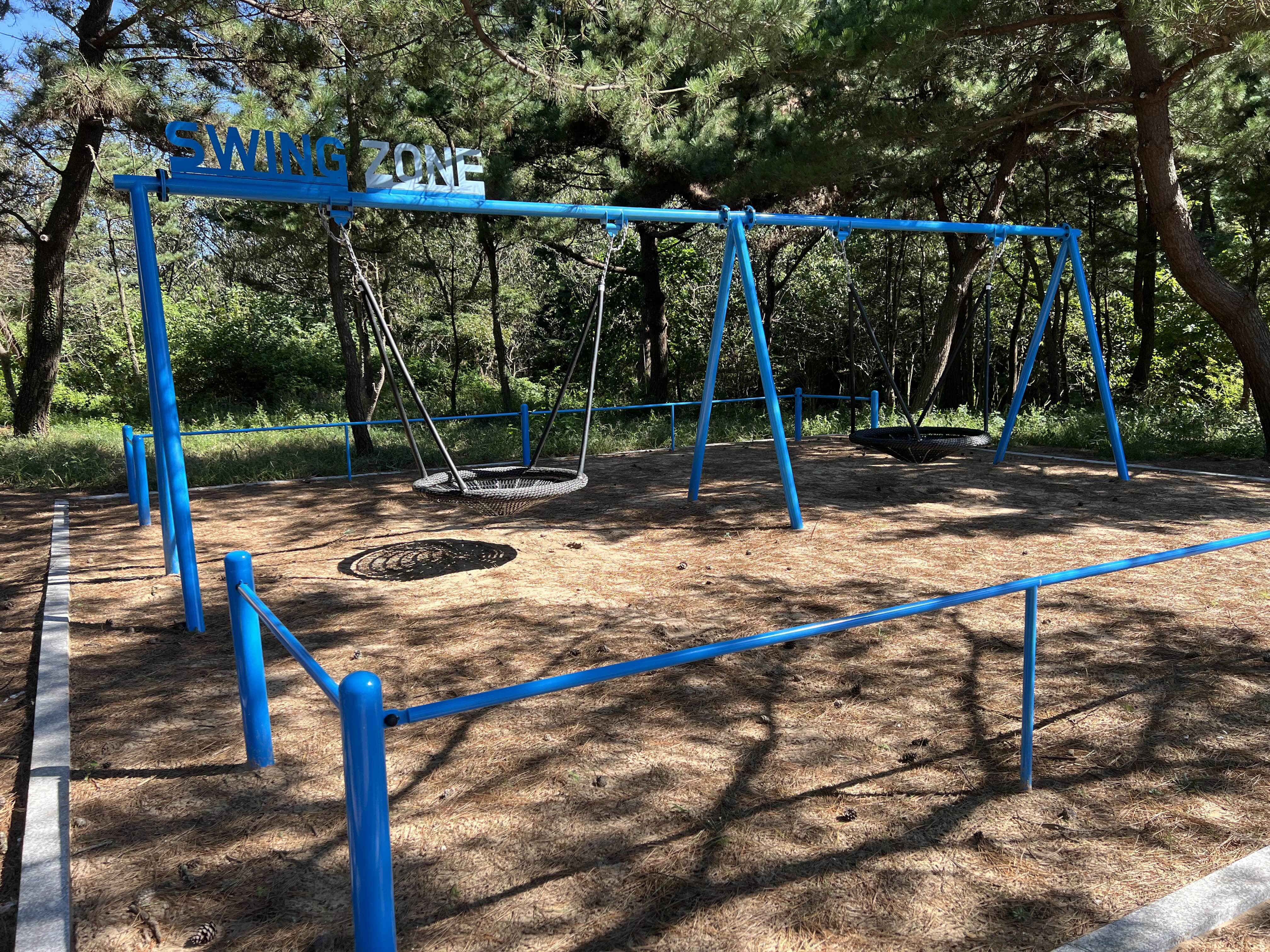 광장 주변으로 뒤쪽에도 사이트가 있어요 근데 이렇게 햇빛이 잘 들어서 안 좋을 것 같아요. 이왕이면 해변 쪽으로 자리를 잡는 것이 좋은 것 같습니다. 그리고 아이들이 놀 수 있게 그네도 있었습니다. 비교적 깨끗해서 안심하고 타도 될 것 같아요. 이렇게 조성된 지 오래되지 않아서 모든 시설이 깨끗했습니다.