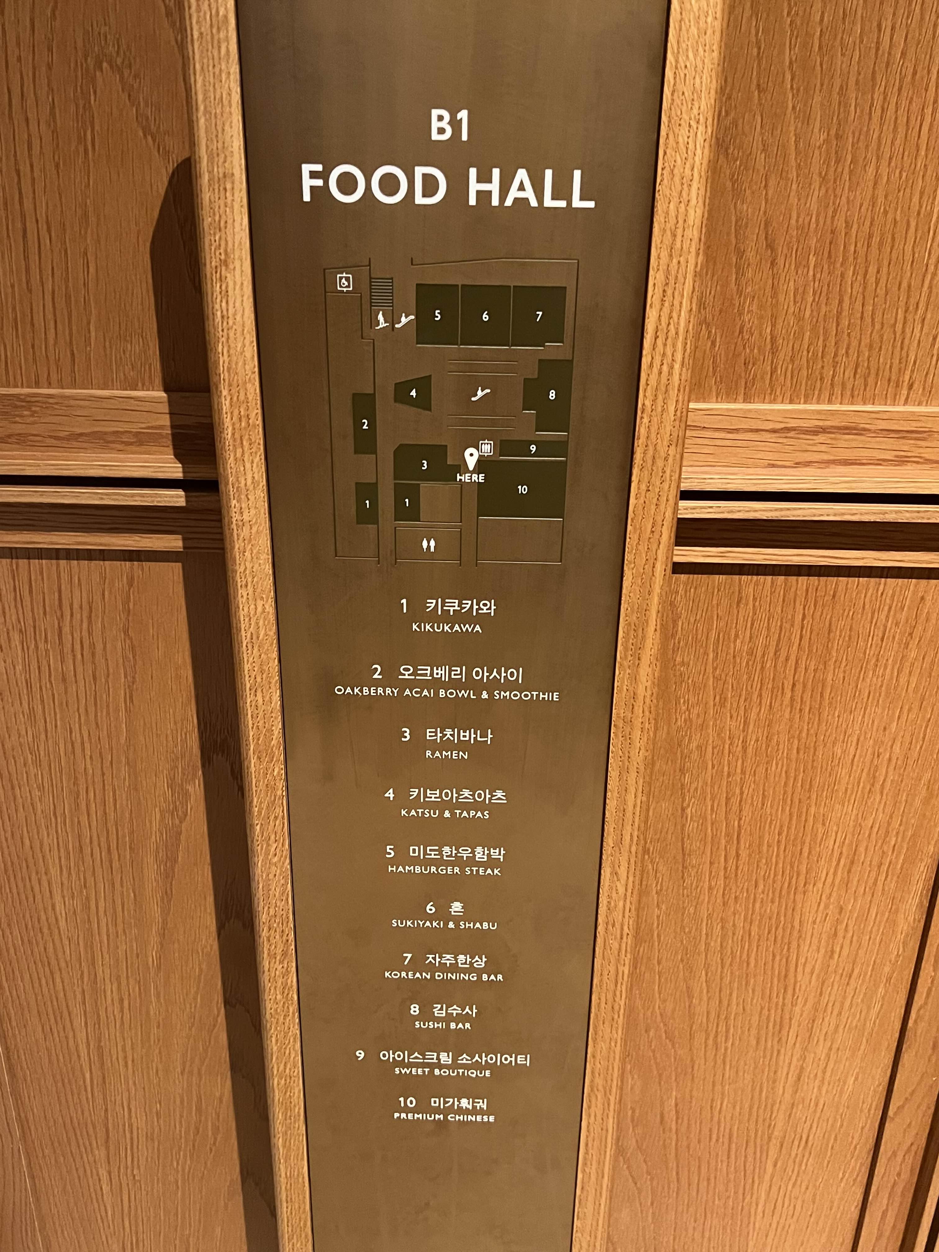 B1층에는 키쿠카와(장어덮밥집), 오크베리 아사이(디저트), 타치바나, 키보아츠아츠, 미도한우함박, 흔, 자주한상, 김수사, 아이스크림 소사이어티, 미가훠궈가 있습니다.