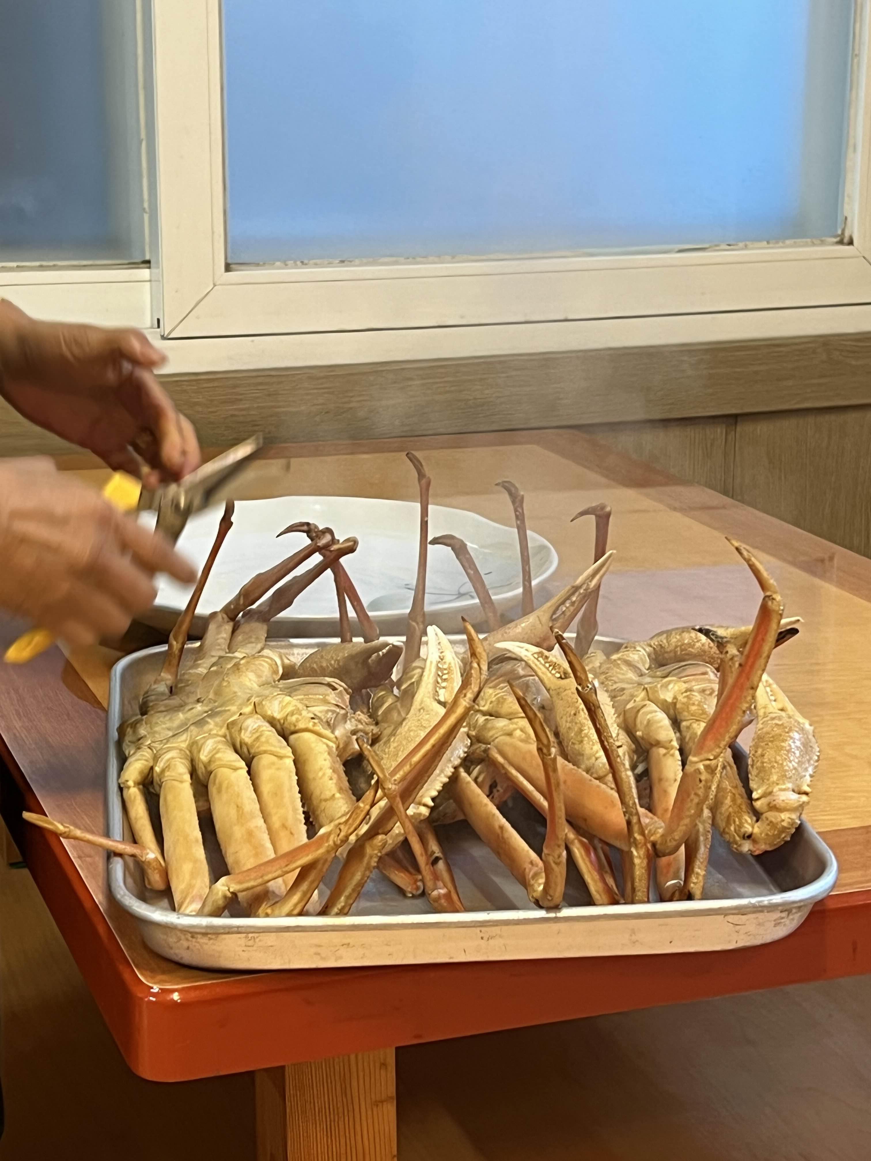 대게가 익혀지면 아주머니가 쟁반에 대게를 잘라서 먹기 좋게 손질해 주십니다. 대게살이 쏙 나와있어서 물고 빼면 쏙 하고 나와요! 앞에서 보기 좋게 손질해 주셔서 바로 먹고 싶어 집니다.