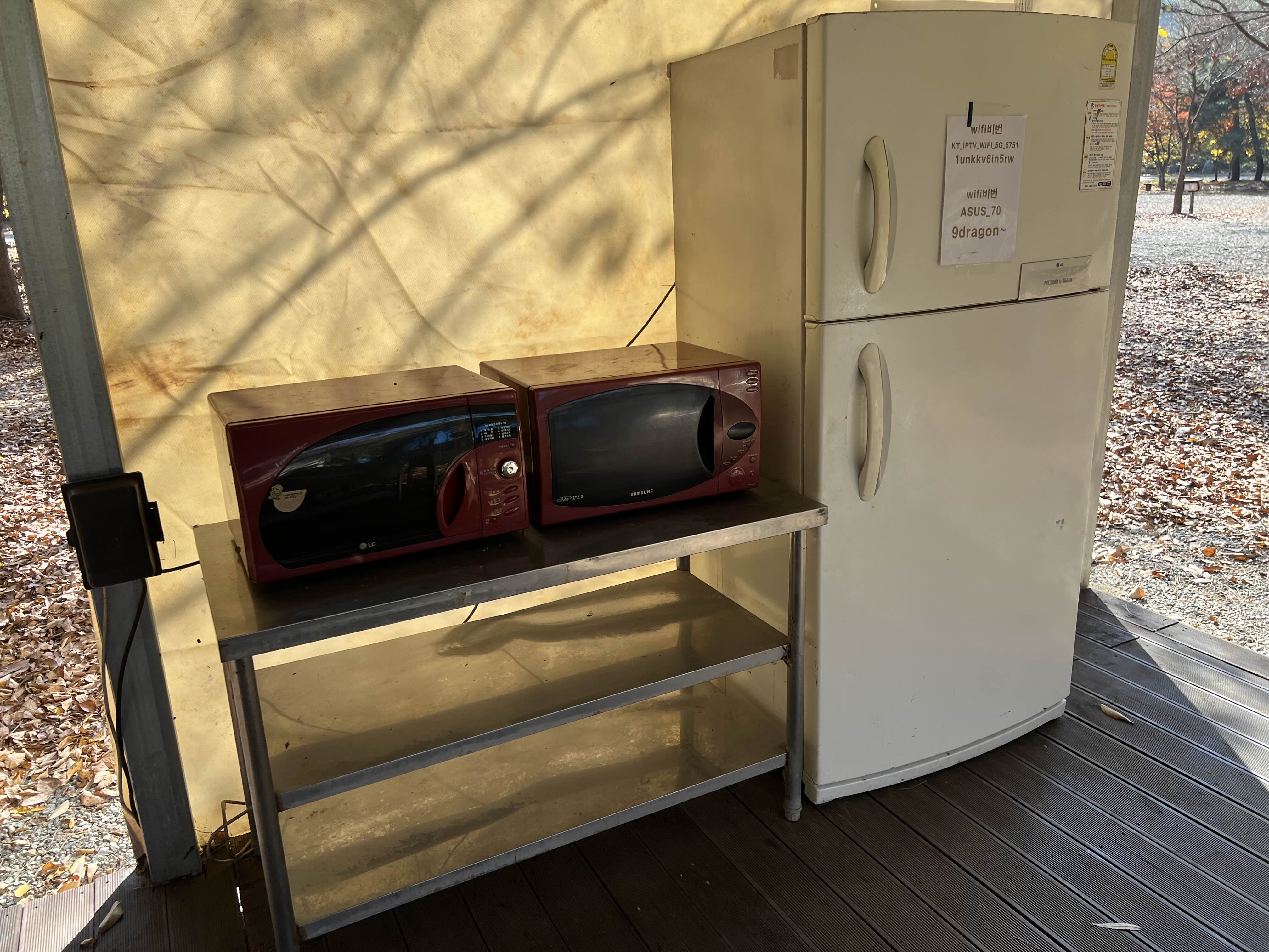 전자렌지가 있어서 햇반이나 간단한 조리는 할 수 있습니다. 냉장고도 있어서 저희는 오자마자 술이나 맥주를 냉동실에 넣어놨습니다. 야외에 있어서 그런지 다 그렇게 깨끗한 상태는 아닙니다.