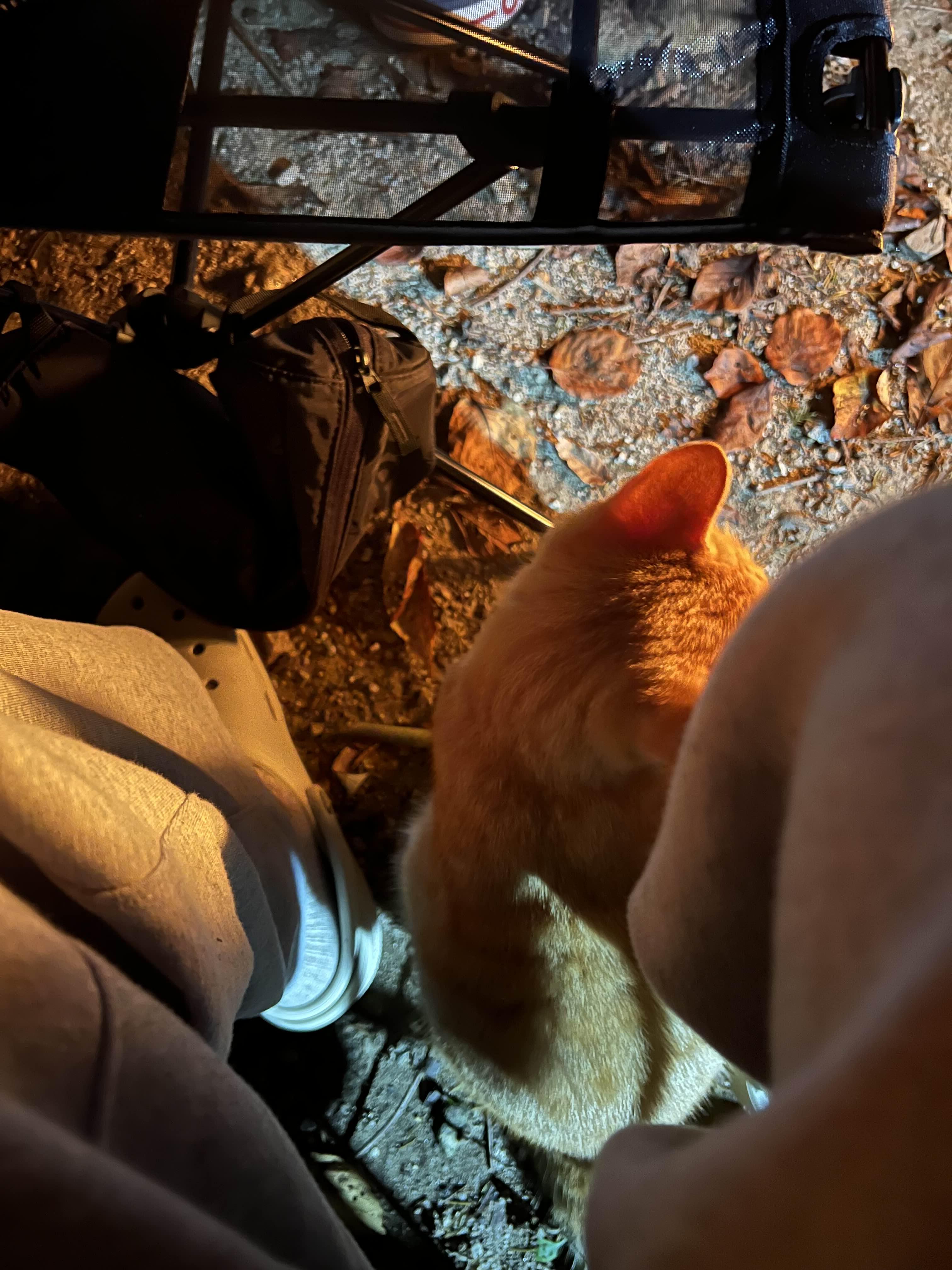 저랑 같이 불 쬐는 고양이 너무 귀엽지 않나요? 고양이랑 같이 힐링하는 시간이었습니다. 어둡고 해서 장작은 다 안쓰고 잤습니다. 새벽에 비예보가 있어서 짐은 모두 안에 들여다 놓고 잤습니다.