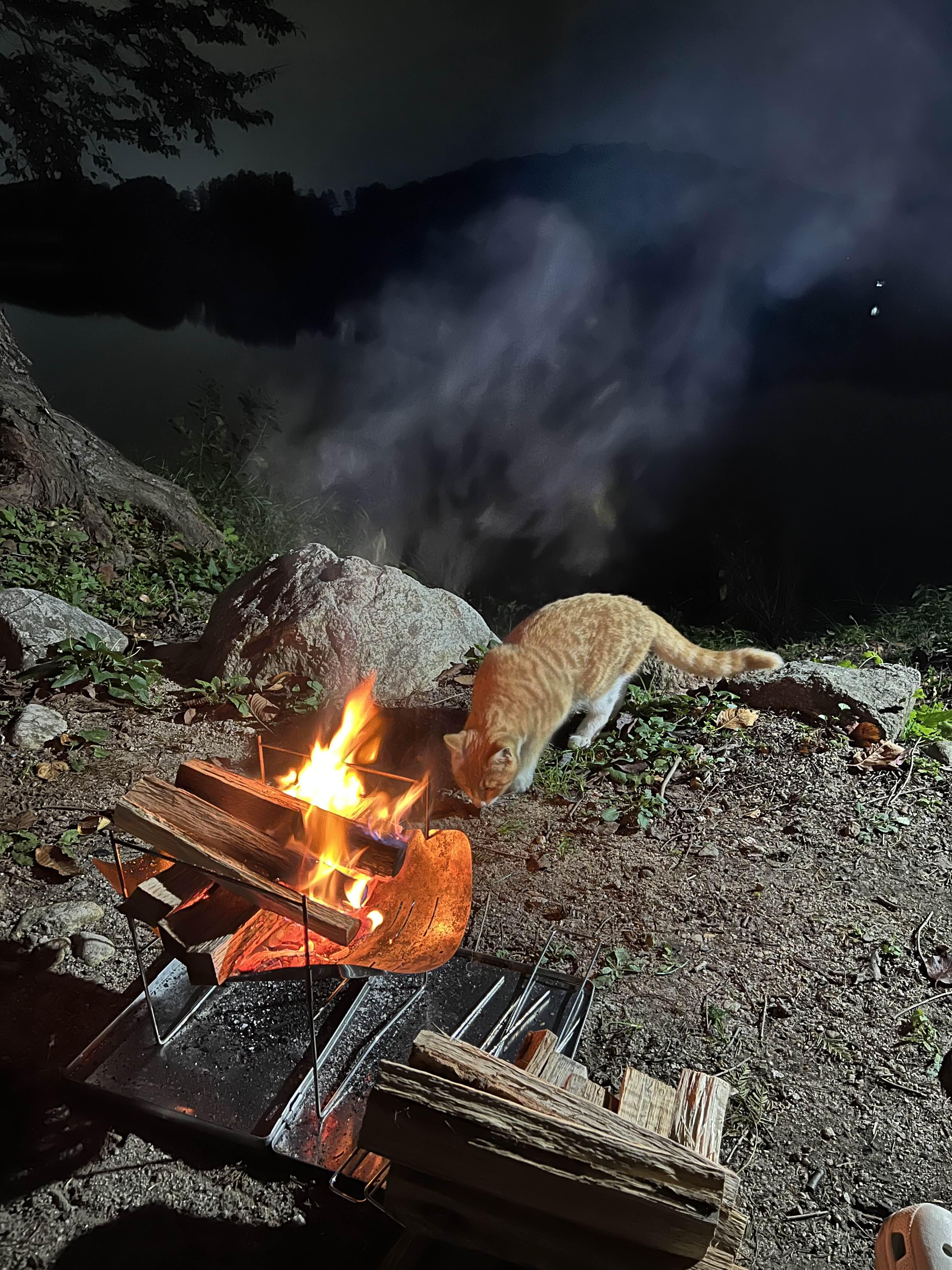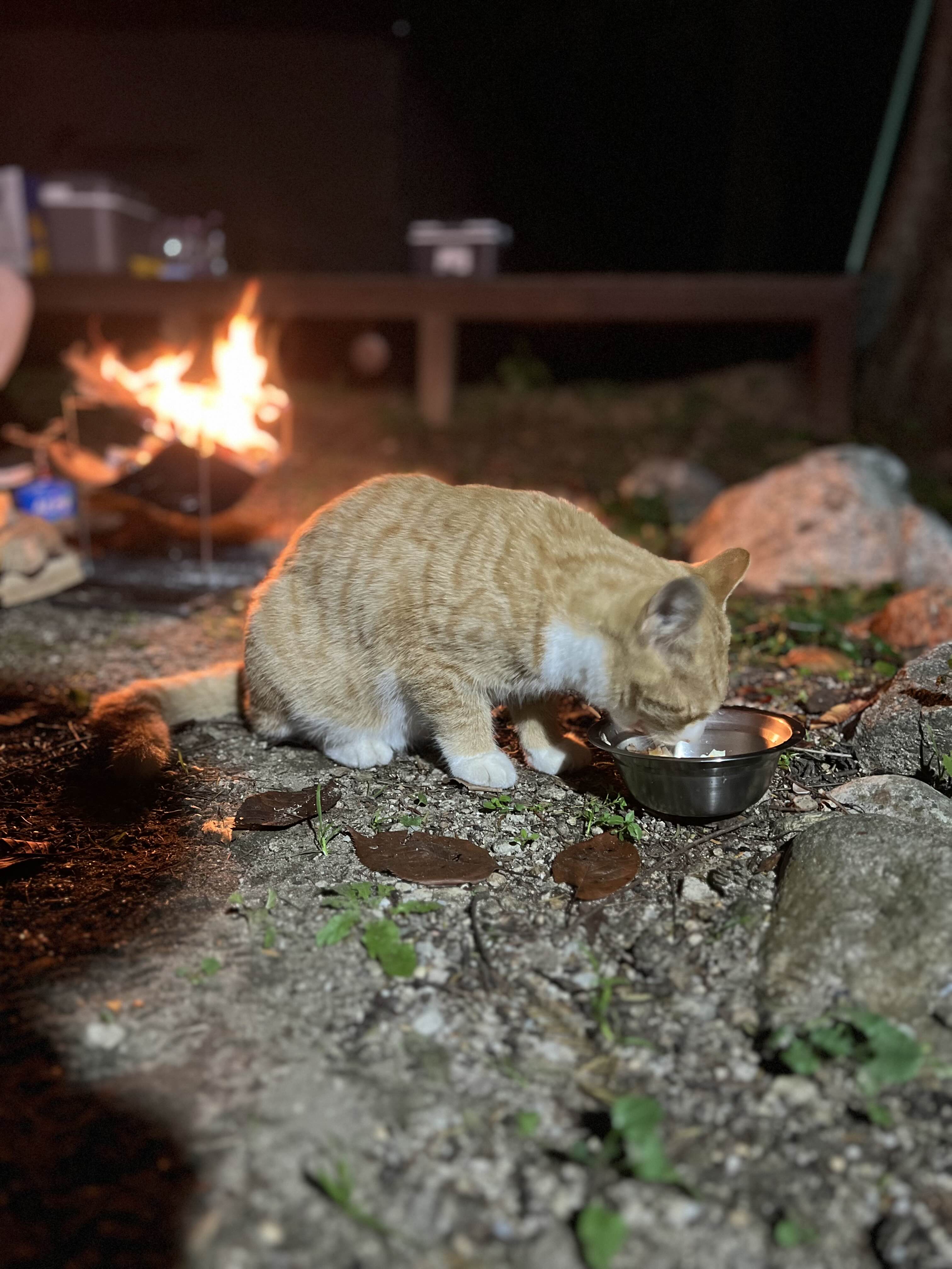 밤에는 쥐 죽은 듯이 조용했고, 저수지도 거울처럼 반사가 되었어요. 아쉽게도 달이 뜨지 않아서 달은 볼 수 없었지만 별은 많이 볼 수 있었습니다. 타닥타닥 장작타는 소리만 들리고 음악을 잔잔하게 깔아놓으니 너무 분위기가 있더라고요. 그리고 어디선가 고양이가 나타나서 엄청 애교를 부려서 고양이한테 빠져버렸어요. 물을 주었더니 허겁지겁 먹어서 어묵이랑 계란을 삶아서 주었더니 그것도 코를 박고 먹더라고요 ㅠ 엄청 배고팠던 듯…