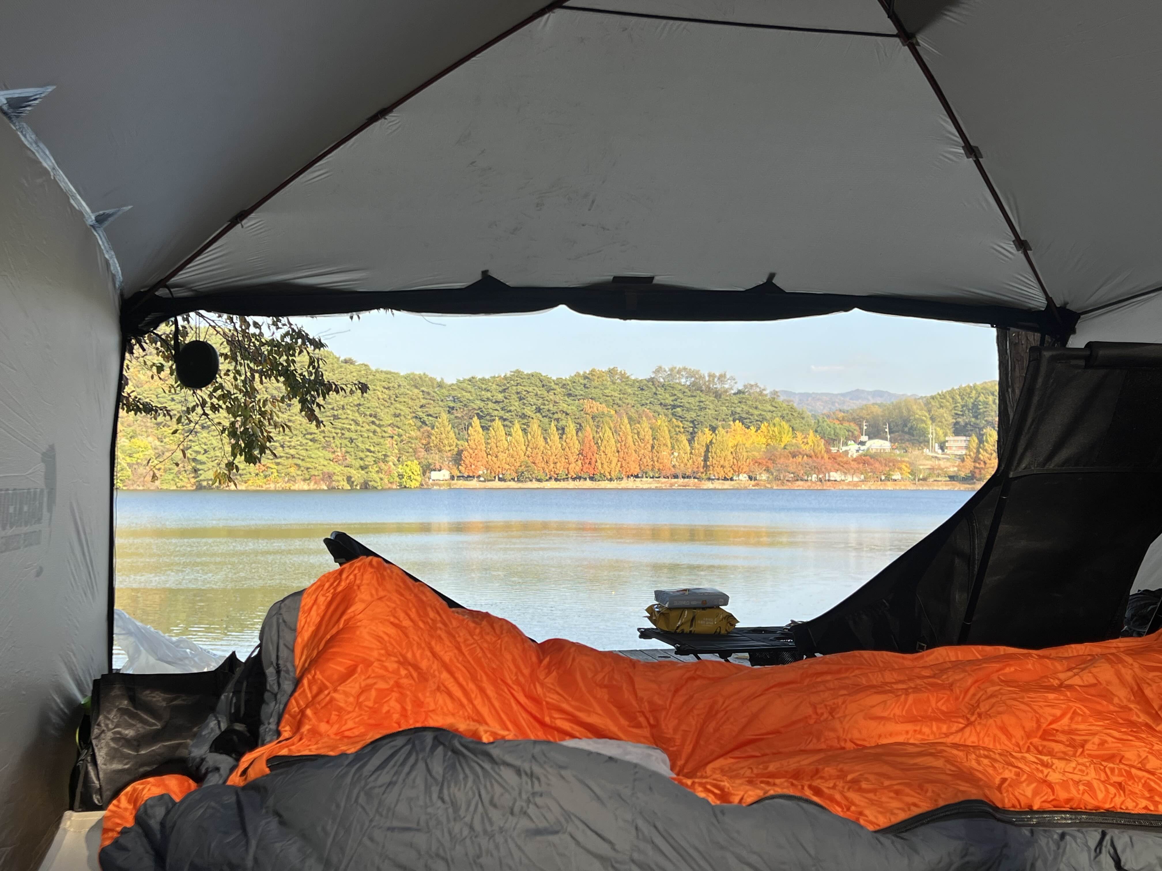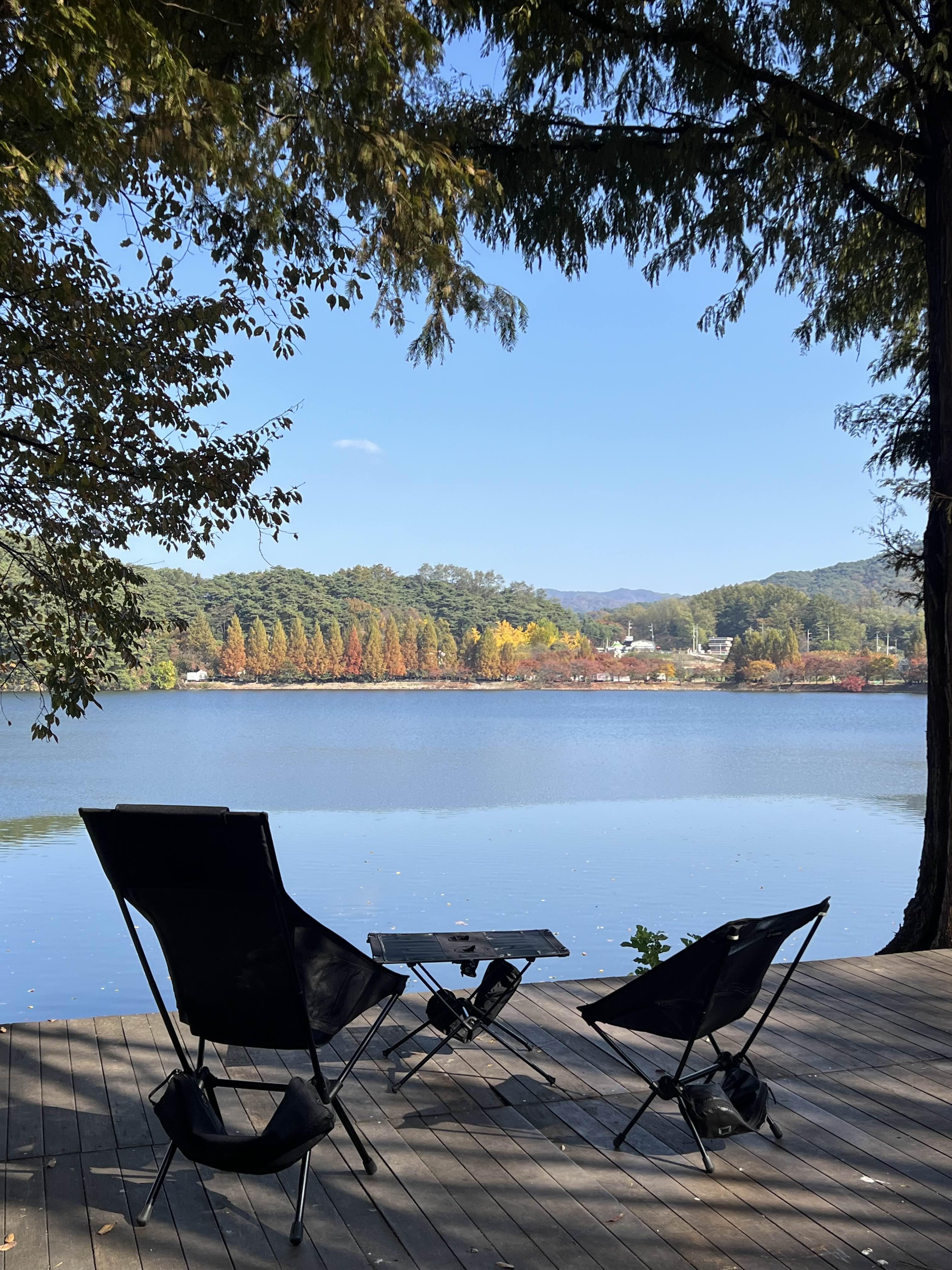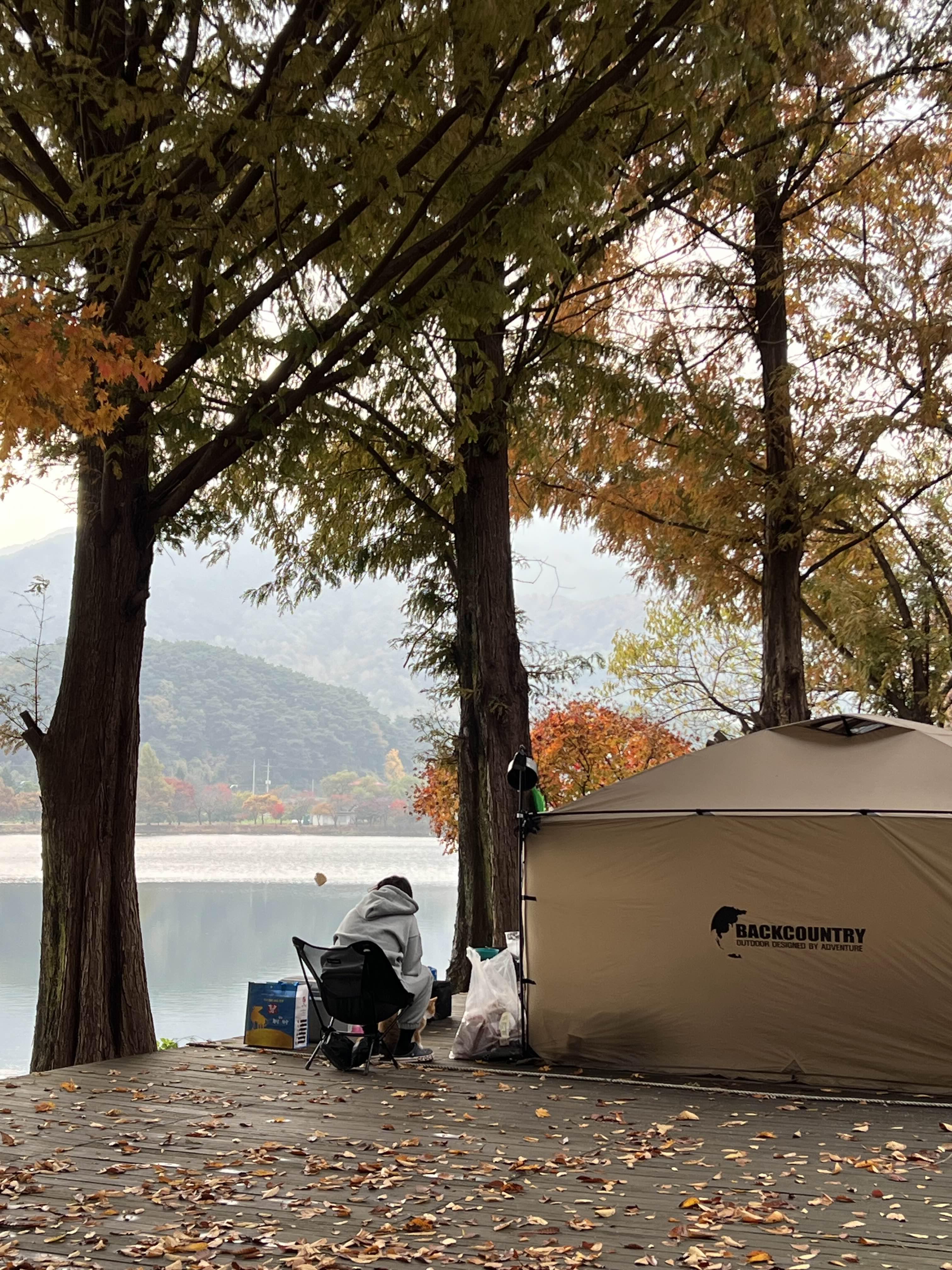 11월 초에 단풍이 마지막 일 것 같아서 급하게 예약하고 캠핑을 다녀왔습니다. 다른 가을 캠핑장이 많은데 저희는 원주에 있는 구룡레저타운으로 가기로 했습니다. 저희가 이 곳으로 정한 이유는 호수뷰가 있기 때문입니다. 정확히 말하면 호수가 아니고 저수지입니다. 이름은 학곡저수지고 맞은편에 삼나무와 산들이 아름다워서 다른 캠핑장보다 더 매력적으로 보였습니다.