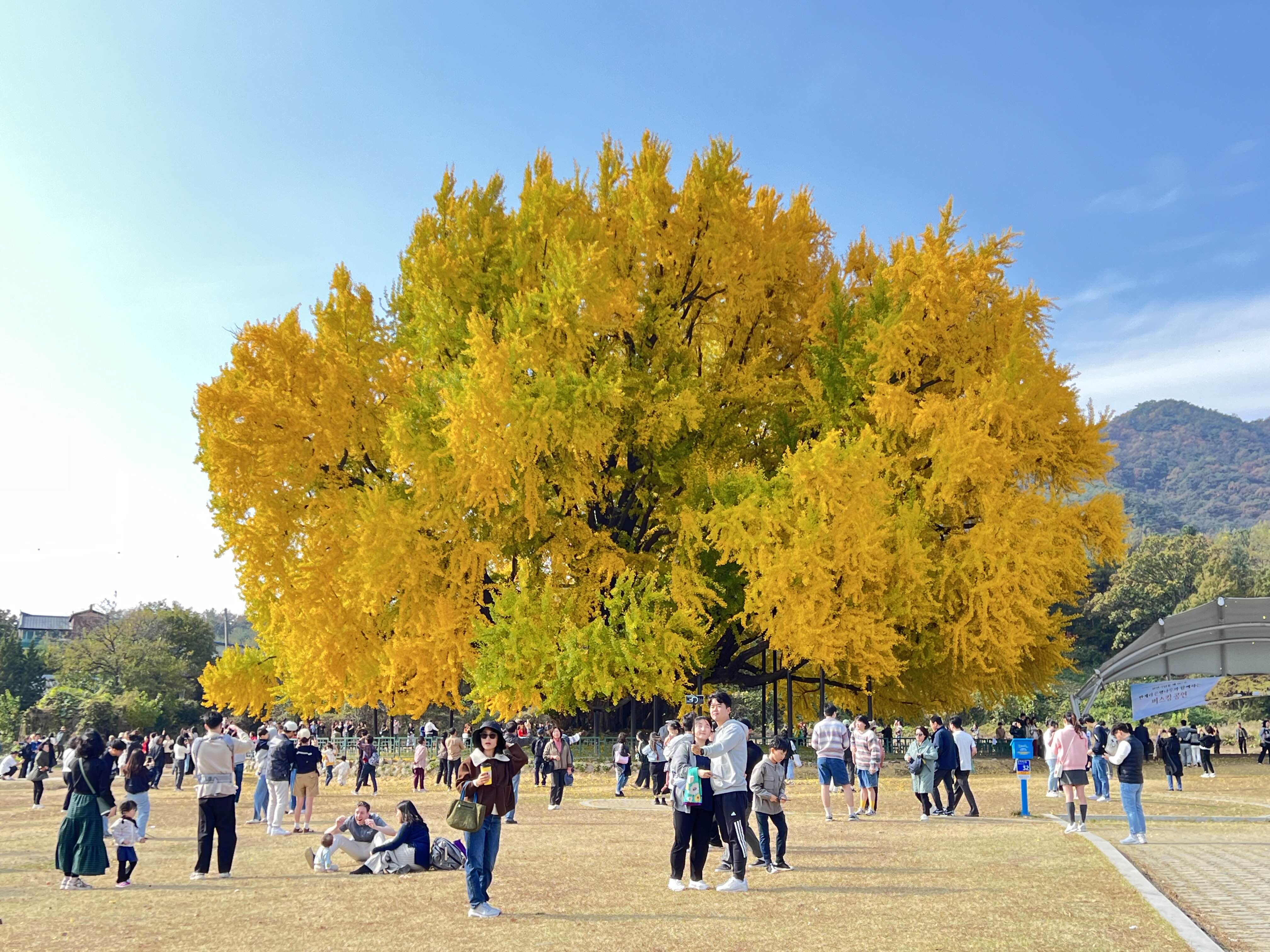 햇빛이 마주 보고 사진을 찍는 것이 노랗게 잘 나오는 것 같아요. 한 바퀴 돌면서 잘 나오는 곳을 찾았습니다. 근데 나무가 정말 커서 다 담으려면 꽤 멀리서 찍어야 하더라고요. 가까이서 찍으면 나무가 다 안 나와요;;