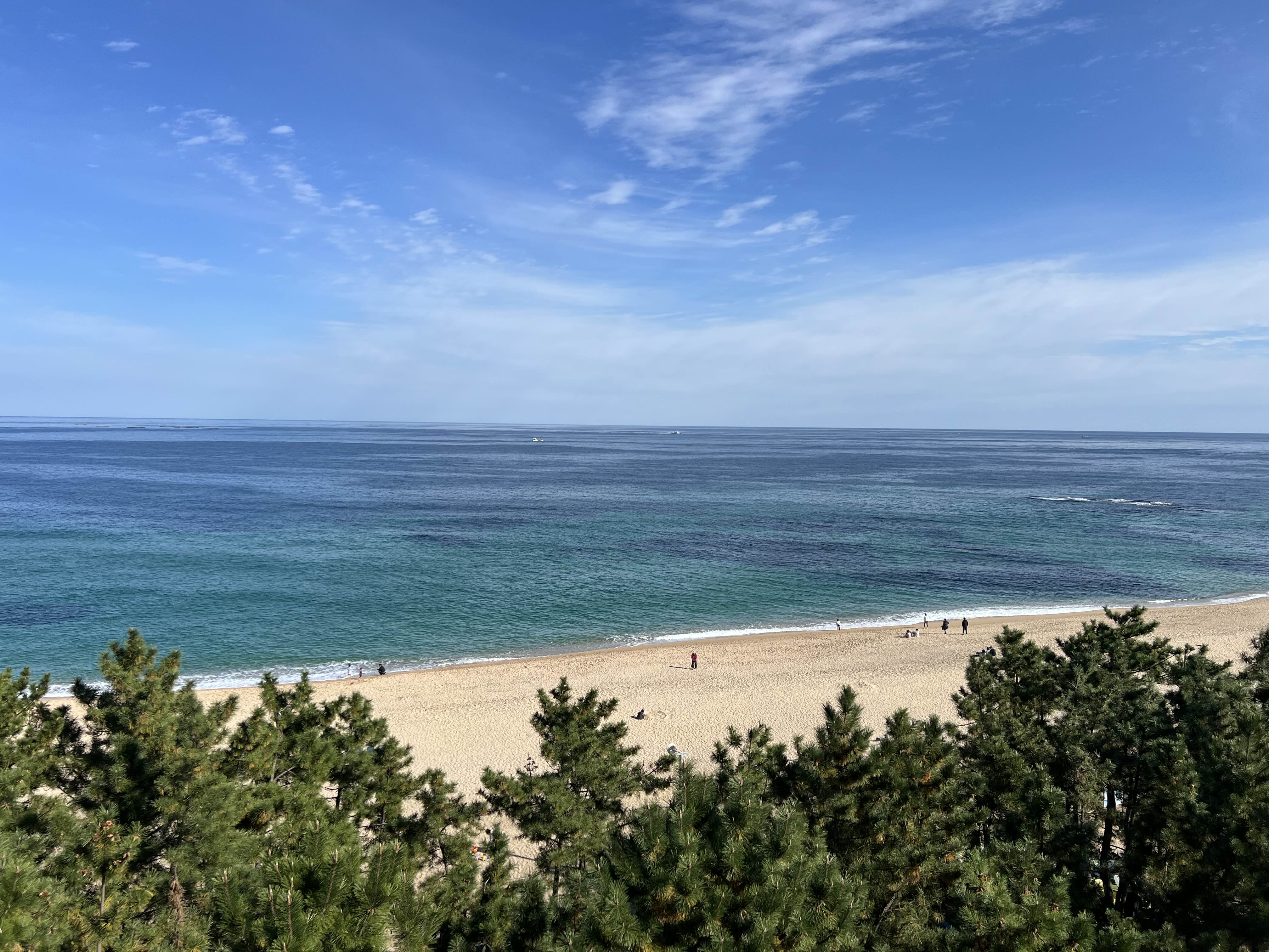 바다정원이라는 카페인데 건물도 5층까지 있어서 바다도 보이고, 1층 해변에는 소나무숲이 있어서 그 아래서 바다도 보고 커피도 마실 수 있어서 좋았습니다.