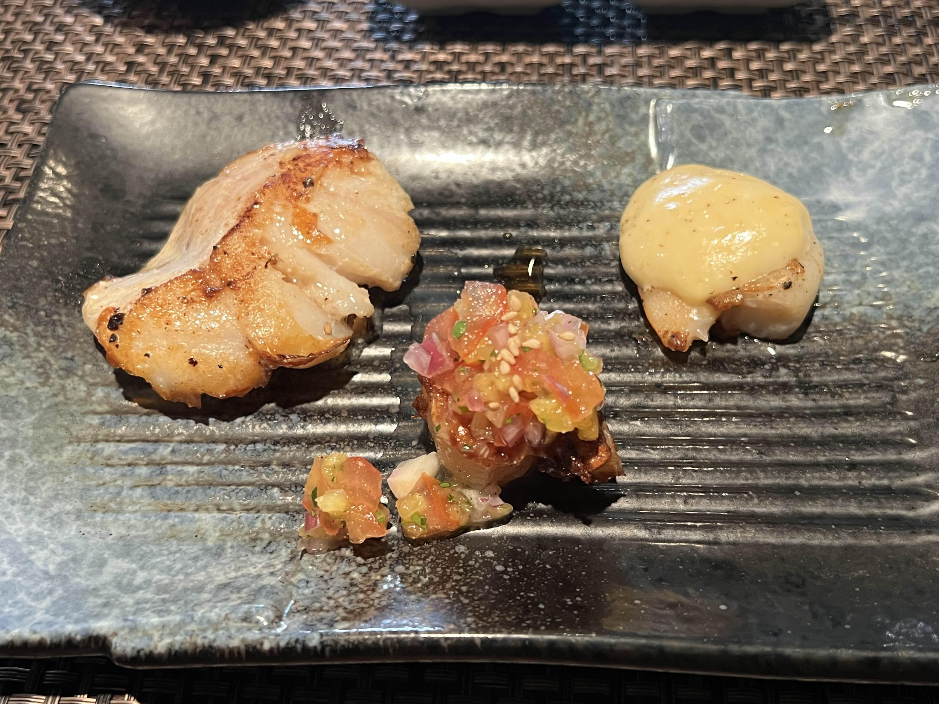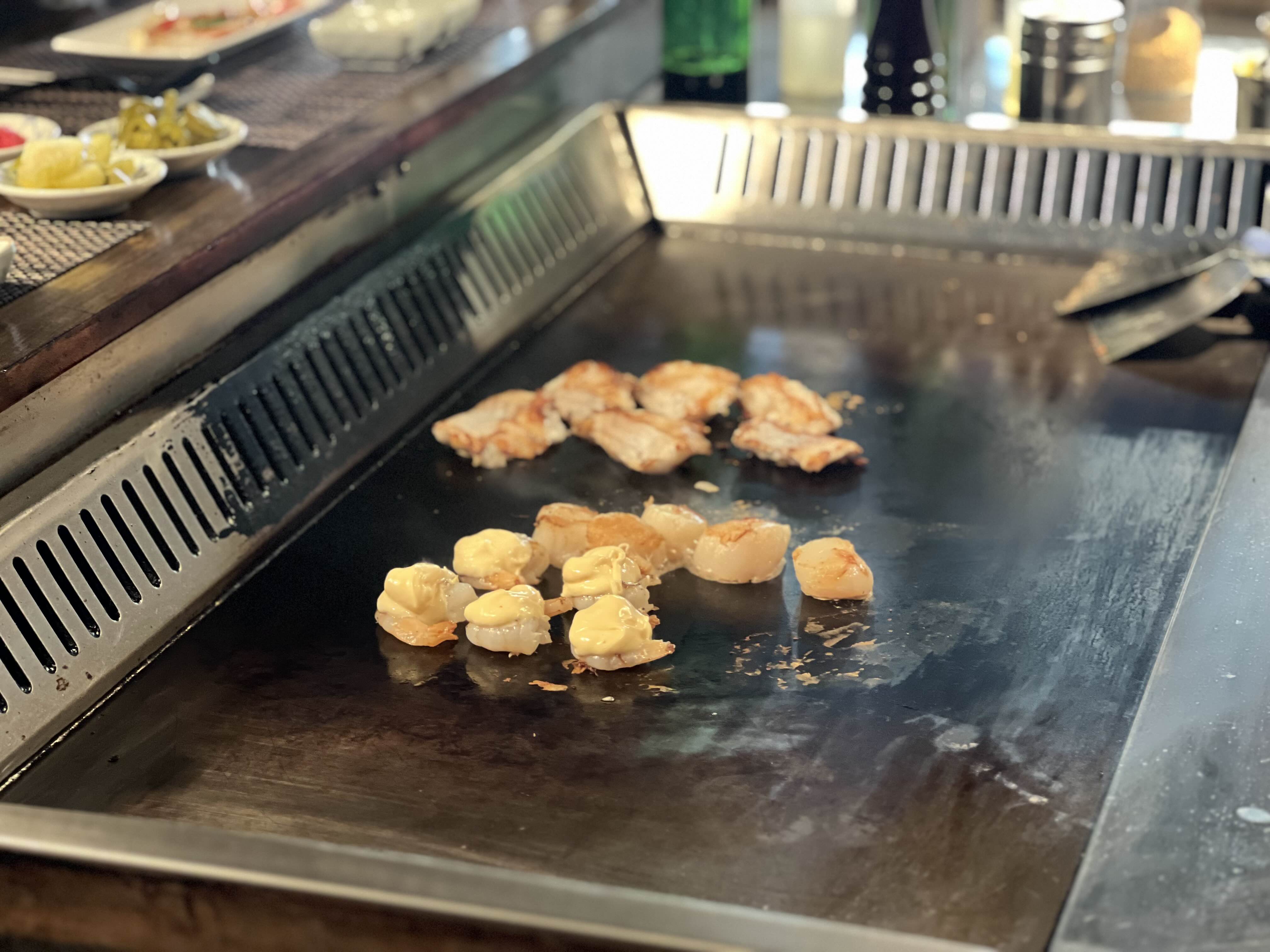 본격적으로 흰살 생선, 새우, 관자가 올려지고 버터를 녹여 같이 요리해주셨는데 냄새가 장난 아니었습니다. 보고만 있어도 식욕이 끌어올려지는 느낌이었습니다. 새우위에는 소스를 듬뿍 올려주셨습니다. 철판에 구우니까 더 맛있게 느껴지는 것 같아요. 눈으로 먹고 코로 맡으면서도 먹고, 나중에는 입으로 먹는 것 같습니다.