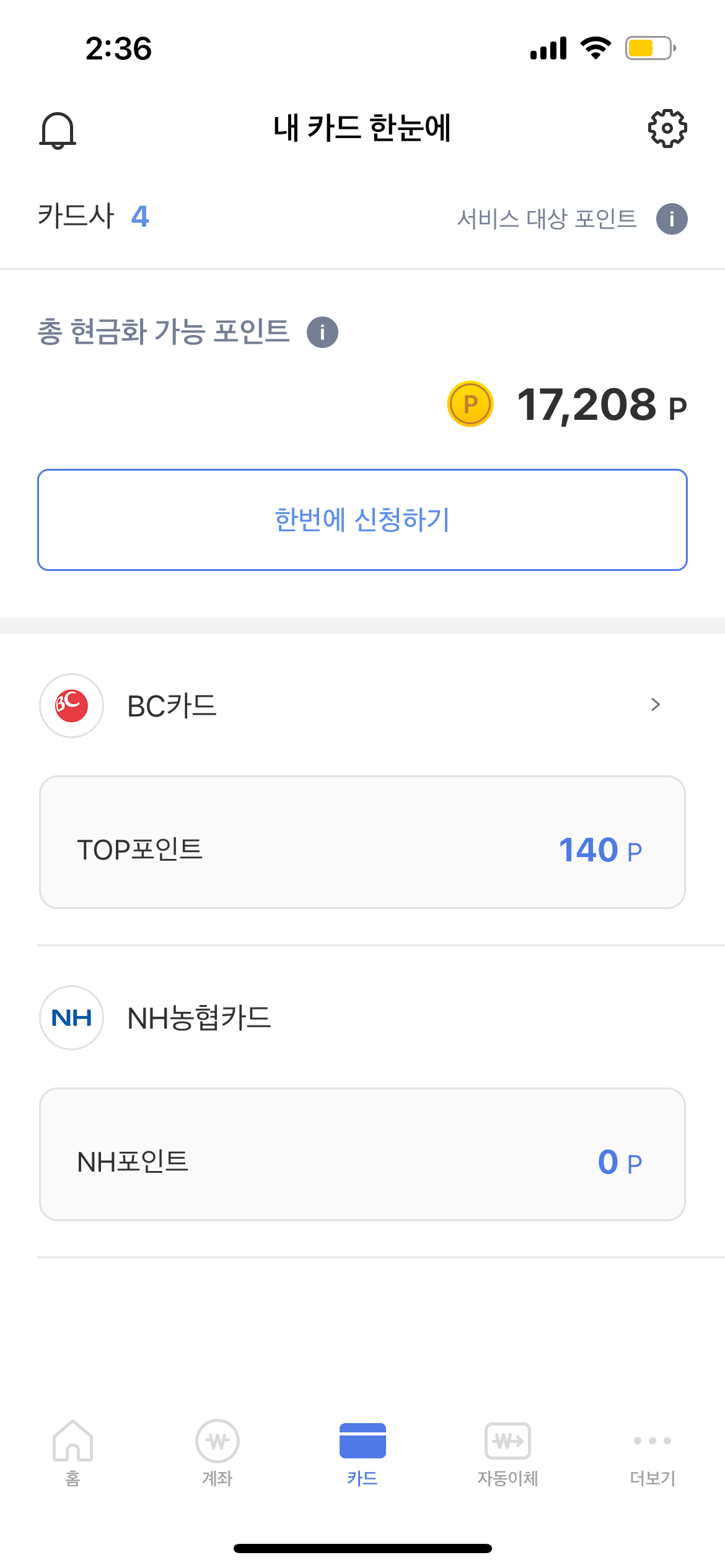 인증하여 로그인해보면 내가 가지고 있는 카드포인트를 모두 보여준다. 이를 모두 한번에 신청하기를 누르면 가지고 있는 포인트를 모두 현금화하여 나의 통장에 넣어준다! 괜히 꽁돈이 생긴 느낌이다. 포인트가 많이 쌓여 있다면 10만원 이상도 챙겨갈 수 있다! 포인트를 썩히지 말고 현금화해서 더 좋은 곳에 사용하도록 하자!