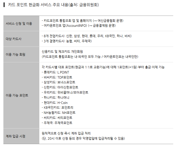 카드포인트 현금화 비율은 1포인트=1원이고, 1원부터 계좌입금이 가능하다. 포인트 조회는 24시간 365일 가능하고, 계좌 입금은 23:30~00:30까지는 불가하다.
